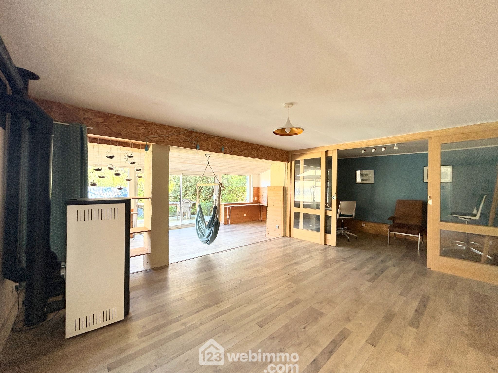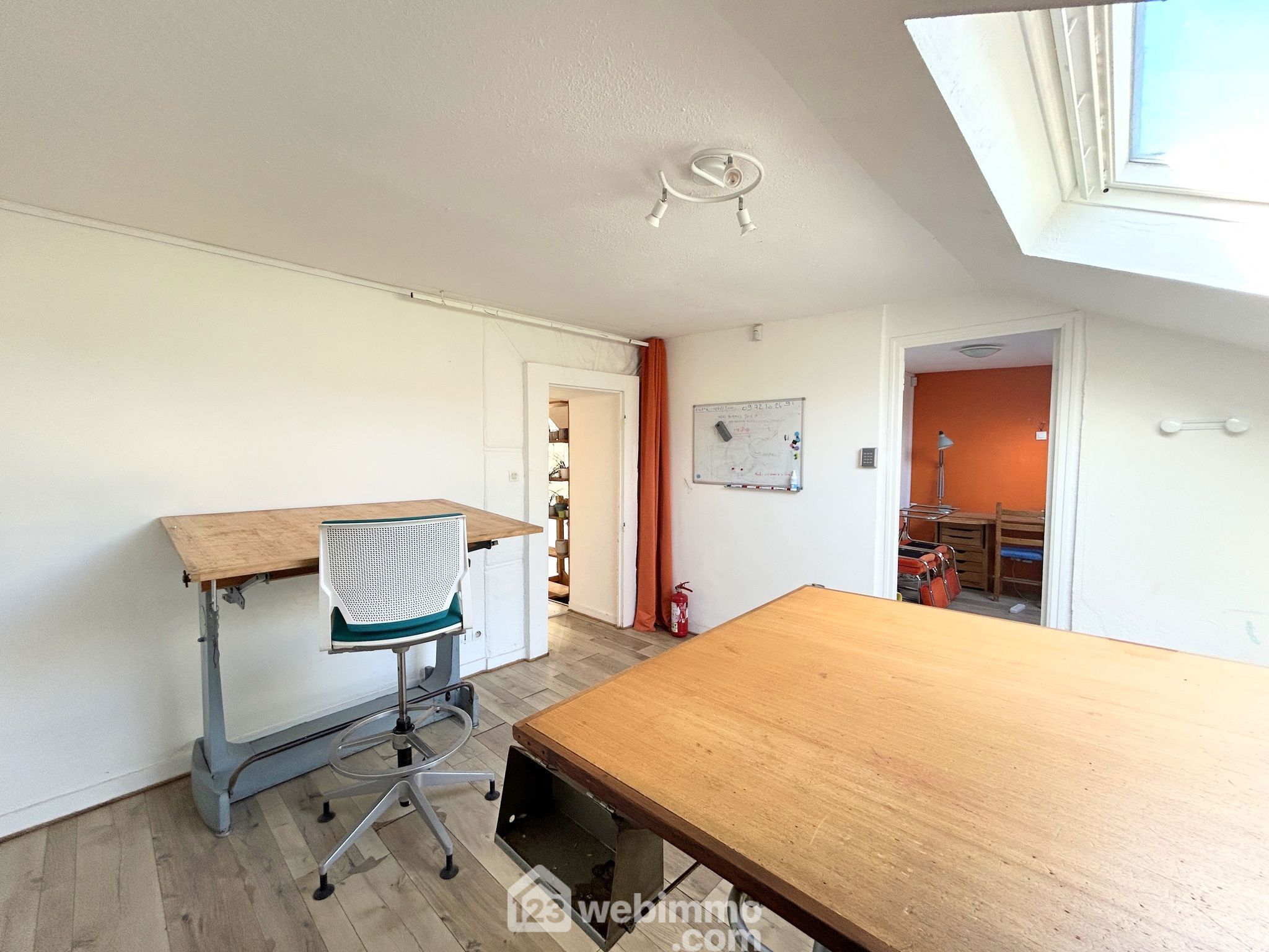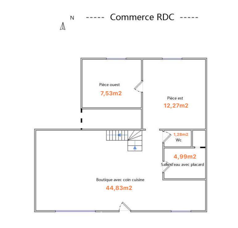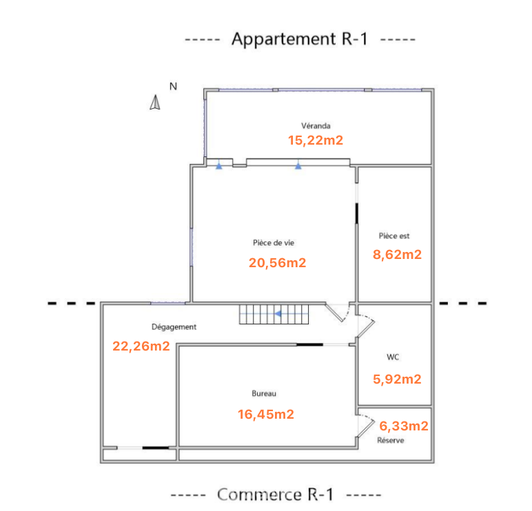 Le rez-de-chaussée se compose d’une pièce principale lumineuse de 44 m², idéale pour un espace de vente ou d’accueil, ouverte sur une cuisine aménageable. Vous y trouverez également une salle d’eau, un WC séparé et deux bureaux modulables selon vos besoins.