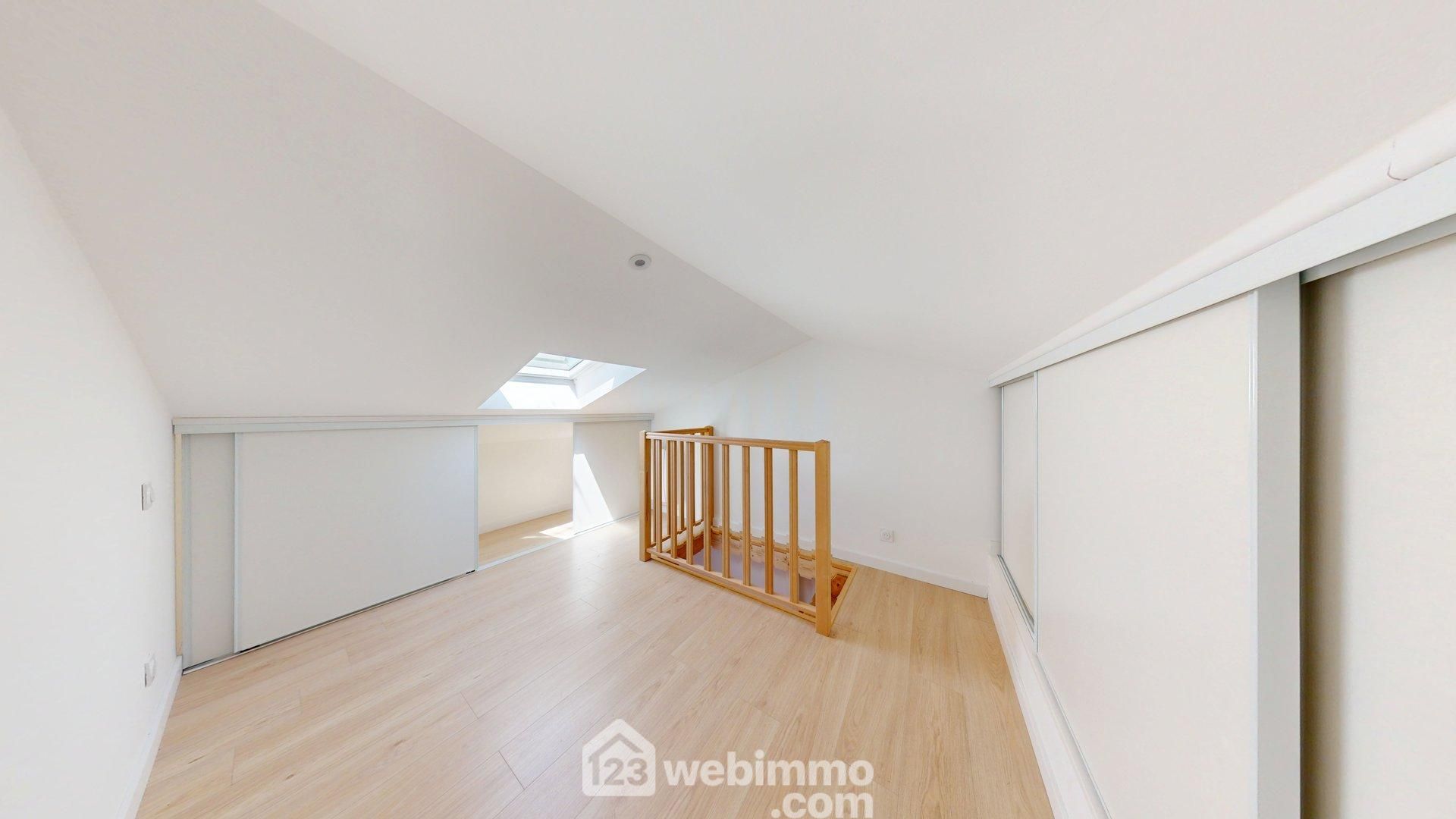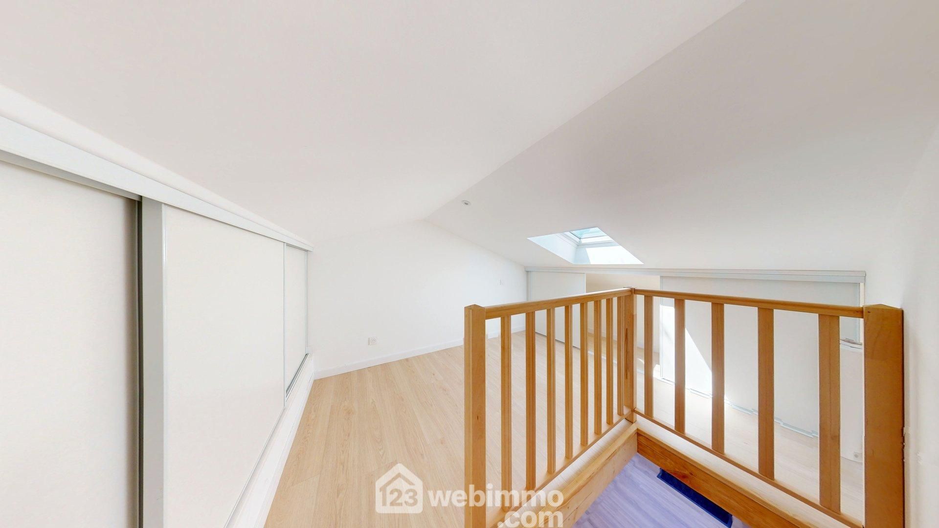 Côté nuit, une mezzanine accueillante de 11 m² (au sol) abrite un espace chambre avec plusieurs rangements intégrés. La salle d’eau est fonctionnelle, avec douche et vasque. WC séparés.