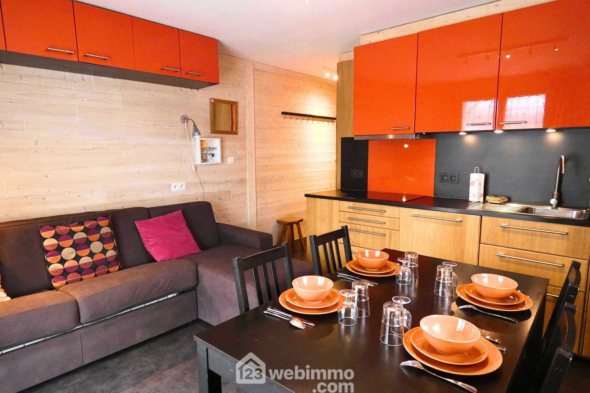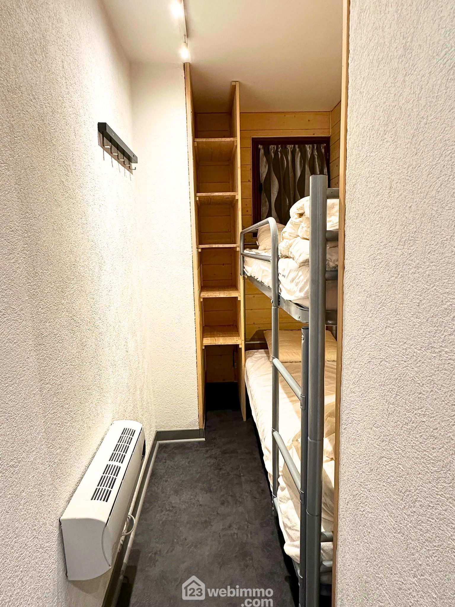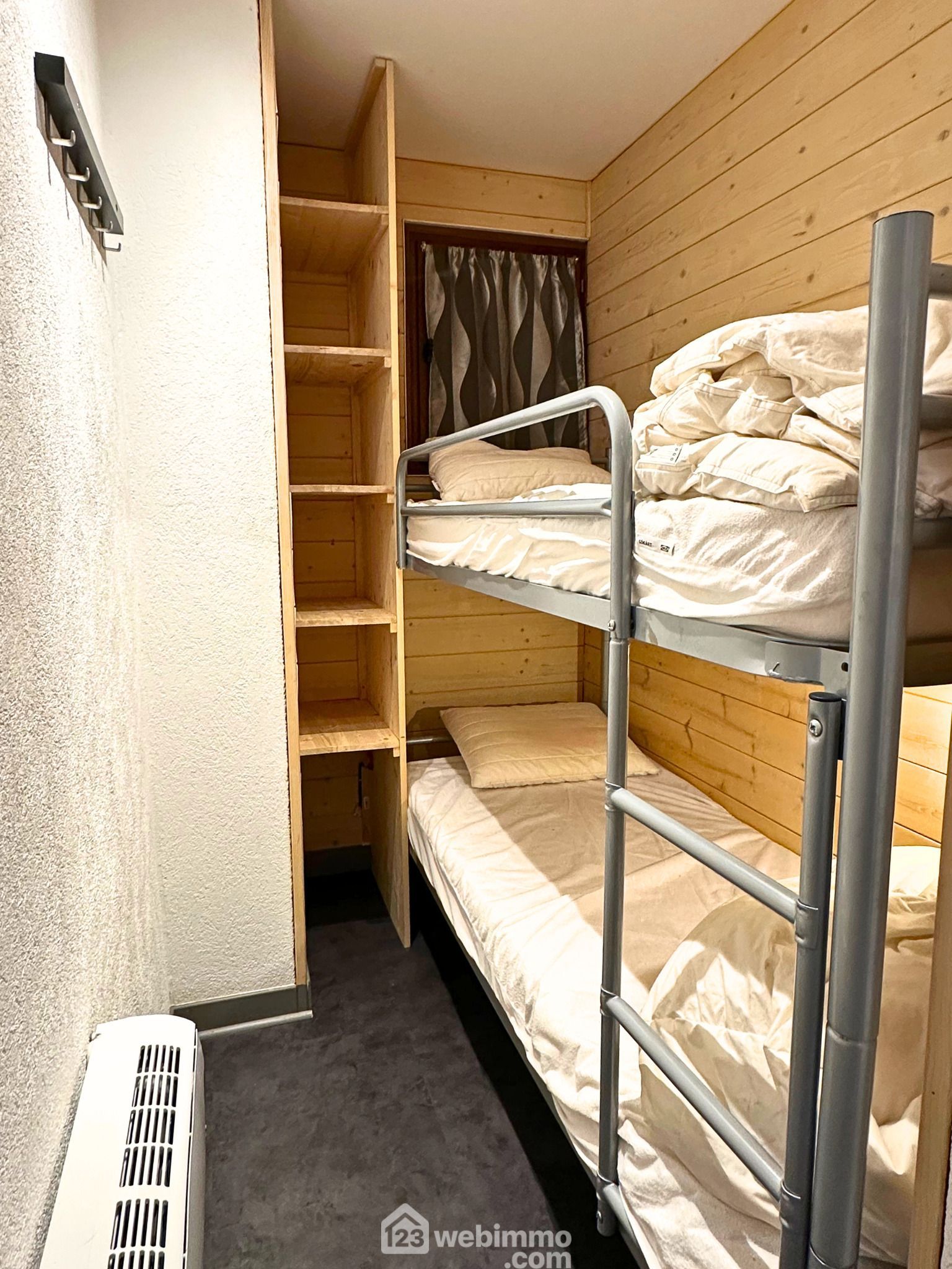 Situé en rez-de-chaussée, ce studio cabine propose un agencement optimisé, pensé pour allier confort et fonctionnalité. L’entrée dessert un coin cabine avec lits superposés offrant deux couchages, une salle de bain avec WC, ainsi qu’une pièce de vie avec une cuisine entièrement équipée (four combiné micro-onde, lave-vaisselle, plaque à induction quatre feux ...) formant un espace convivial et agréable à vivre.