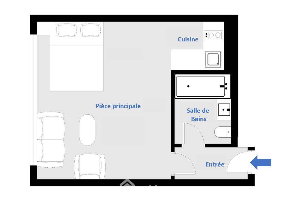 Agencement : Entrée, salle de bains-wc et pièce principale avec espace cuisine (18,85 m²) donnant sur une large baie vitrée (double vitrage) avec une vue dégagée.