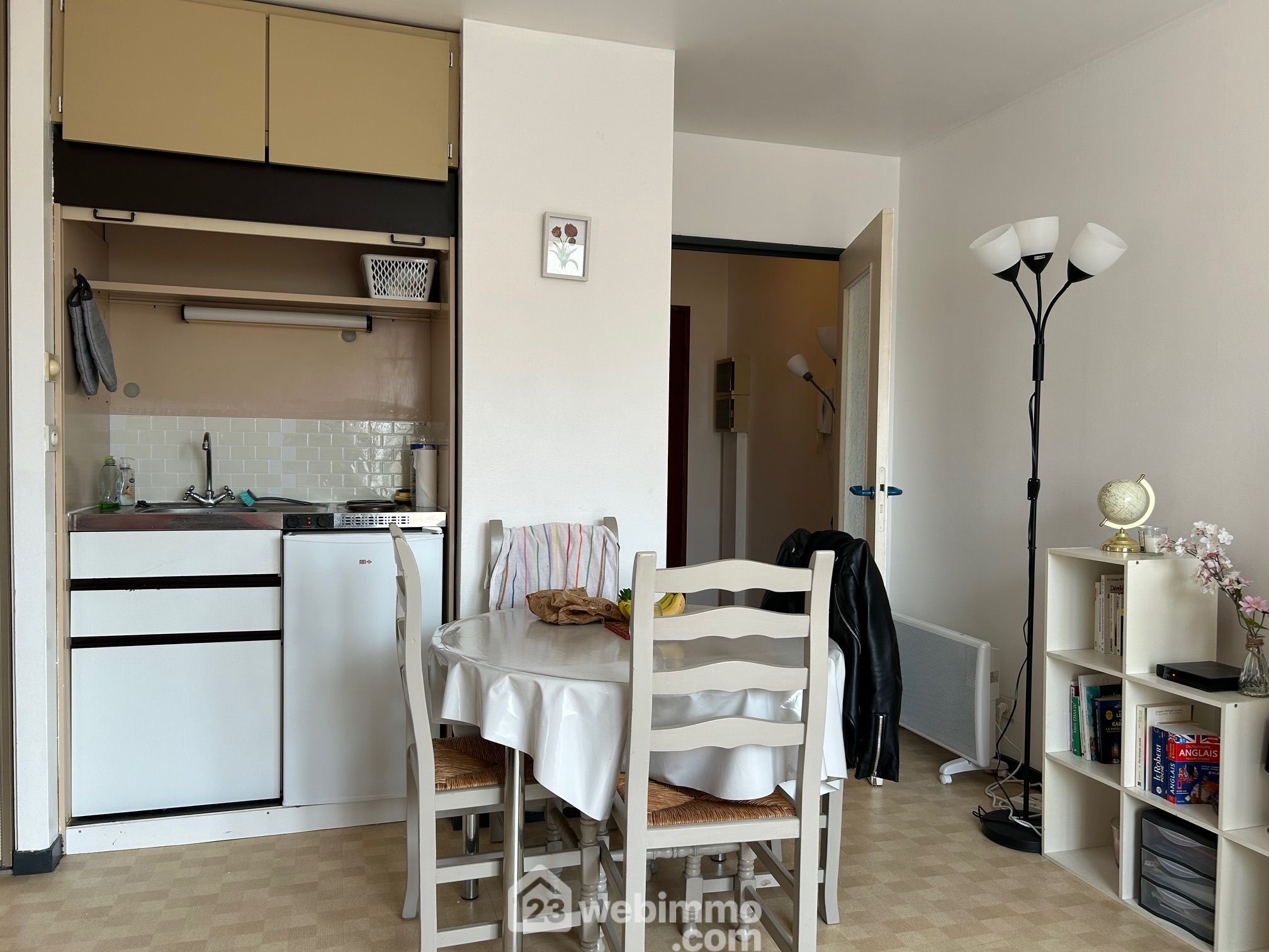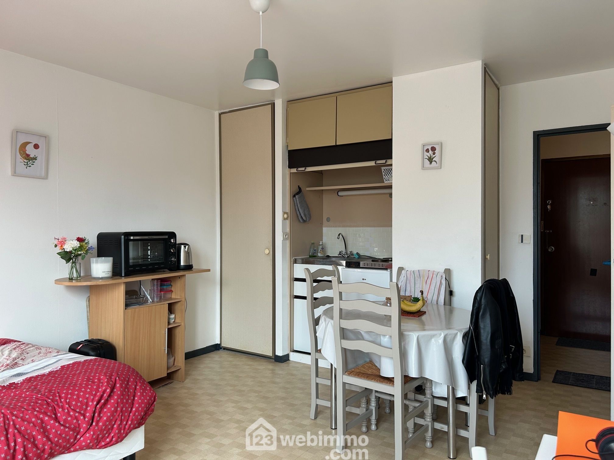 Entrée avec placard, pièce de vie avec placards, kitchenette et coin nuit, salle d'eau avec WC.