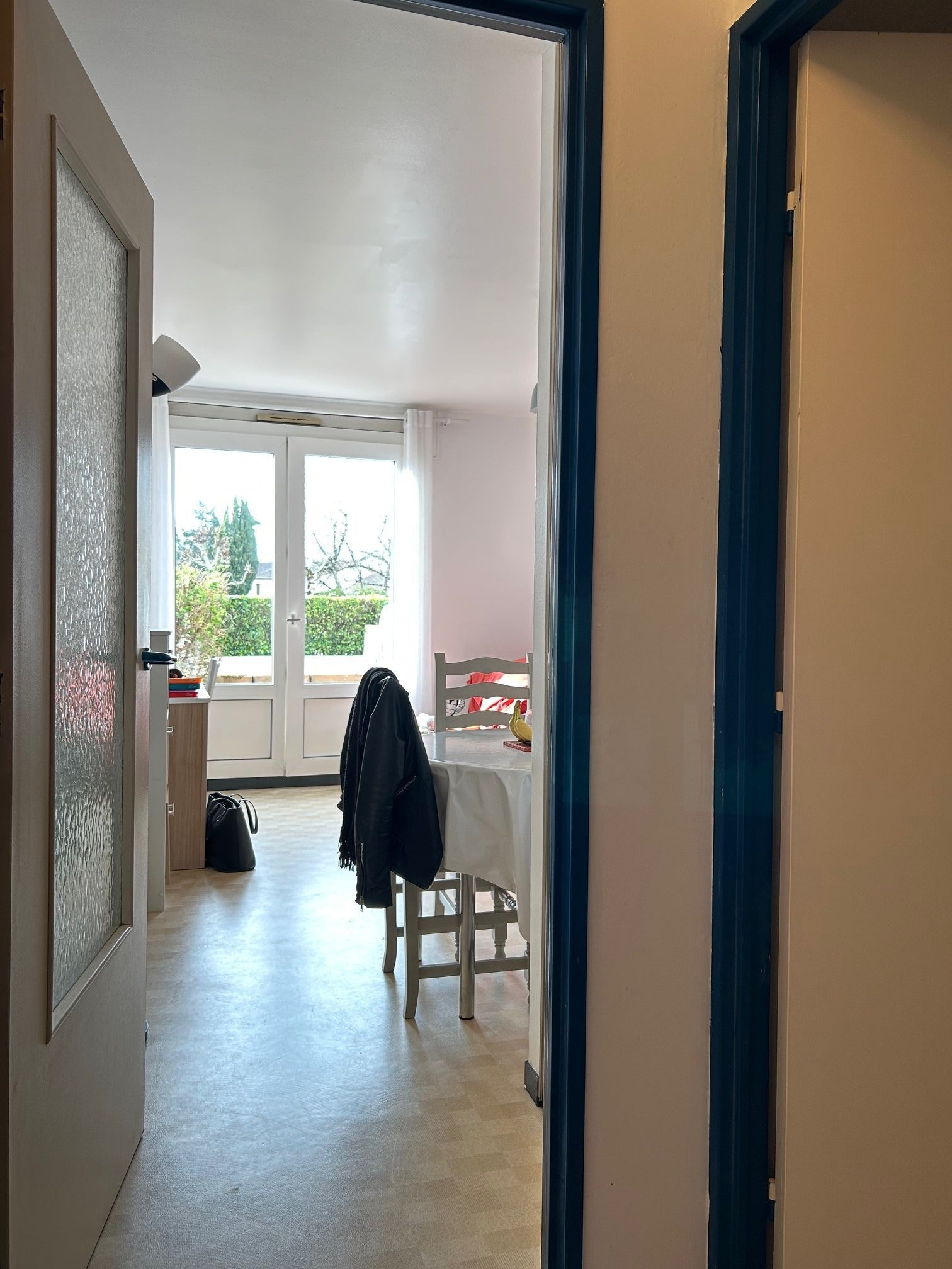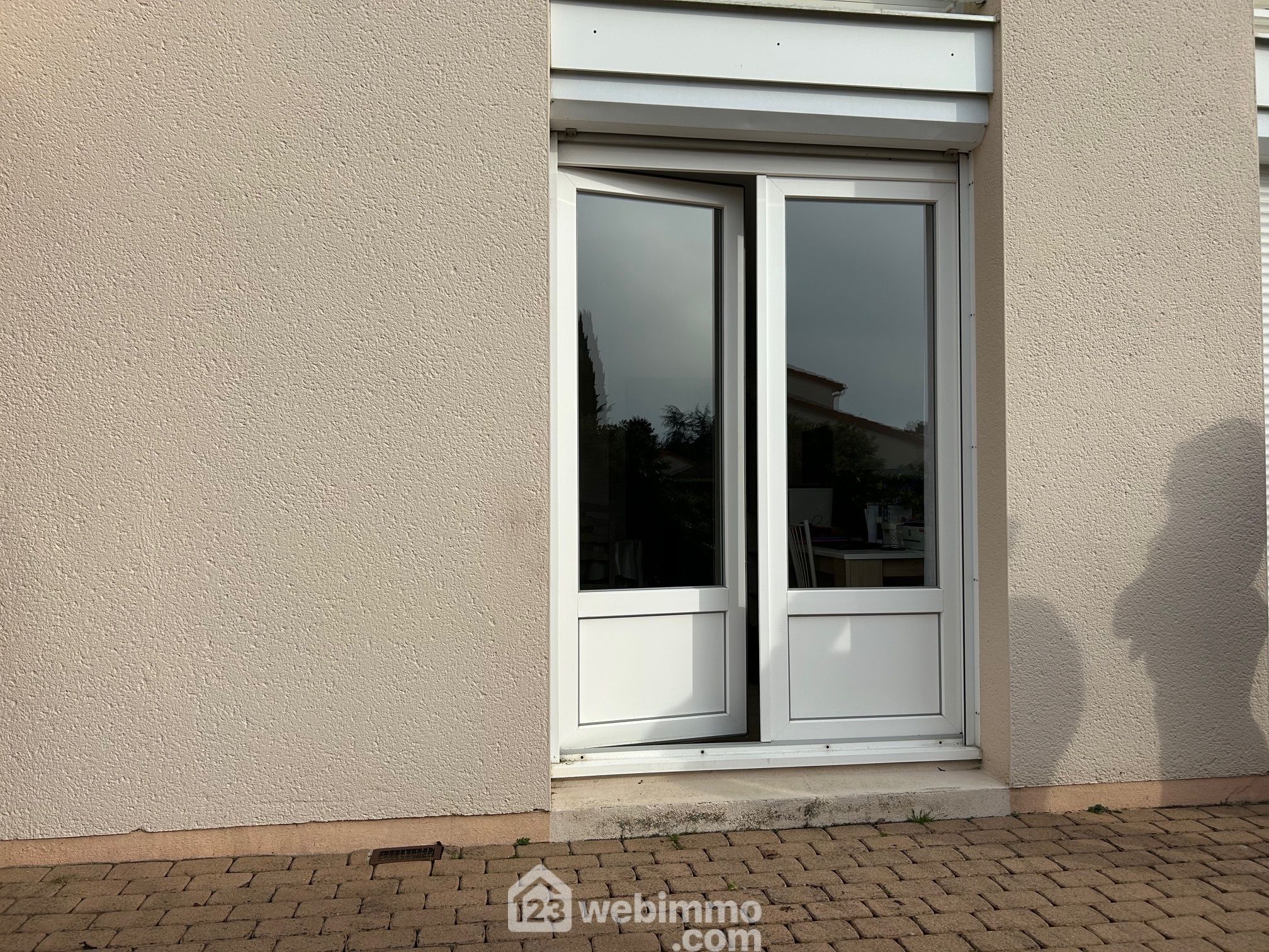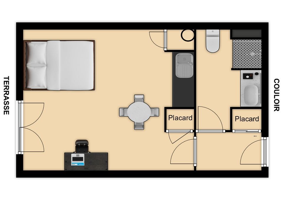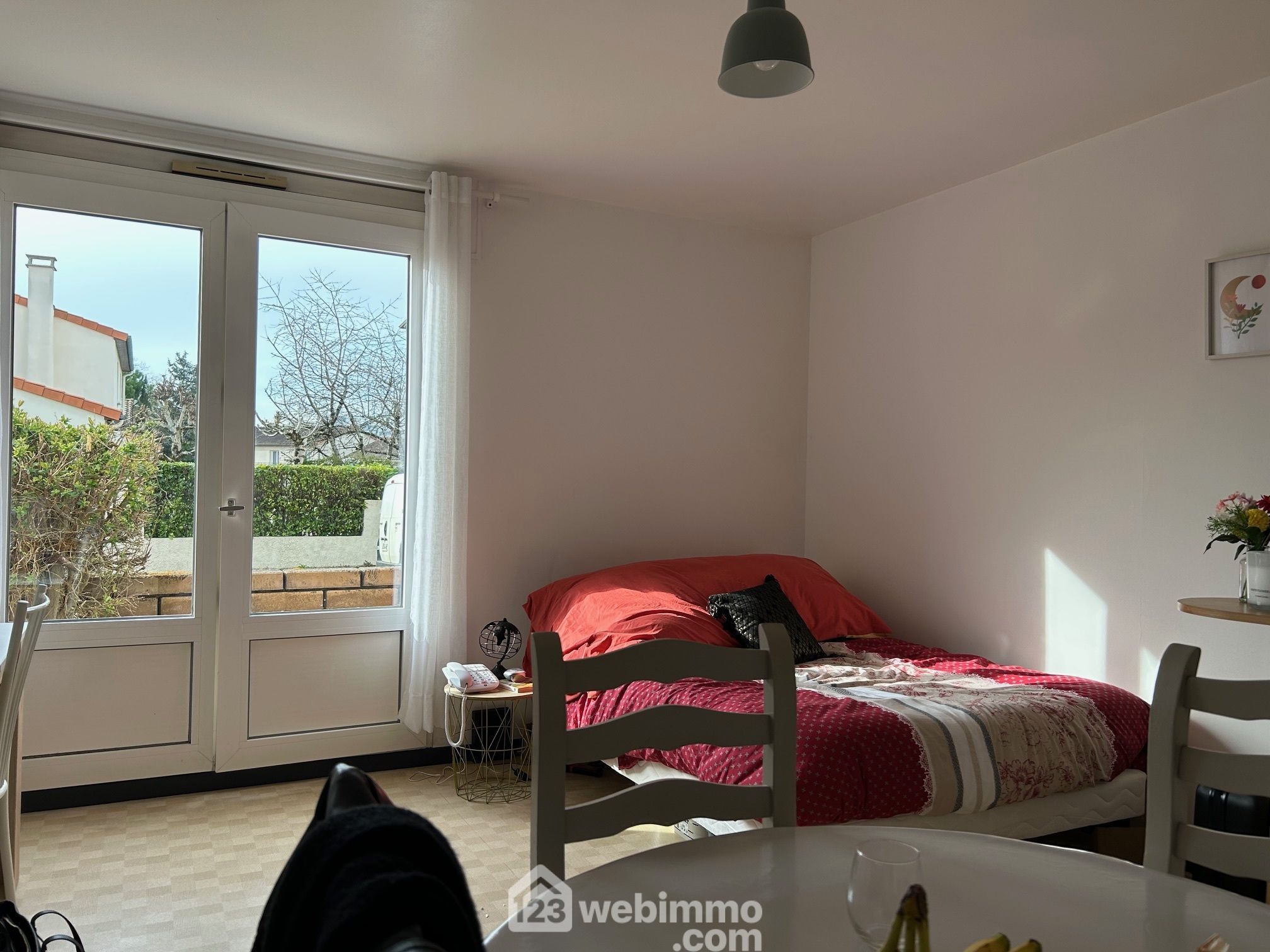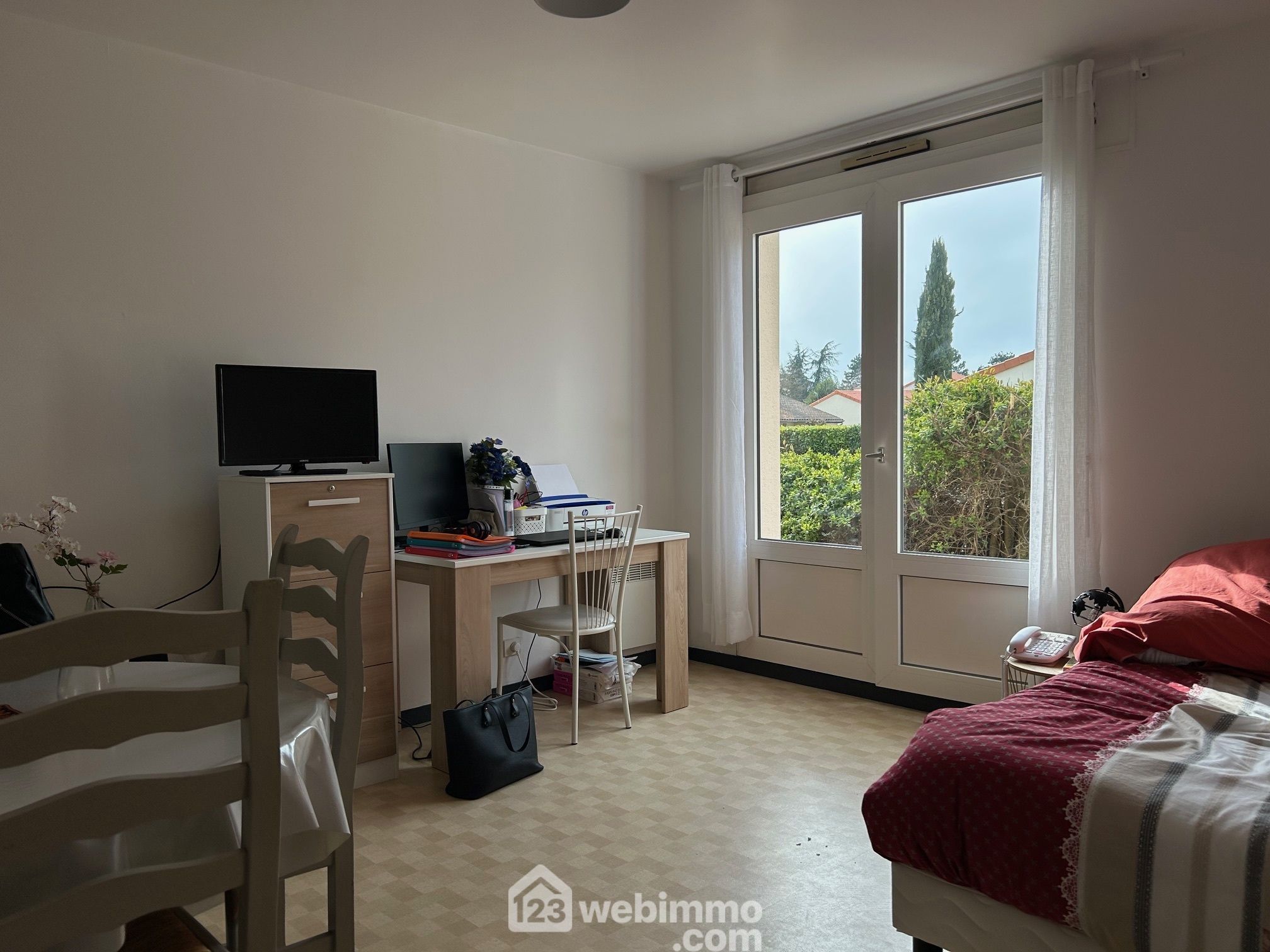 Studio en rez-de-chaussée avec baie ouvrant sur une terrasse non privative.