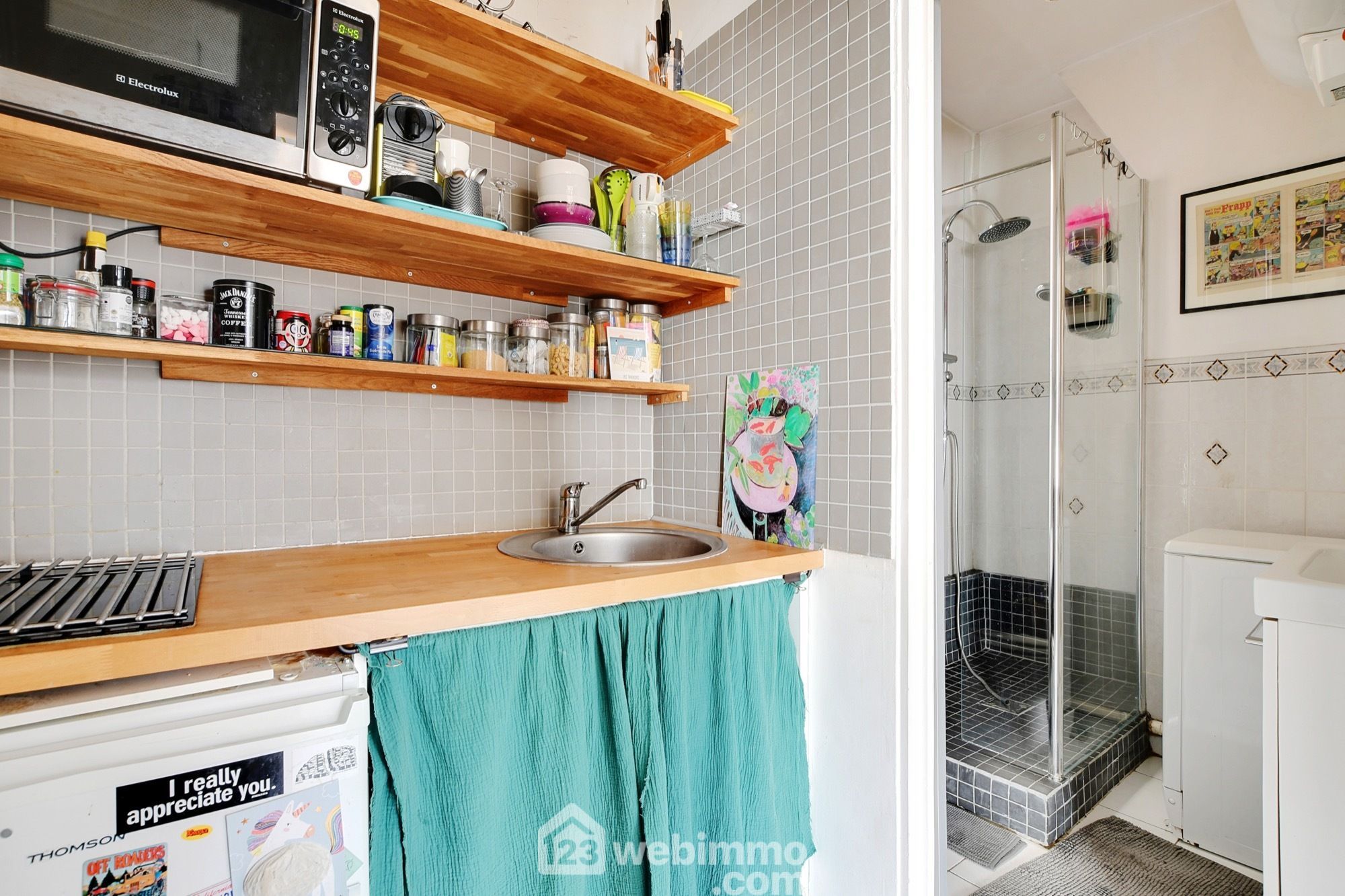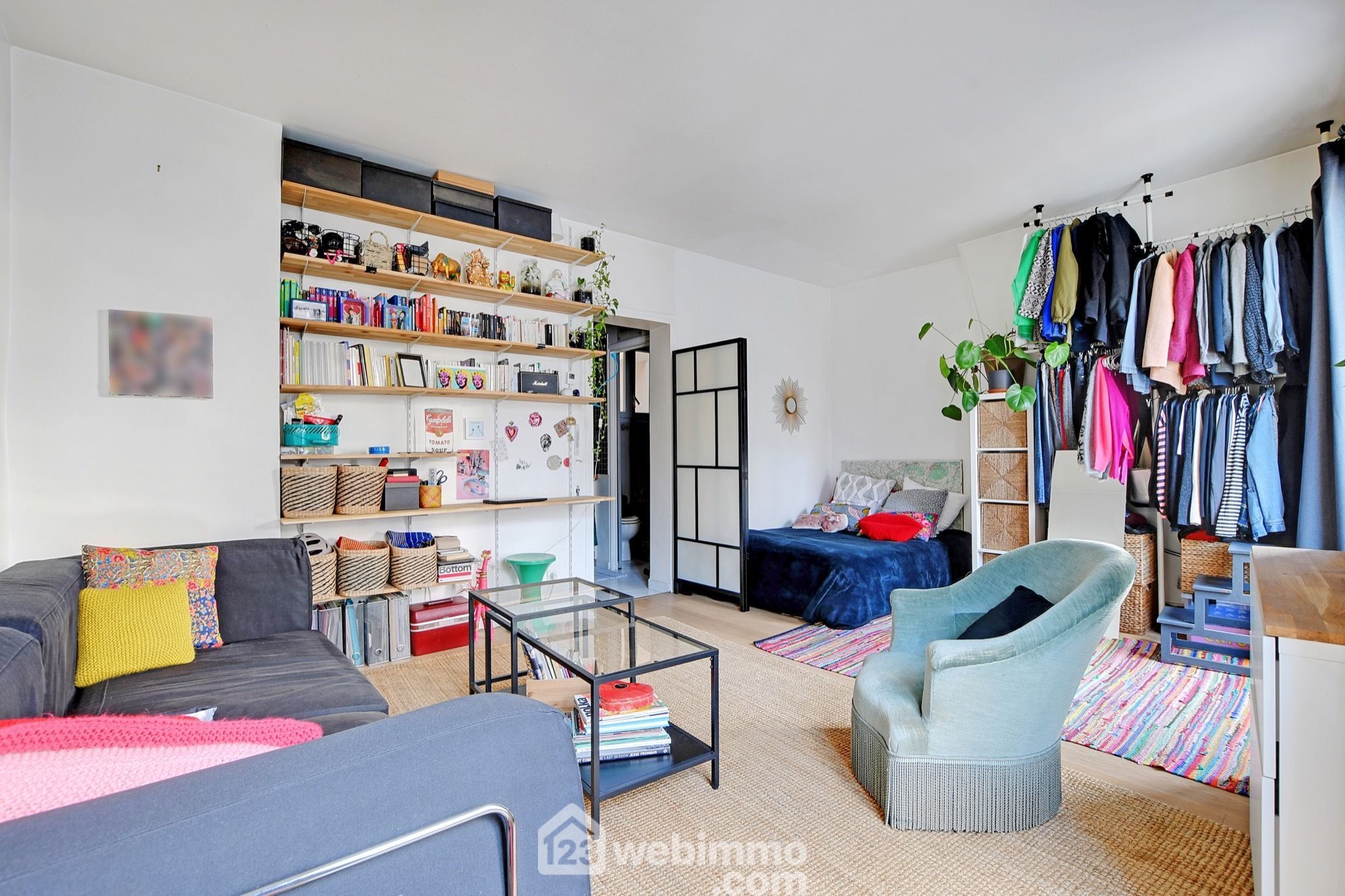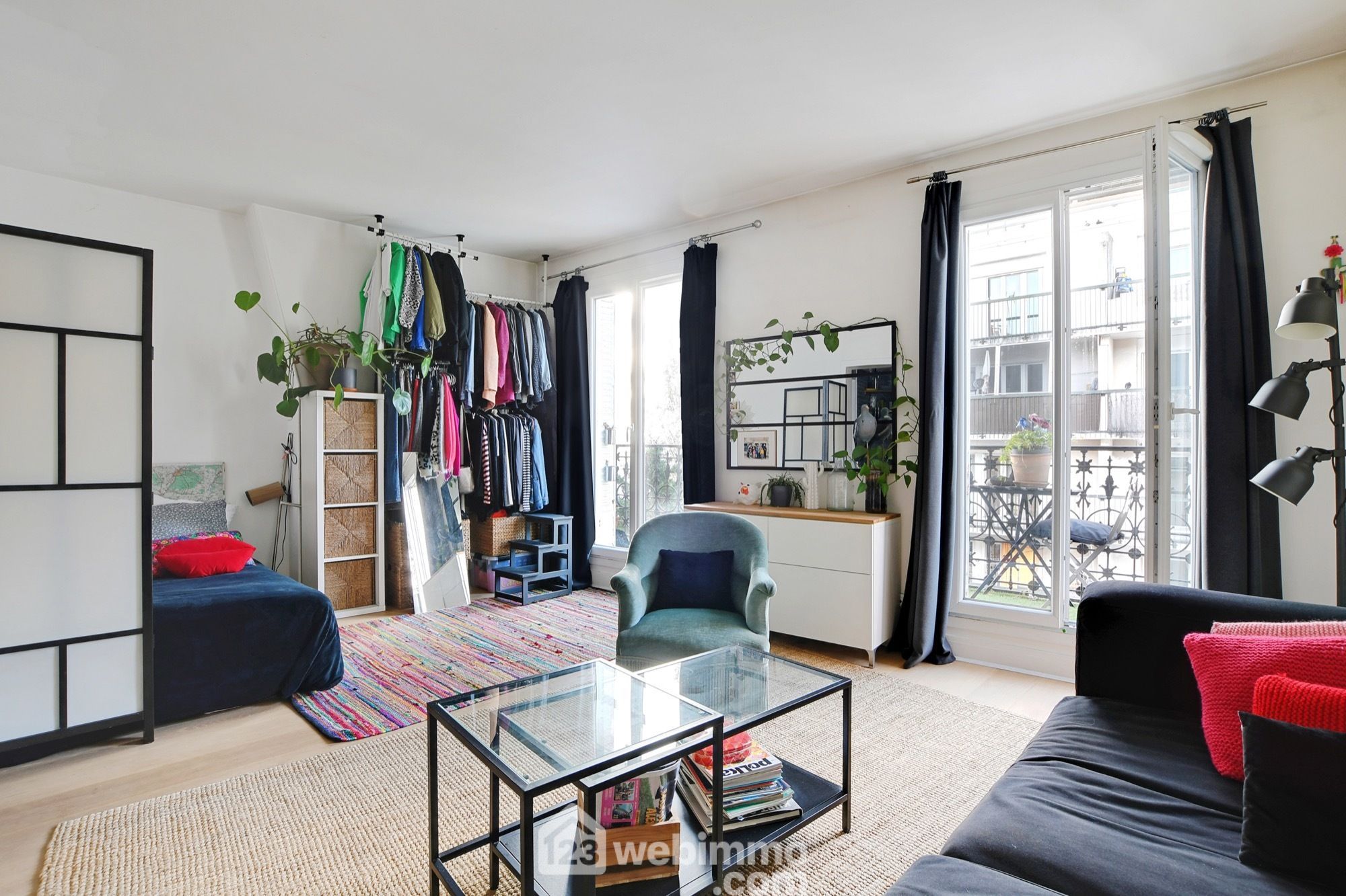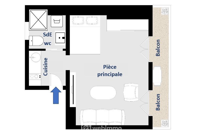 Très bien agencé, cet appartement optimise tout l’espace avec une petite cuisine, une salle d’eau/wc avec fenêtre et une grande pièce de vie très lumineuse (20,6 m² / 2m70 de hauteur sous plafond) donnant accès au balcon par 2 baies vitrées. A noter qu’il est possible ici de séparer la chambre de manière à agencer le logement en T2.