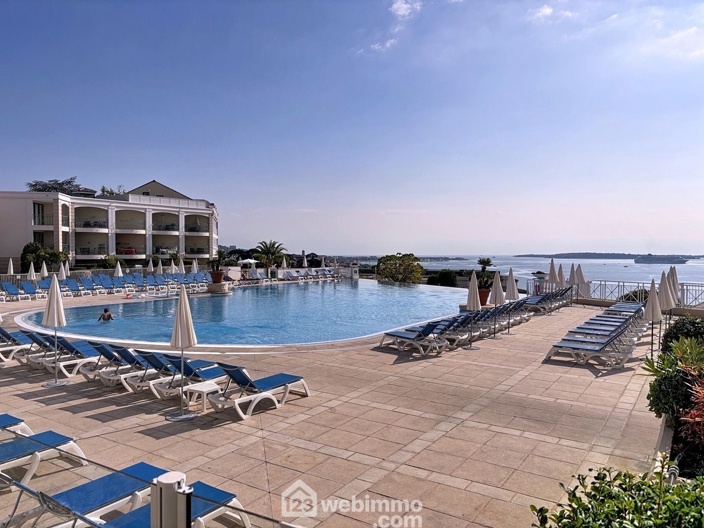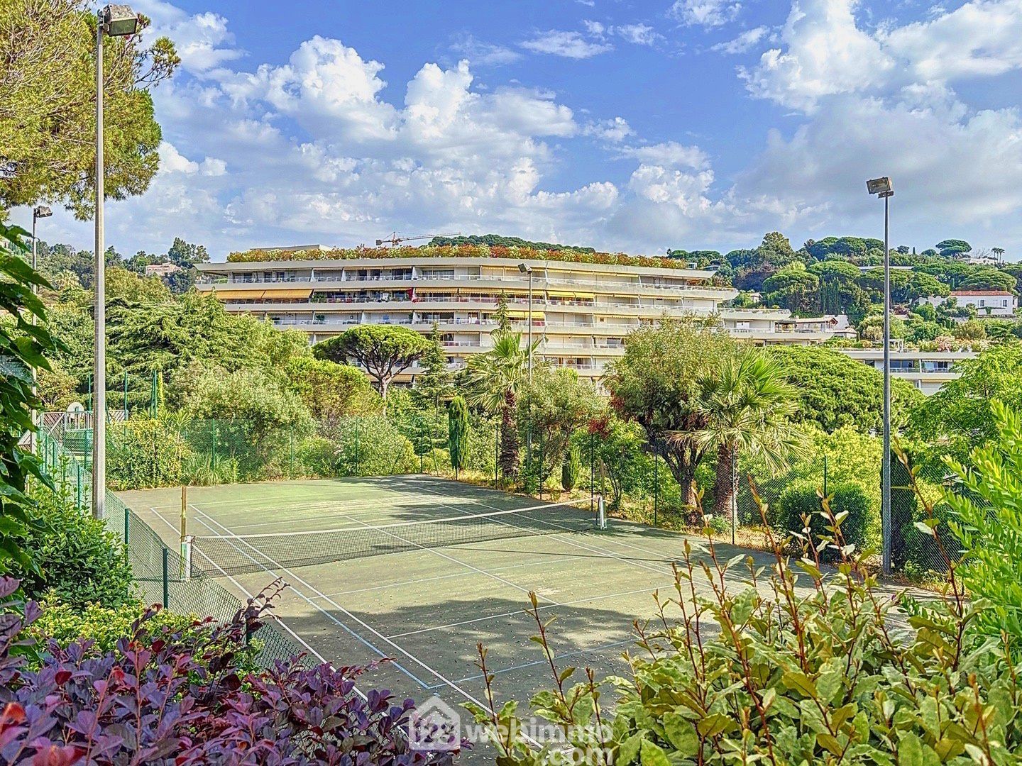 Vue mer plein Sud, 3P traversant en angle avec terrasse, piscine, tennis et parking à 300m de la mer.