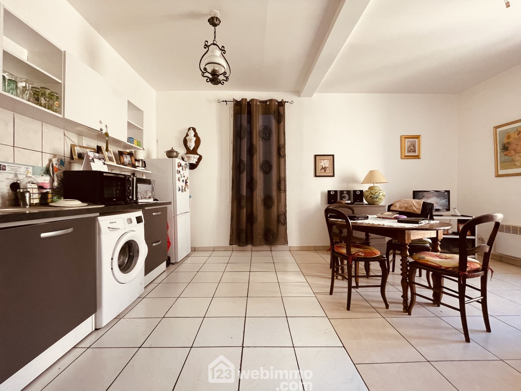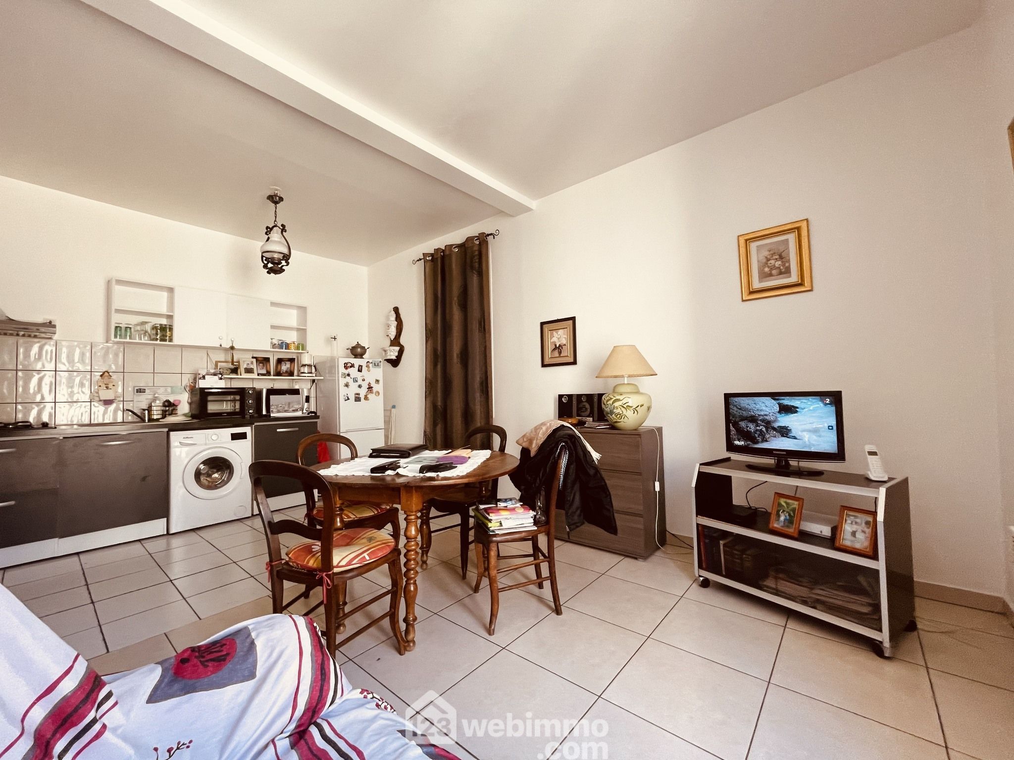 Hall d'entrée desservant séjour avec cuisine ouverte, chambre, salle d'eau avec wc .