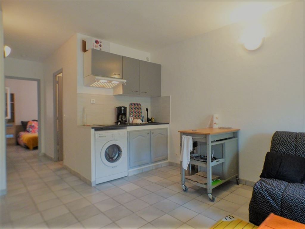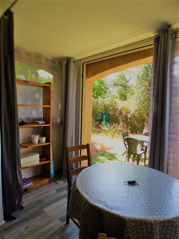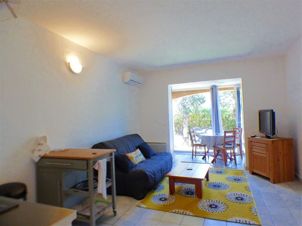 Dans une petite Résidence, bel environnement au calme, entrée, séjour donnant sur son jardin privatif de 150m2 clôturé, en exposition Sud, vue dégagée sur les collines , cuisine ouverte équipée, chambre, salle de bain, climatisation réversible, appartement en parfait état, les charges 36€uros par mois.