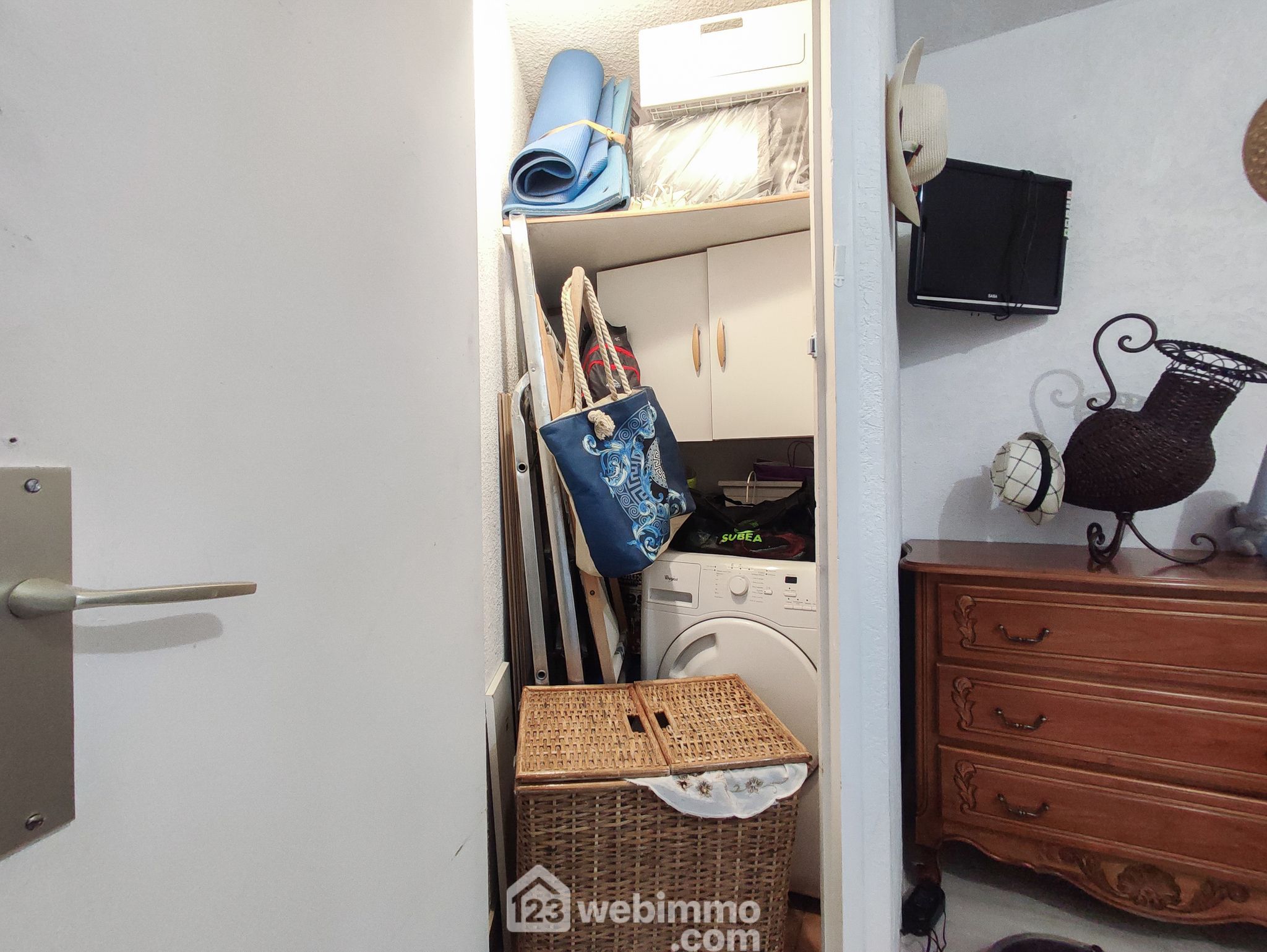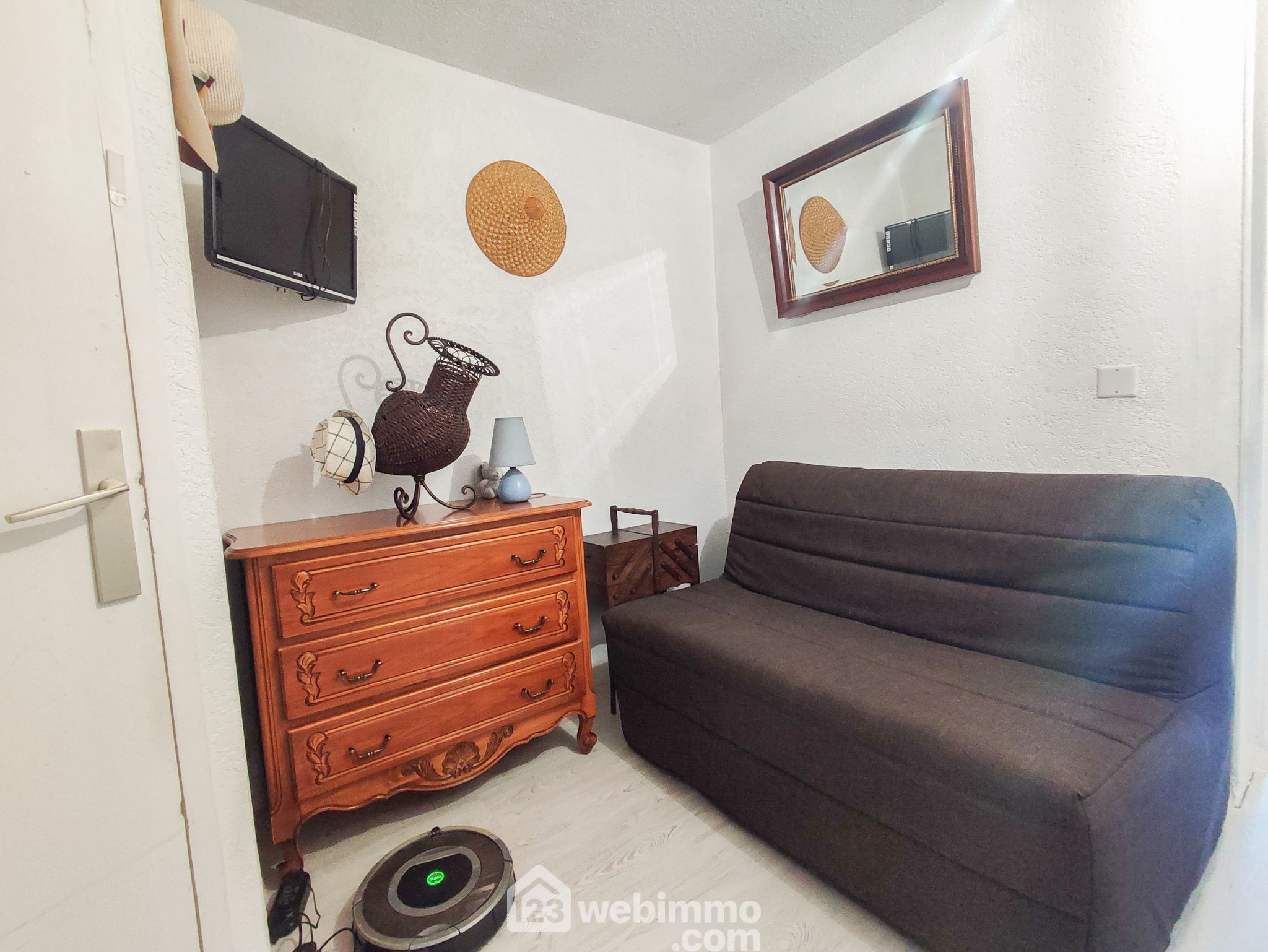 Il se compose d'une belle pièce de vie avec d'un côté le coin salon et de l'autre le coin salle à manger avec sa partie cuisine entièrement aménagée et équipée, d'une chambre avec placards, d'un coin cabine permettant d'avoir un autre couchage, d'une salle d'eau avec douche, d'un WC séparé et de deux buanderies.