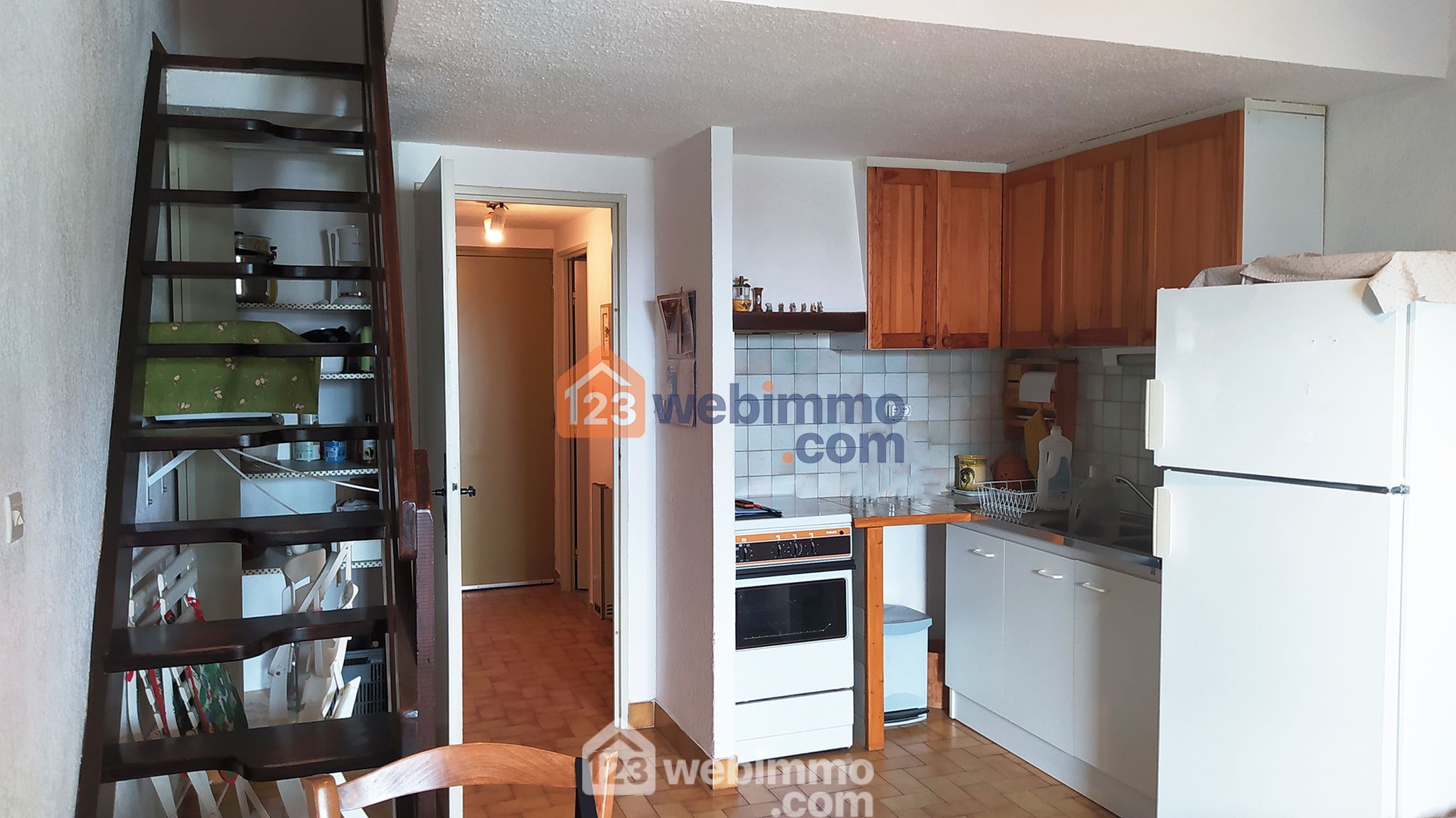 -1 Pièce de vie de 18m² avec sa cuisine ouverte et équipée de ses éléments (frigo, congélateur, cuisinière, four, micro-ondes, hotte)