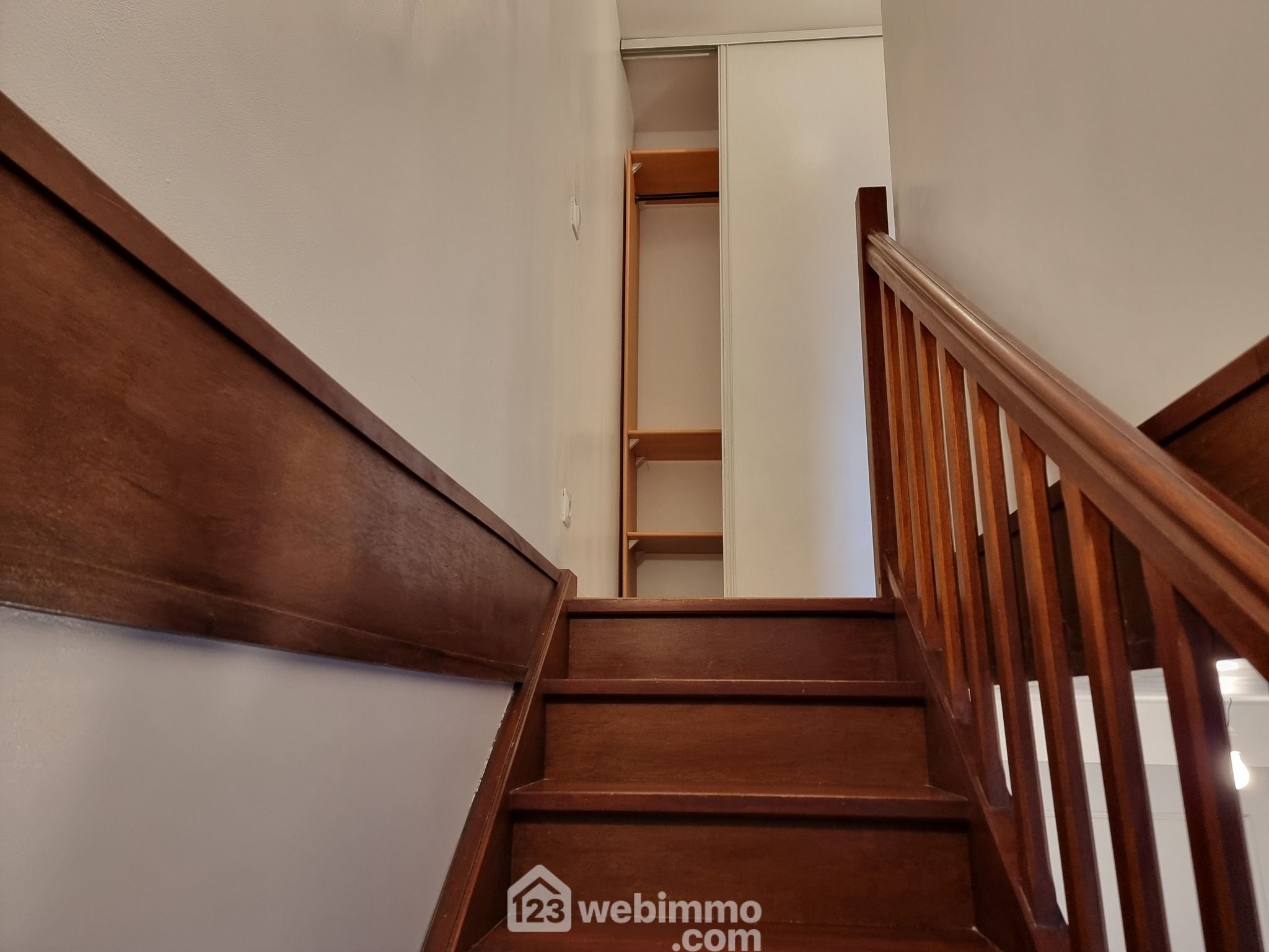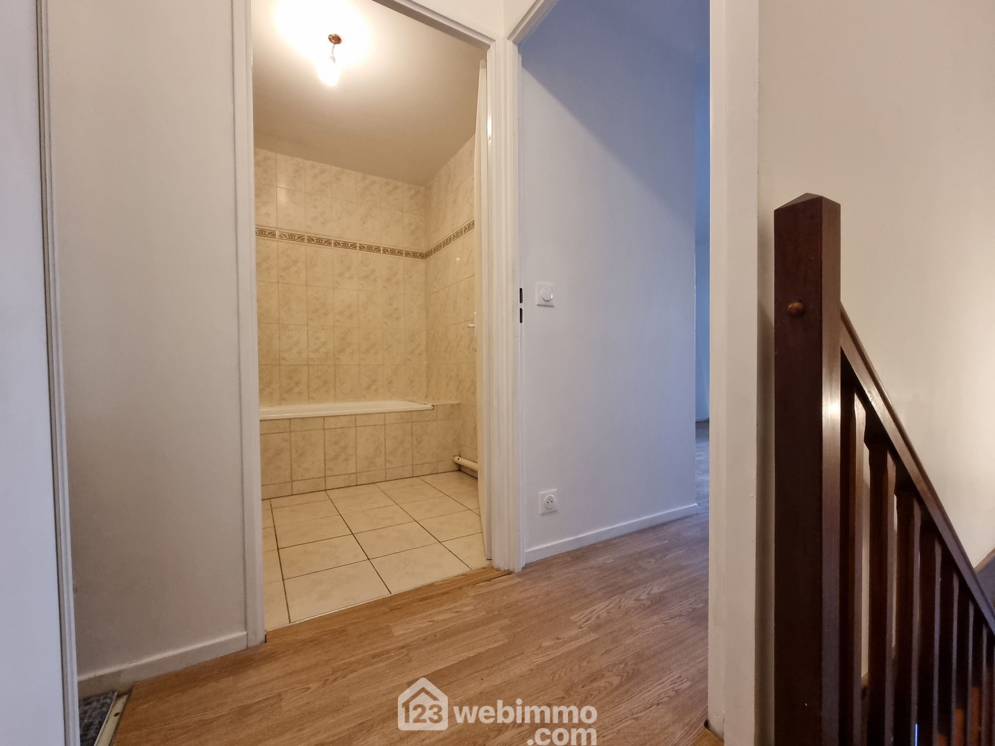 A l'Étage : Un palier avec rangements, une chambre spacieuse de 14,39 m² dotée de placards intégrés, offrant ainsi de nombreux rangements et une salle de bains avec un second toilette.
