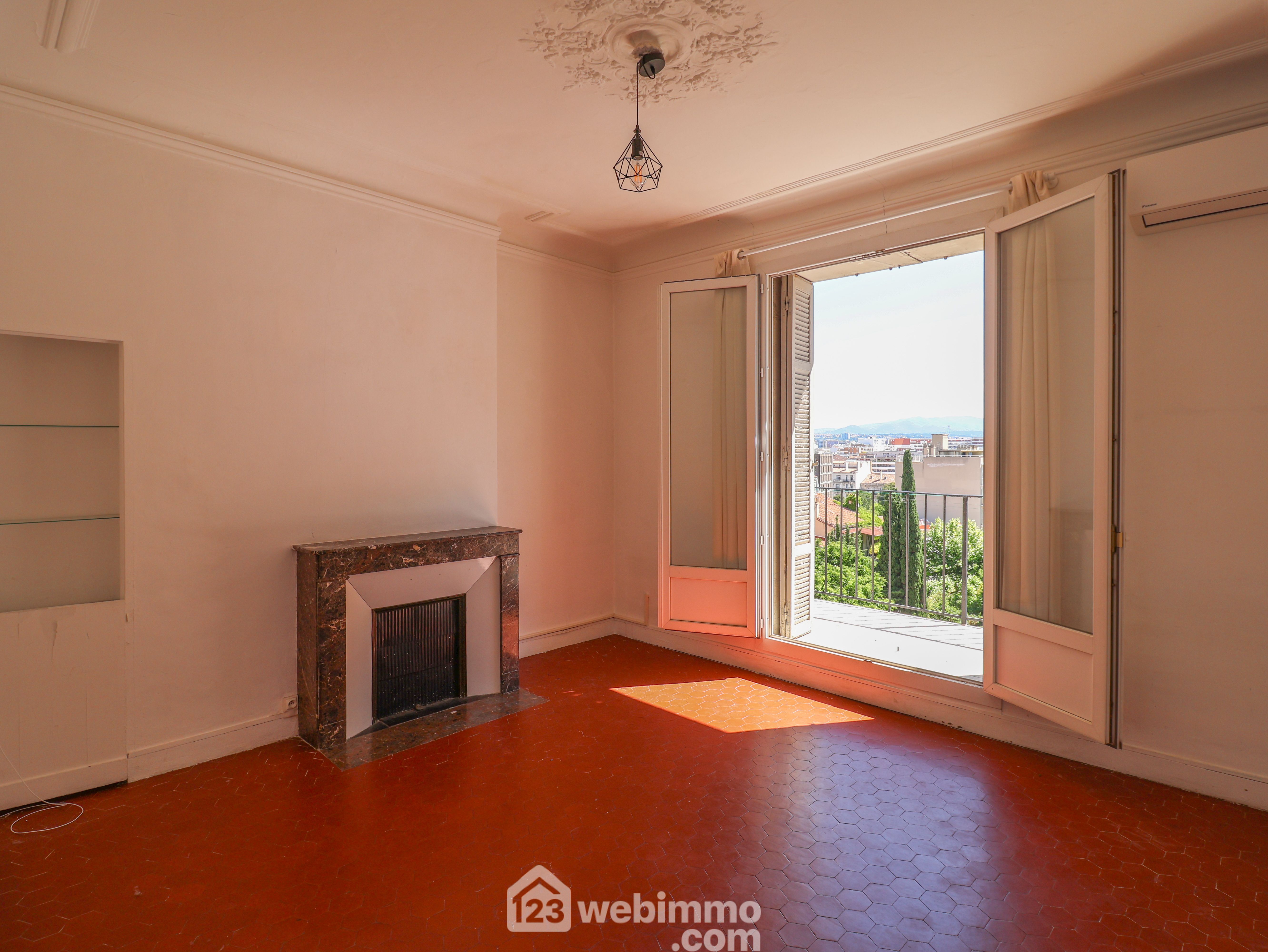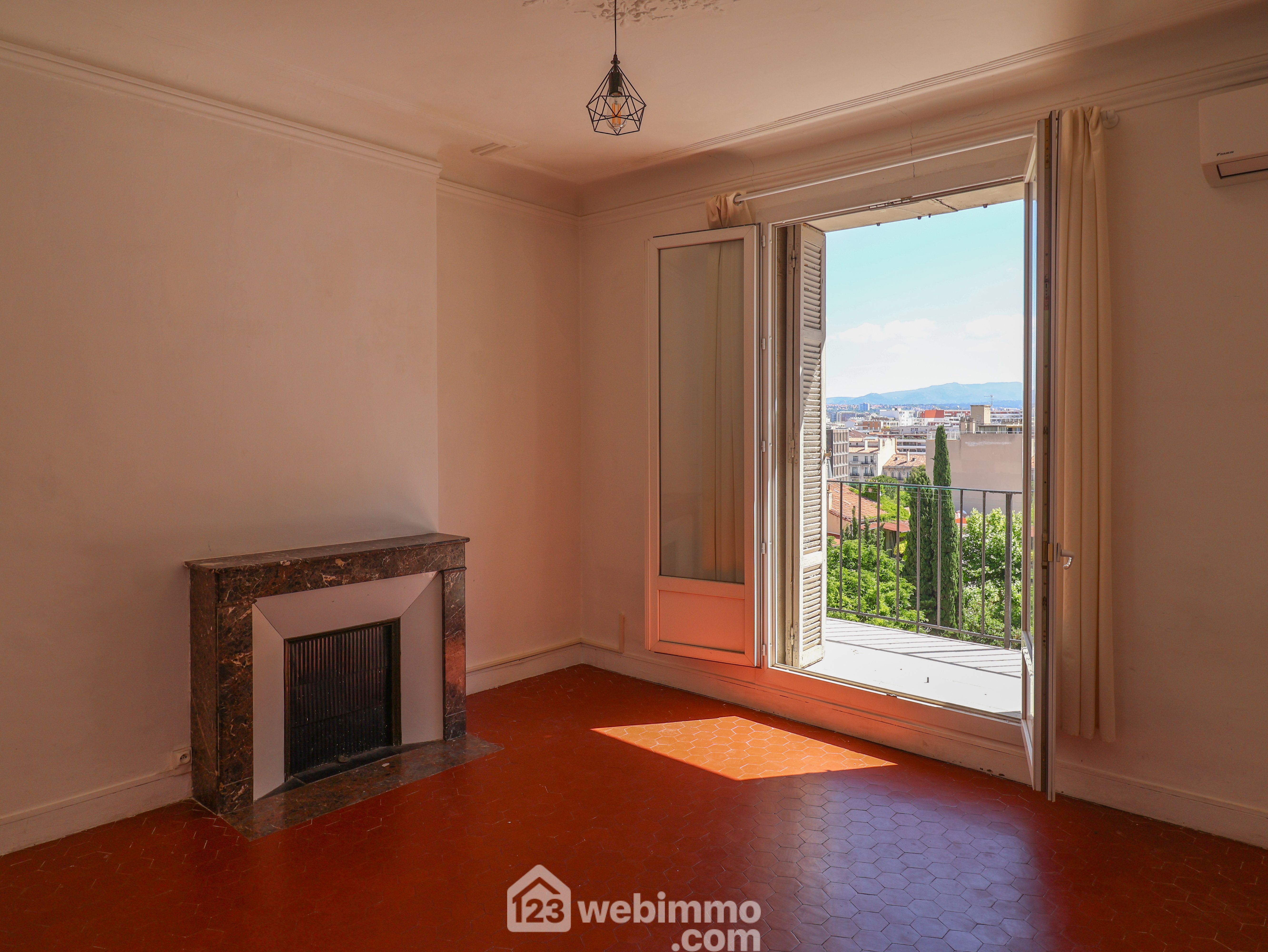 PERIER, carré d'or en exclusivité. En 4ème et dernier étage sans ascenseur d'un bel immeuble située rue d'Alsace au calme absolu. Grand type 2 de 50m2. Il se compose d'un séjour et d'une cuisine donnant sur un agréable balcon à la belle vue dégagée sur la verdure, une chambre de 11m2 et une salle de bain. Deux belles cheminées habillent le séjour et la chambre. Le sol en tomettes participe au charme de cet appartement. Double vitrage, climatisation réversible, porte blindée. Copropriété de 6 lots. Charges 70€/mois. Taxe foncière 777€.