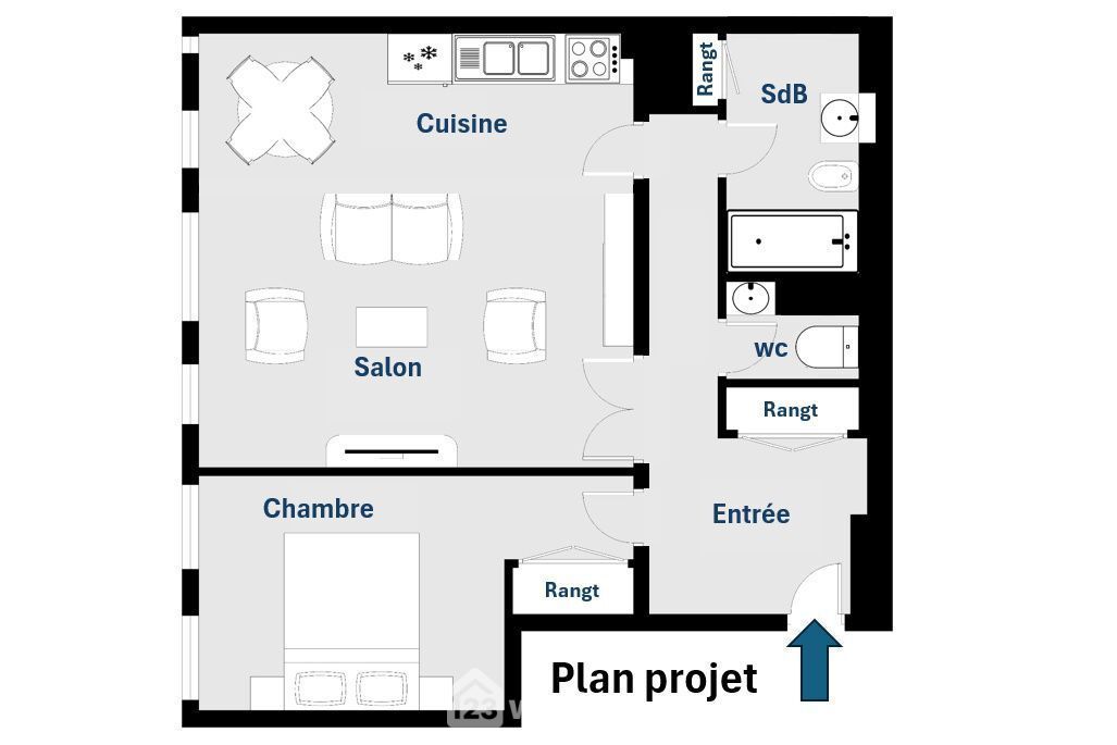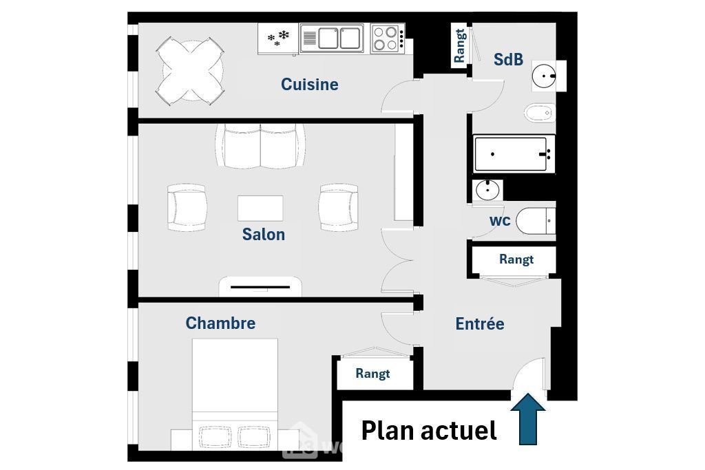L'appartement, exposé Sud-Ouest, offre une vue dégagée sans vis-à-vis sur les jardins de la résidence. Il se compose d'une entrée avec un grand placard, une chambre confortable avec rangements, un salon spacieux, une cuisine indépendante, une salle de bains et des WC séparés.