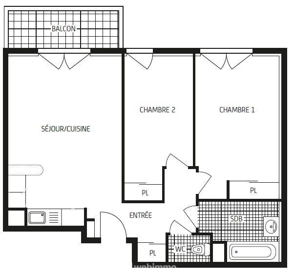 Entrée avec placard, cuisine/séjour avec placard, 2 chambres avec placard, salle de bains, WC, balcon et 2 places de parking privatives.
