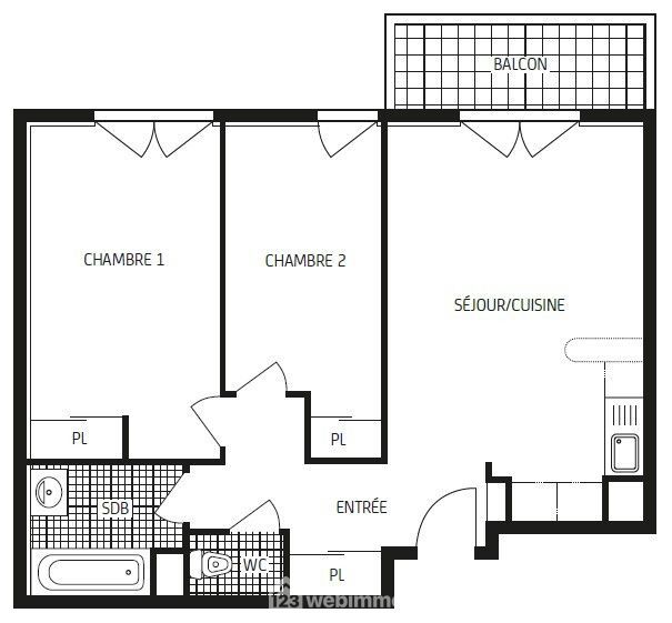 Entrée avec placard, cuisine/séjour avec placard, 2 chambres avec placard, salle de bains, WC, balcon et 2 places de parking privatives.