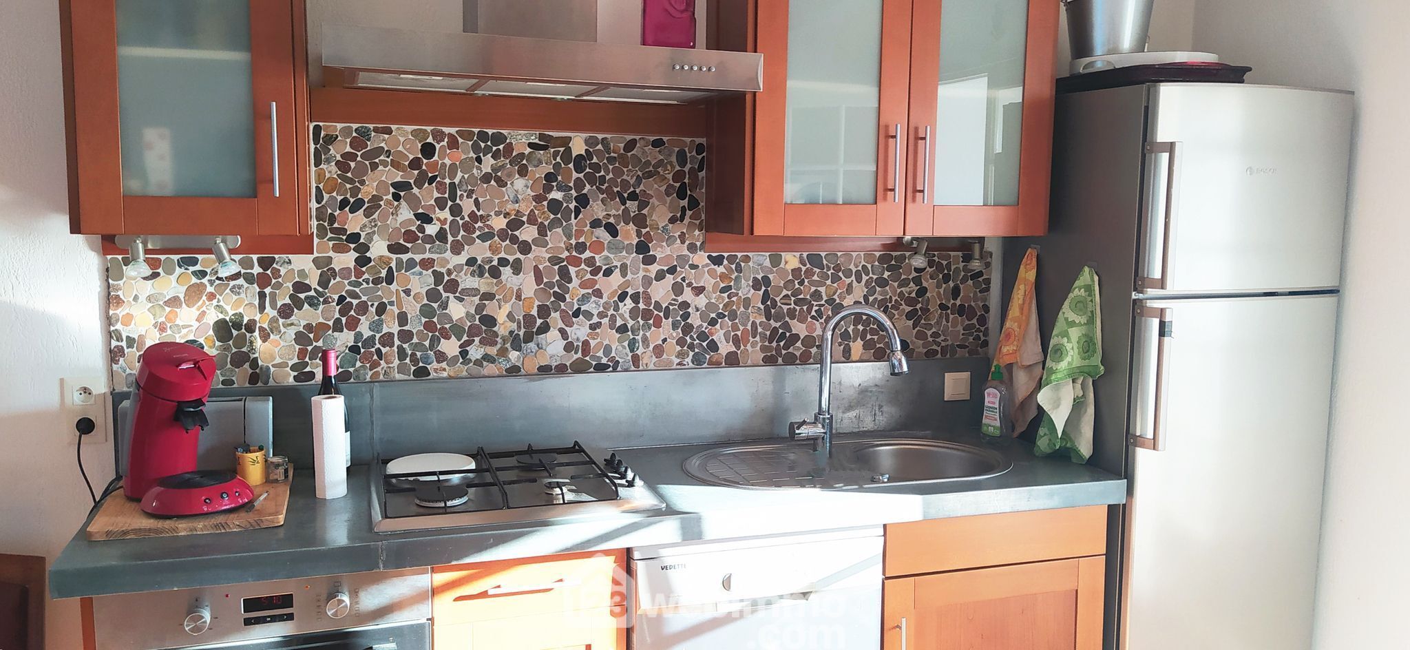 - 1 Pièce de vie avec sa cuisine équipée de ses éléments (frigo, four, plaque de cuisson, hotte)