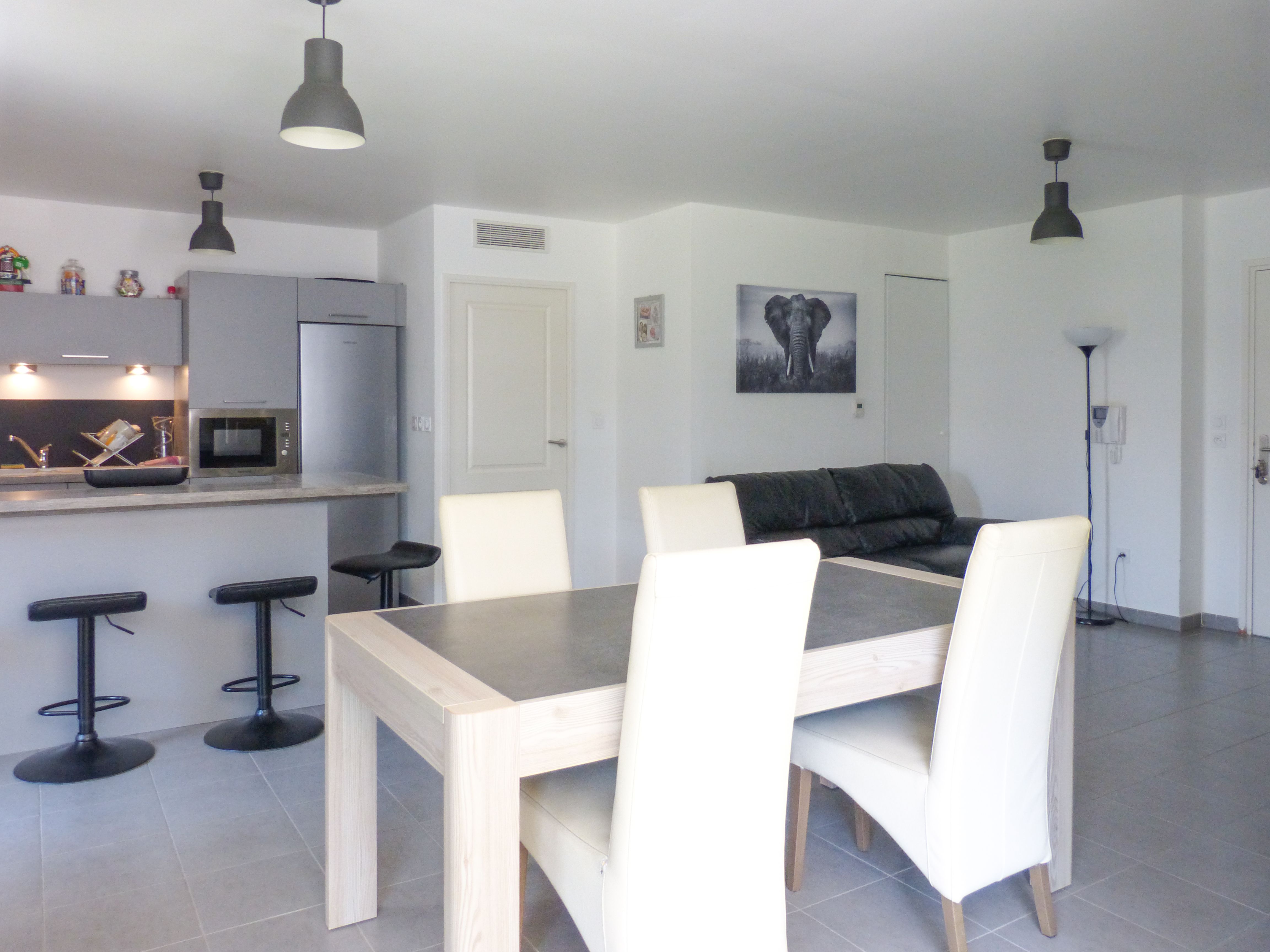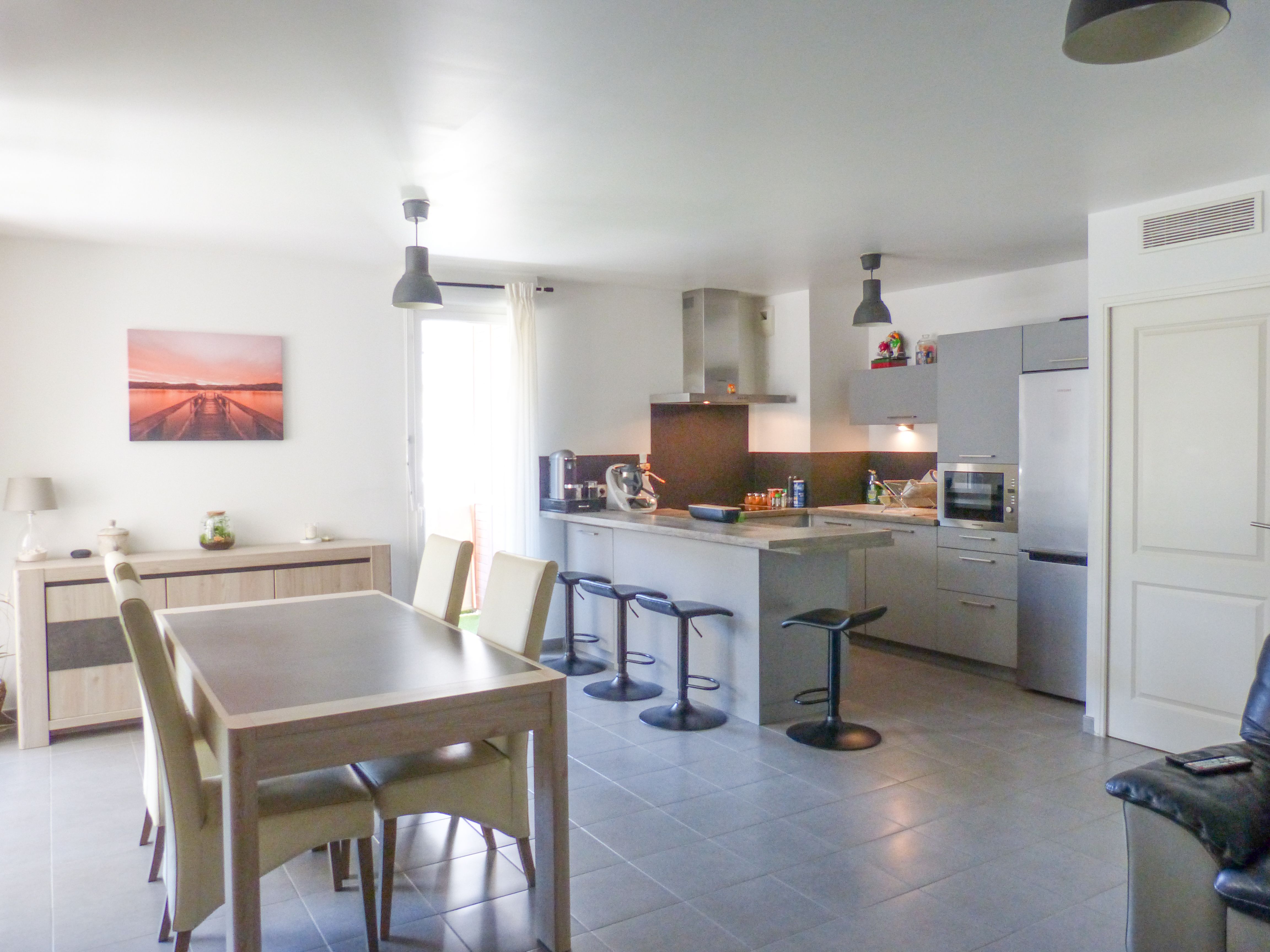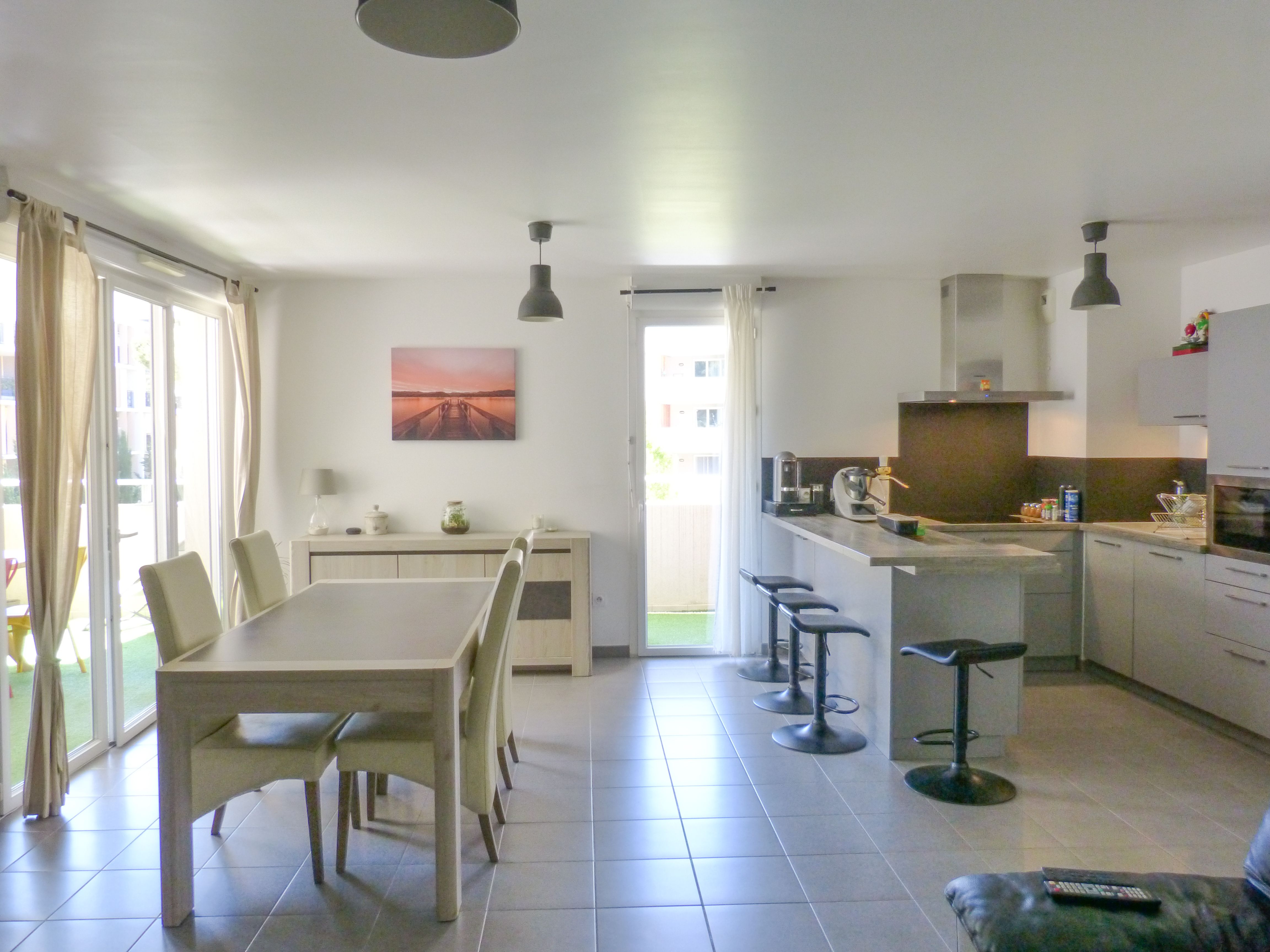Dans un petit immeuble de 2012 avec ascenseur, très beau T3 traversant en 1er étage sur 4 de 64m2 ouvert sur une agréable terrasse de 19m2 exposée au SUD-OUEST. Il se compose d'un vaste séjour cuisine de 33m2 avec une cuisjne équipée de qualité. Deux chambres de 11,7m2 et 9,2 m2 avec placards. Salle de bains, wc séparés. Double vitrage. Climatisation réversible, chauffage par air pulsé. Construction répondant à la norme RT 2021. BOX DOUBLE EN SOUS-SOL FERME EN SUS 20 000€. Résidence fermée au sein d'une allée close. Charges 160€ /mois avec eau chaude et chauffage. Taxe foncière 1260€.`