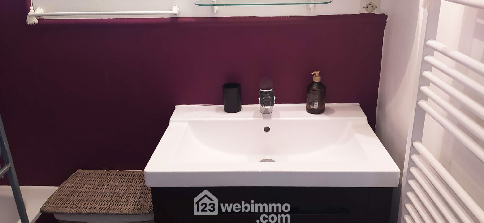 - 1 Salle de bain équipée d'une vasque sur meuble, d'une baignoire, et d'un sèche serviette.