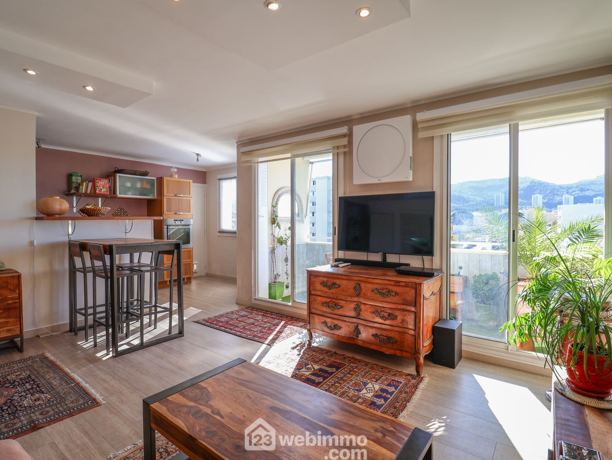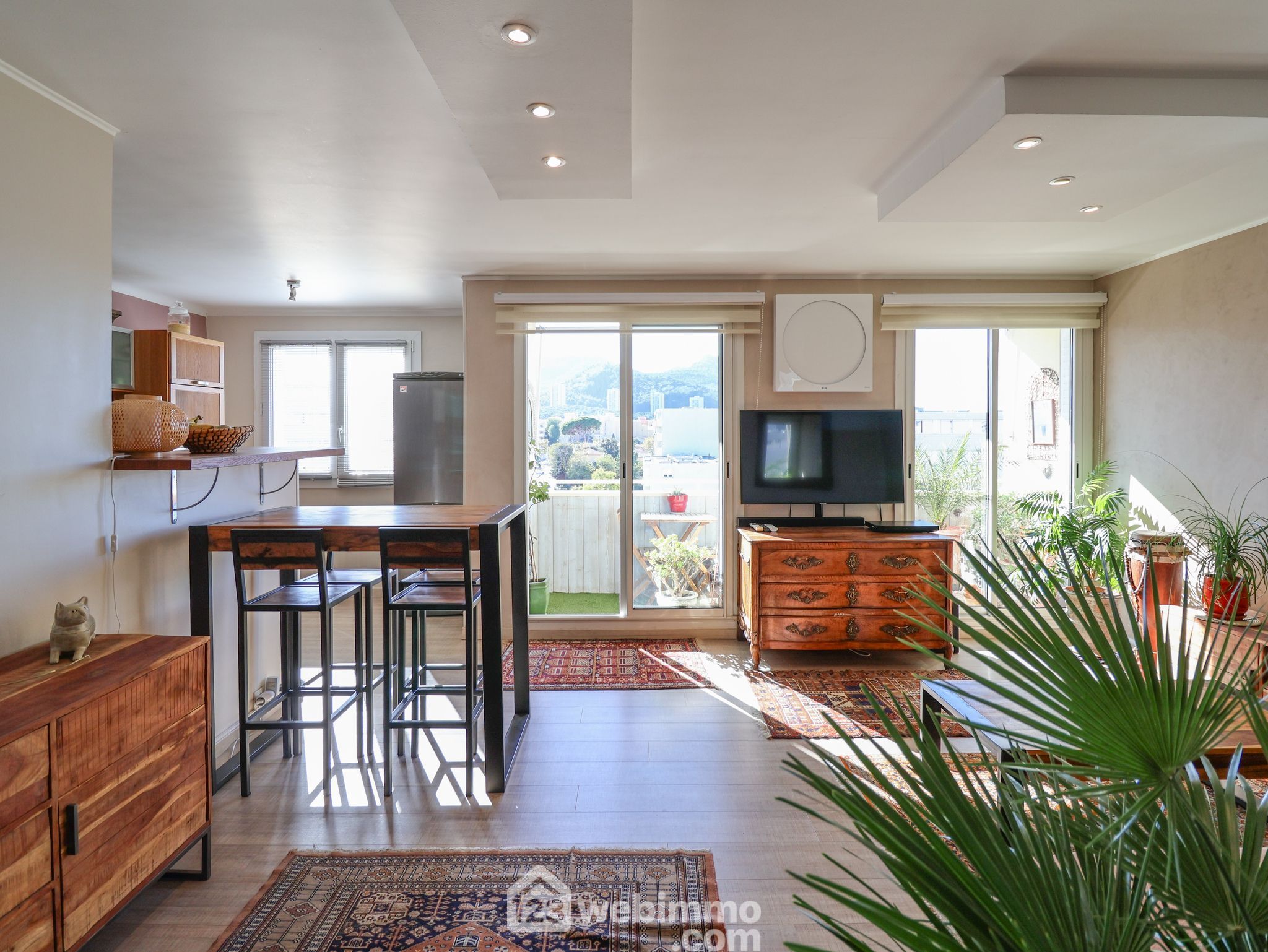 MAZARGUES. DERNIER ETAGE. Au cœur du village proche 8ème. Très beau type 3 traversant de 68m2 rénové avec goût en 6ème et dernier étage avec ascenseur ouvert sur un lumineux balcon exposé au SUD-OUEST. Jolie vues dégagées sur le massif des Calanques avec un aperçu mer sur le Frioul. Un hall d'entrée introduit un beau séjour et une cuisine équipée donnant sur le balcon. La partie nuit se compose de 2 chambres, une salle de bain et un WC séparé. Un beau parquet contemporain rehausse l'ambiance chaleureuse de l'appartement. Double vitrage. Climatisation réversible dans le séjour. Porte blindée. Nombreux placards. Fibre. Charges 205€/mois chauffage inclus. CAVE. Commerces, transports, crèches, écoles, collège, parc Bortoli au pied de la résidence. Stationnement très aisé.