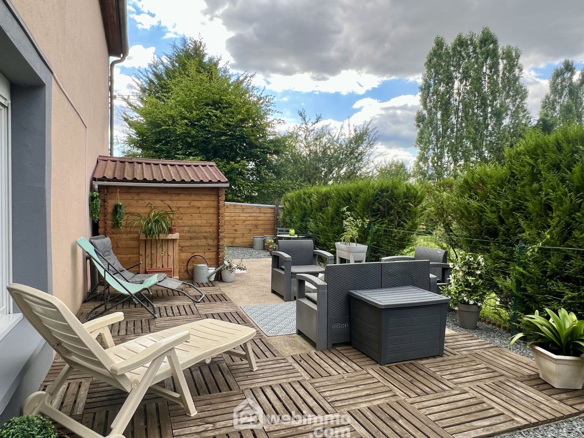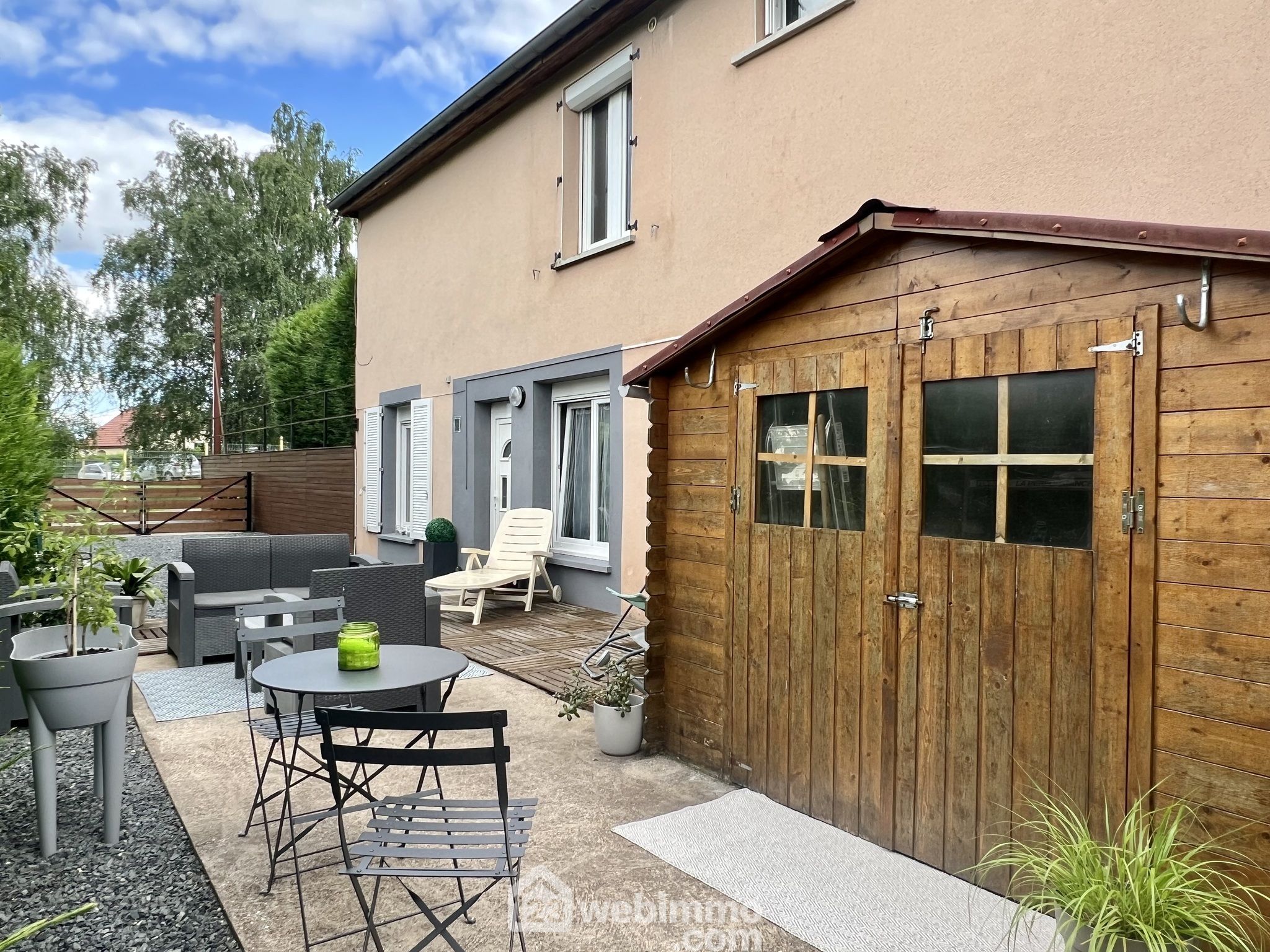 Ses extérieurs privatifs, d'environ 100m², composés d'une allée permettant de stationner 2 voitures et d'une terrasse spacieuse avec cabanon de jardin, vous offrirons un cadre de vie calme et agréable.