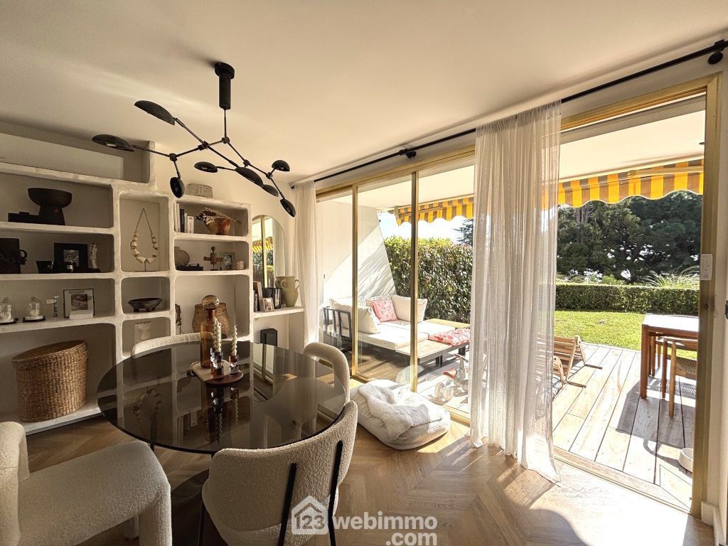 CANNES CROIX DES GARDES 3 PIECES EN RDJ - Au sein d'une prestigieuse résidence sécurisée avec intendant - piscine - tennis et parc de 4 hectares à quelques mètres de la plage et proches commerces. Il a de beaux atouts : il est au calme absolu, pas de vis à vis, traversant, climatisé très bien orienté plein Sud et rénové contemporain. Appartement 3 pièces comprenant un hall d'entrée - un salon salle à manger donnant sur une profonde terrasse s'ouvrant sur jardin privatif et verdure - deux chambres dont une avec salle de douche - une salle de bain et un WC séparé. Une cave et places de parking extérieures.