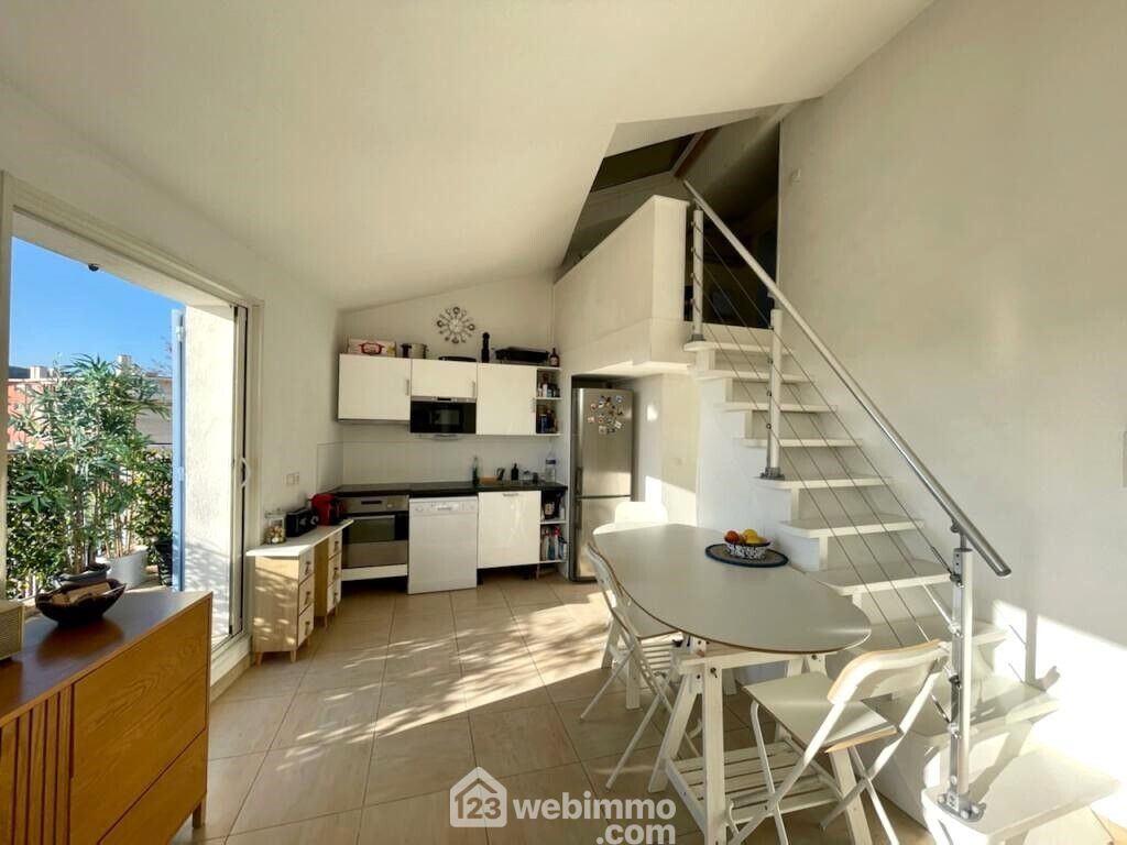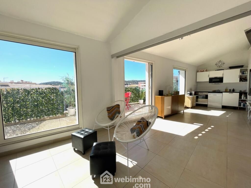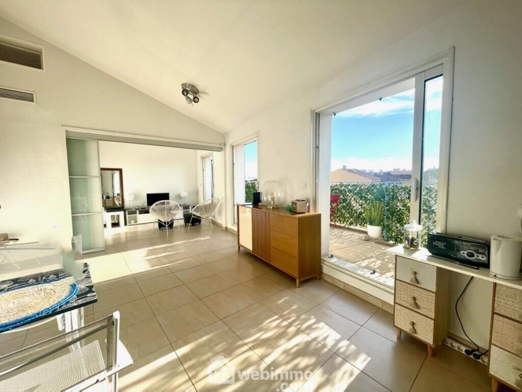 Sainte-Maxime, situation idéale, 3pièces, Terrasse, Garage en sous-sol, Centre Ville, proche commerces et bord de mer, au calme, Bel appartement au Dernier étage avec ascenseur, 3pièces d'une surface au sol de 71m2 avec deux grandes Terrasses, entrée, séjour avec ses baies en galandage donnant sur sa Terrasse de 16m2 en exposition Sud-Ouest, cloison coulissante pour la première chambre avec sa salle de douche et w-c, cuisine ouverte entièrement équipée, une grande chambre de 15m2 avec de nombreux rangements avec accès sur sa terrasse de 10m2, salle de douche avec w-c, mezzanine avec velux, pour espace bureau ou couchage d'appoint, Climatisation réversible, un garage en sous-sol de l'immeuble.