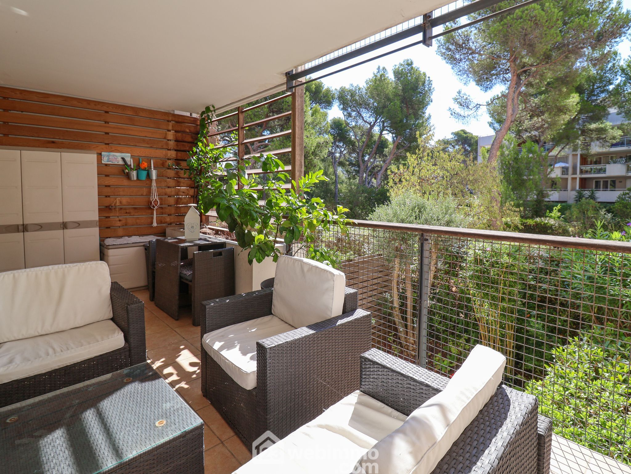 PARC DU ROY D'ESPAGNE, EXCLUSIVITE, au sein de l'environnement boisé d'exception de l'Allée Cervantes, au calme absolu. Dans un petit immeuble de 2005 avec ascenseur, très beau T3 traversant de 72 m2 ouvert sur une agréable terrasse de 15m2 exposée au SUD-EST donnant sur une pinède. Il se compose d'un vaste séjour cuisine lumineux de 32m2 avec une cuisine équipée. Deux chambres de 12m2 et 12,6m2. Nombreux placards. Salle de bain, wc séparés. Double vitrage. Climatisation réversible. PLACE DE PARKING PRIVATIVE INCLUSE DANS LE PRIX BOX SIMPLE EN SOUS-SOL EN SUS pour 25000€. Résidence fermée au sein d'une allée close. Charges 159€/mois. Visite virtuelle disponible.