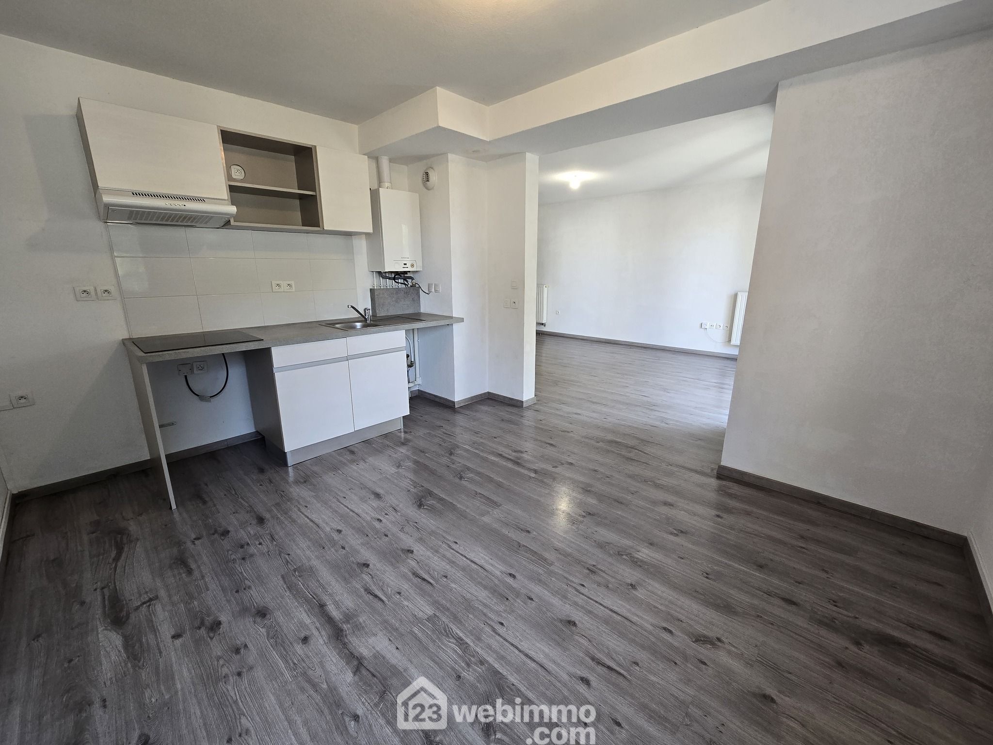 Une pièce de vie avec cuisine ouverte, une salle de bains, deux chambres, il est lumineux et fonctionnel.