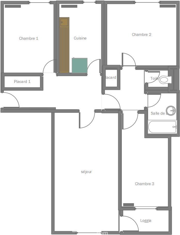 Comprend une entrée avec rangements et dégagement ouvrant sur une chambre avec placard, une cuisine équipée indépendante, un séjour / salle à manger avec un accès au balcon exposé Sud Ouest sans vis à vis, un second dégagement avec rangement desservant une salle de bain, un wc indépendant et 2 chambres dont une avec placard.