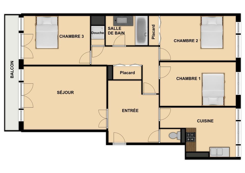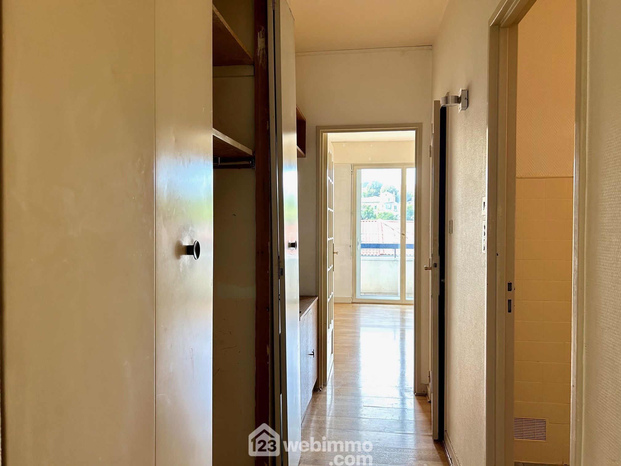 L'appartement : L'entrée avec placard dessert l'ensemble des espaces. D'un côté, la cuisine et un WC indépendant. De l'autre le salon séjour ouvert sur un long balcon. En face l'espace nuit avec un dégagement avec placards qui distribue 3 chambres, dont une peut agrandir le salon, une salle de bain et une douche indépendante. Il dispose également d'une cave en sous-sol.