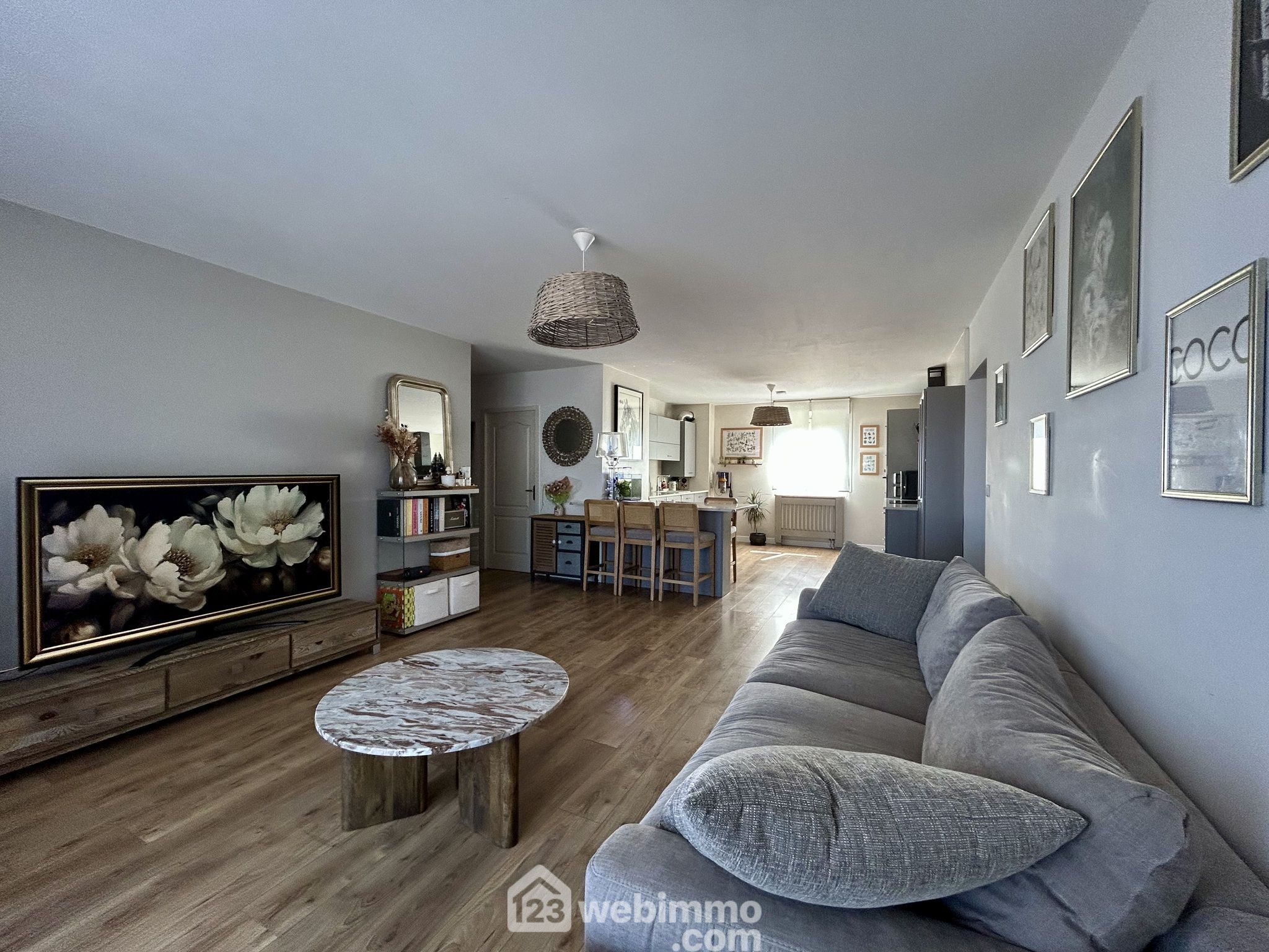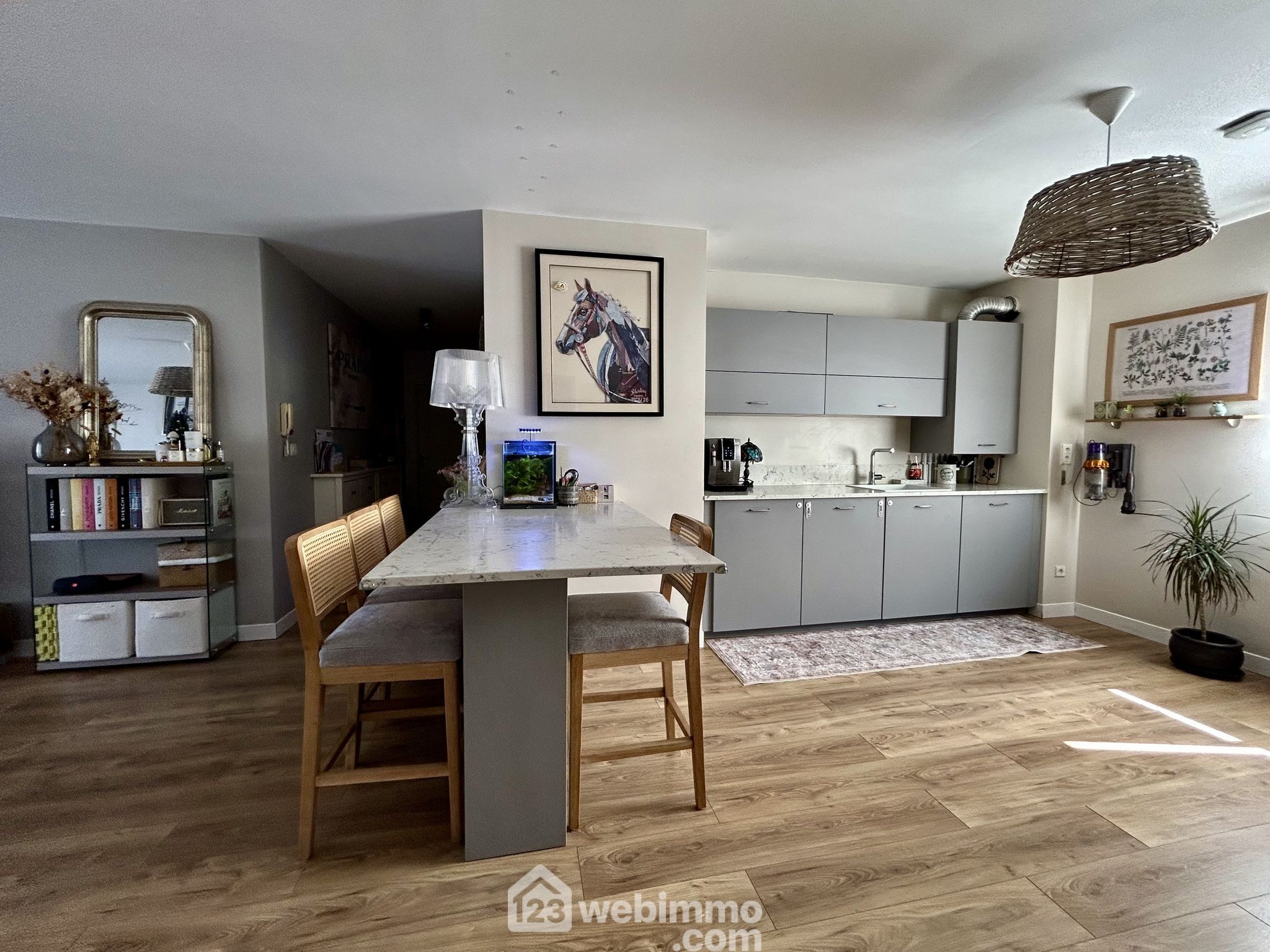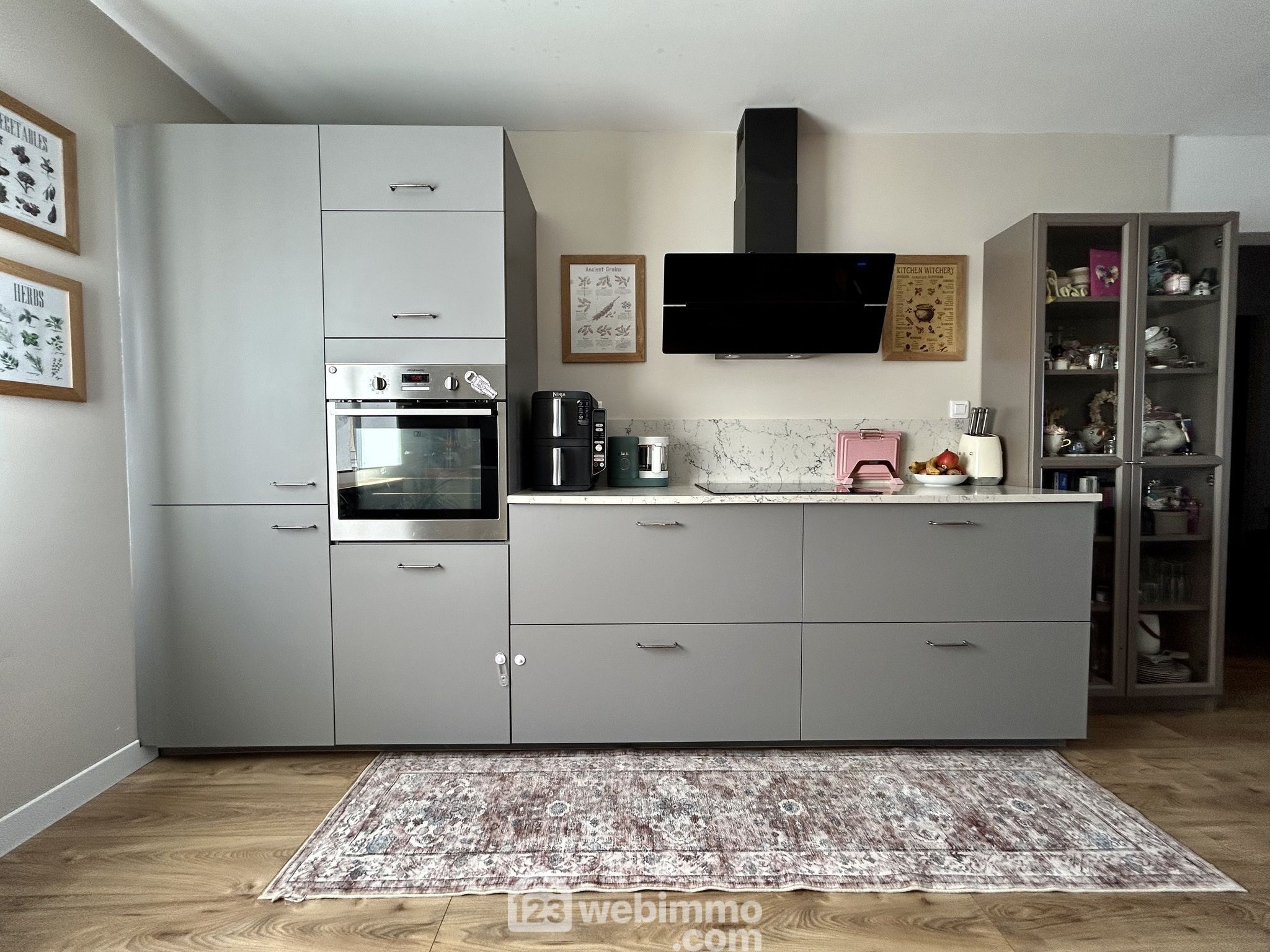 Une pièce de vie de 40 m2 avec un beau parquet qui réuni le séjour et la cuisine US. Celle-ci, de marque Mobalpa, a été posée en 2020.