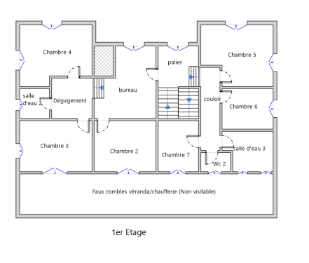 Maison familiale avec 8 chambres, deux salons, cuisine, salle à manger, 3 salles d’eau/salles de bain, buanderie, chaufferie, une belle véranda ouverte sur une cour intimiste, et de généreuses hauteurs sous plafond.