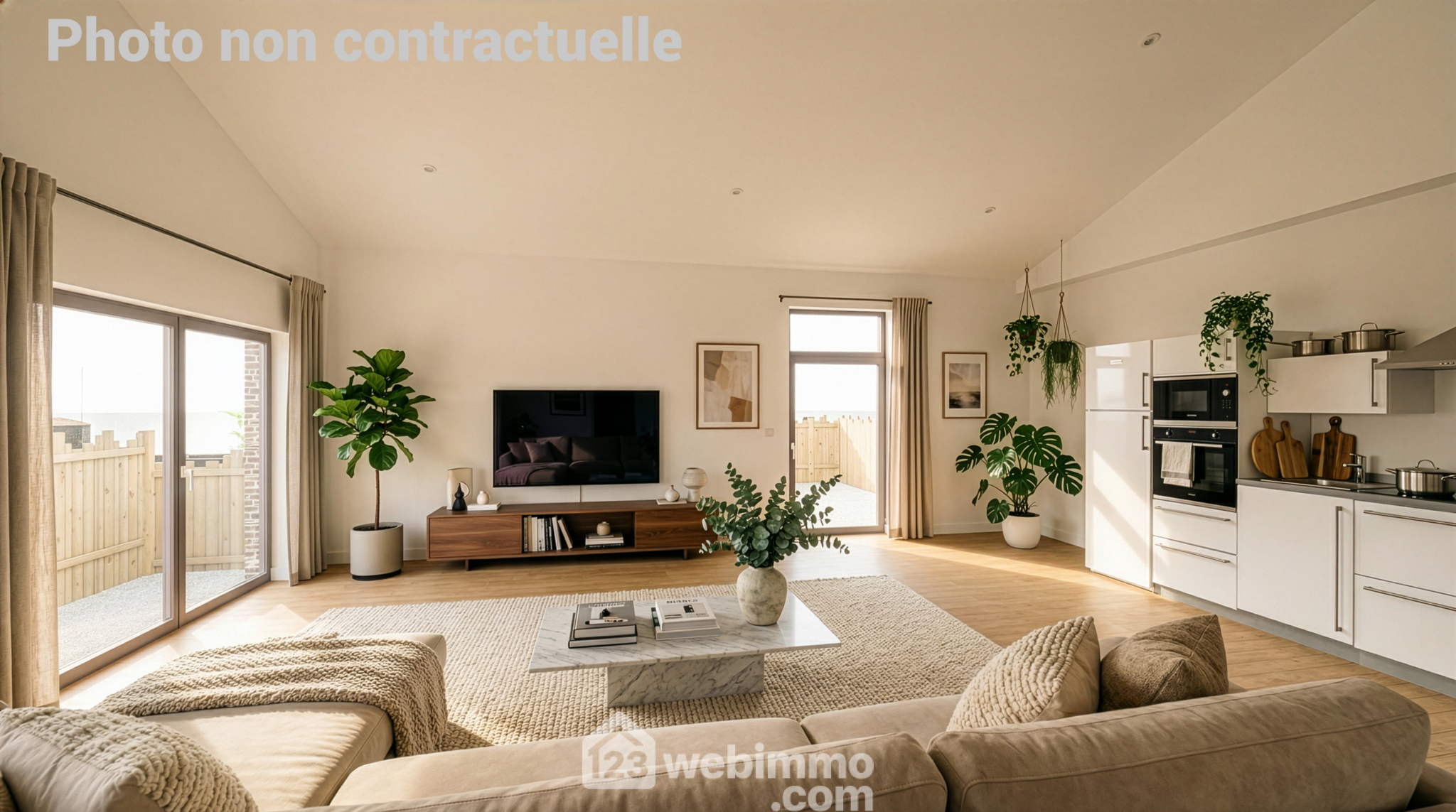L'appartement se compose au rez-de-chaussée : d'un salon/séjour avec cuisine ouverte aménagée équipée (hors réfrigérateur), une salle d'eau, un wc, une chambre et à l'étage : une chambre en mezzanine. En extérieur : une terrasse/cour privative d'environ 24 m² et sa place de stationnement.