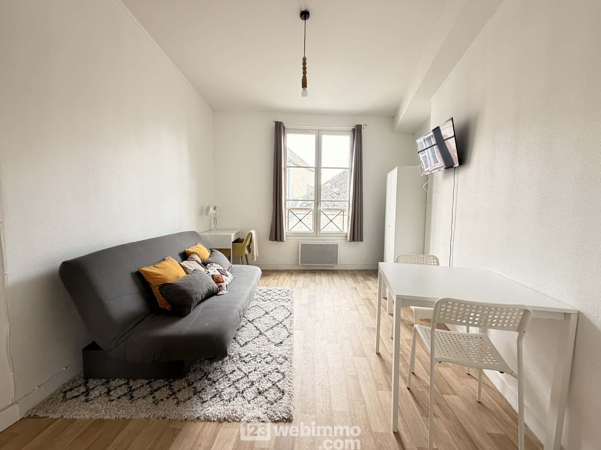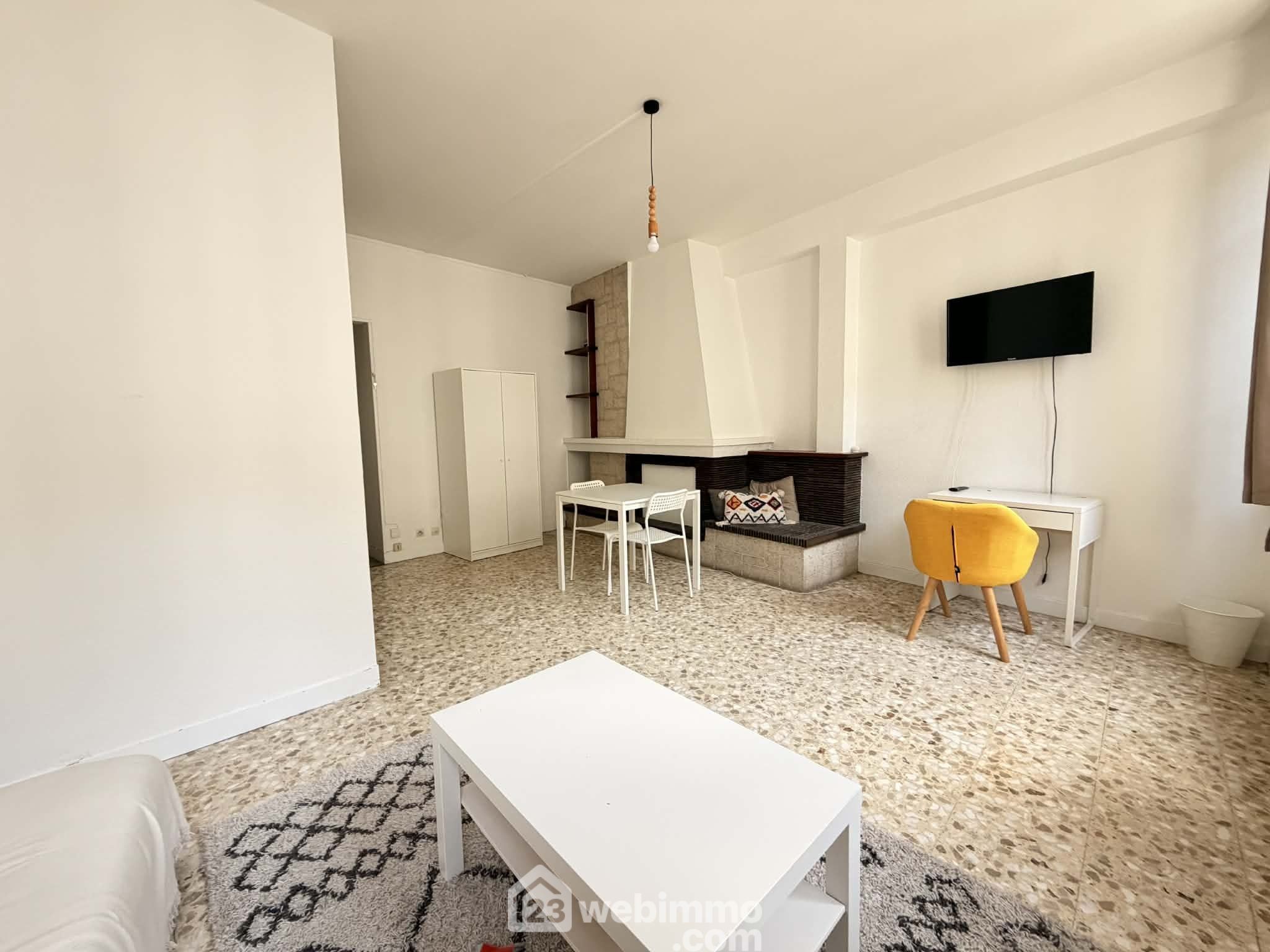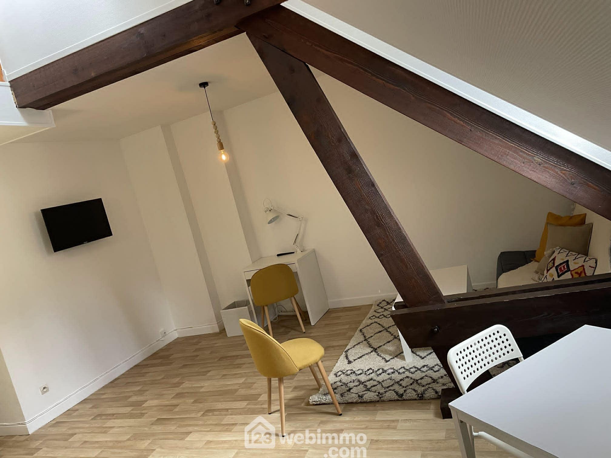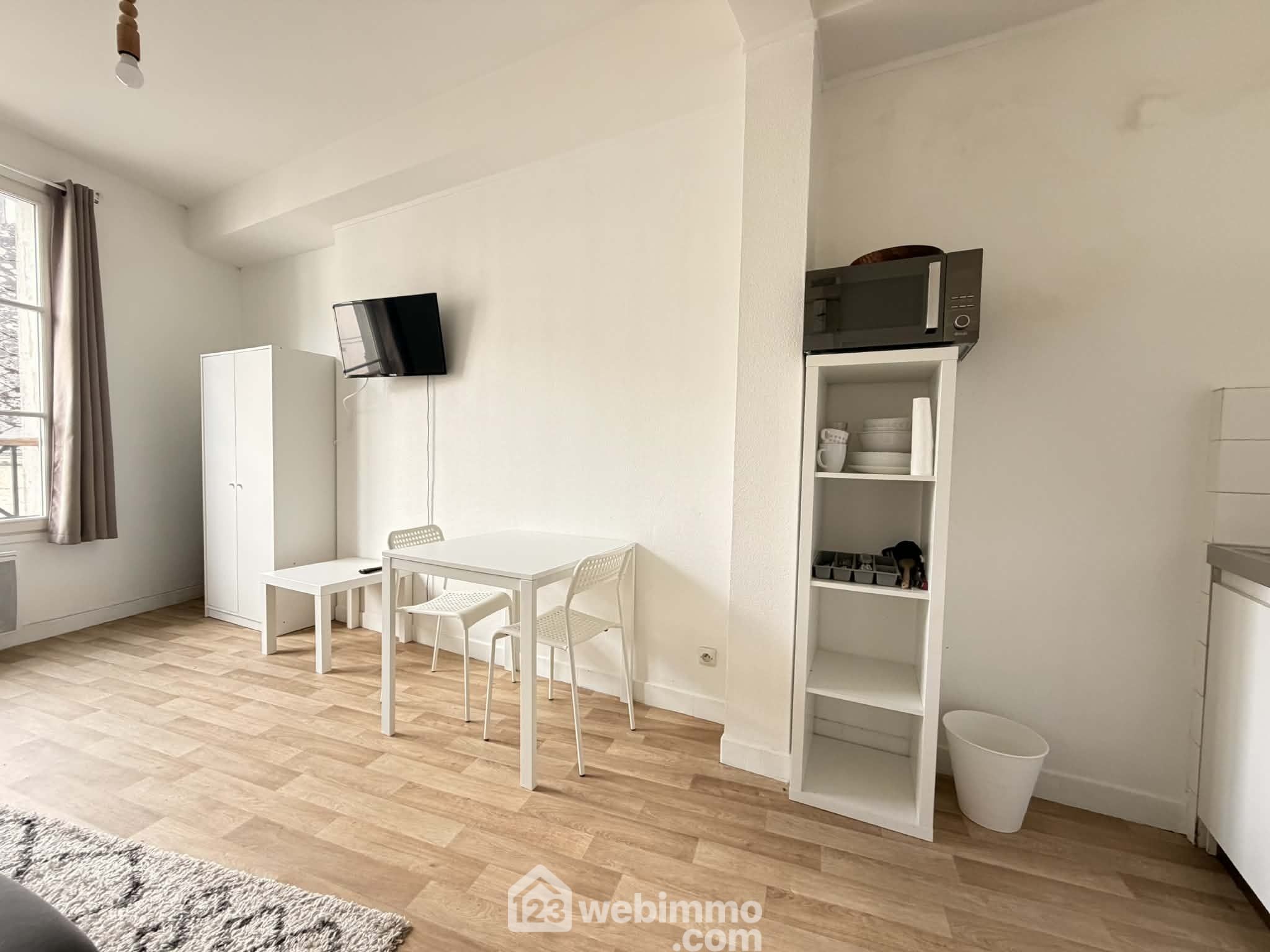 Un studio de 18 m² entièrement meublé avec pièce de vie ouverte sur cuisine et salle de bains, louable entre 350 € et 400 € / mois