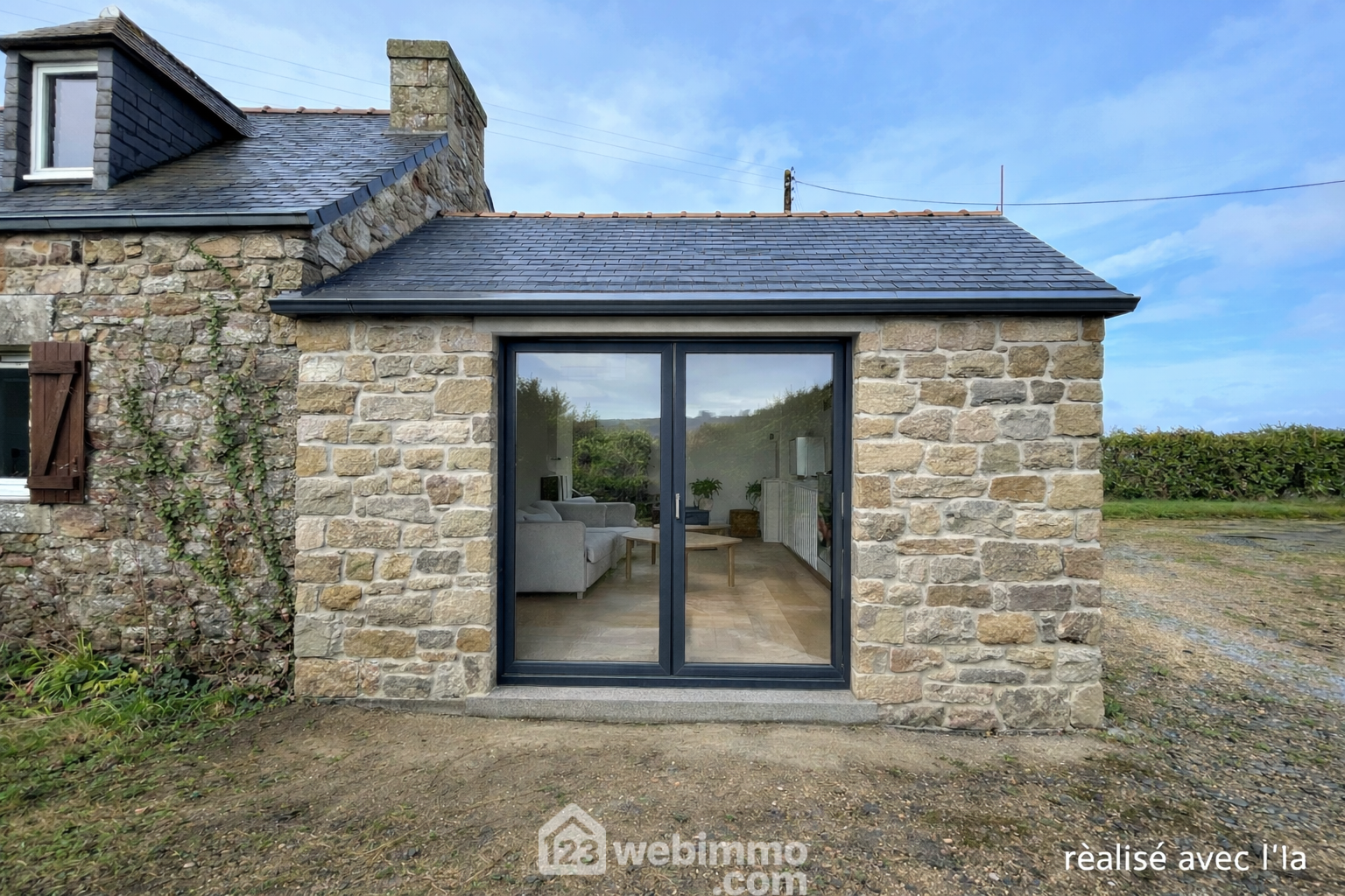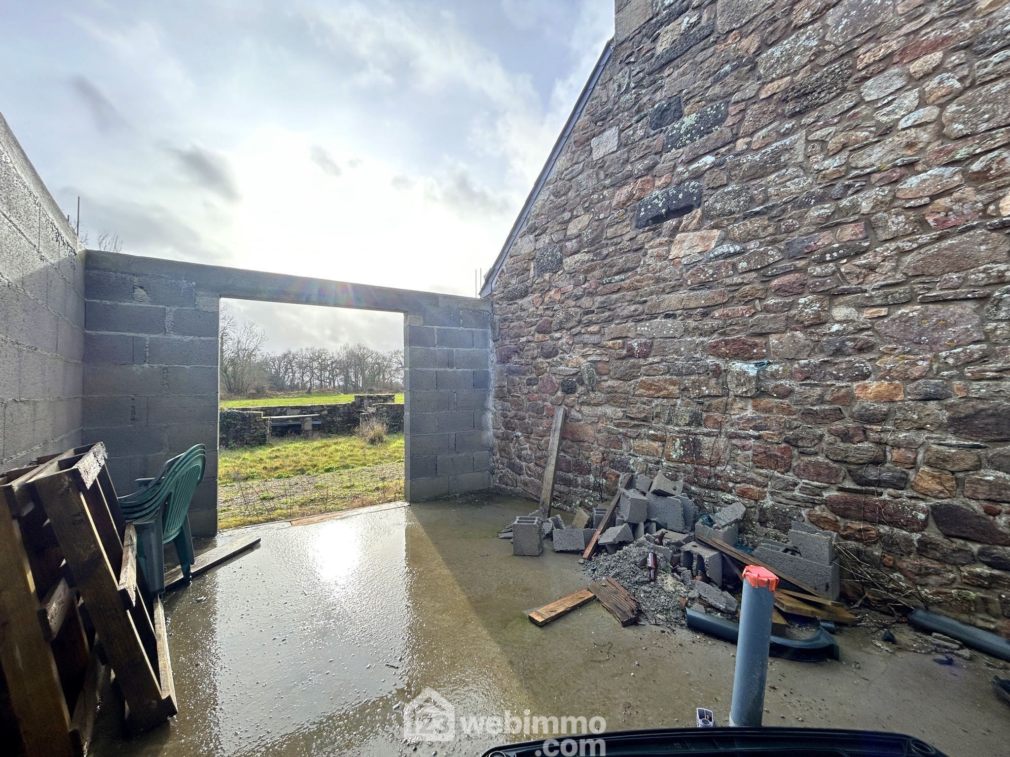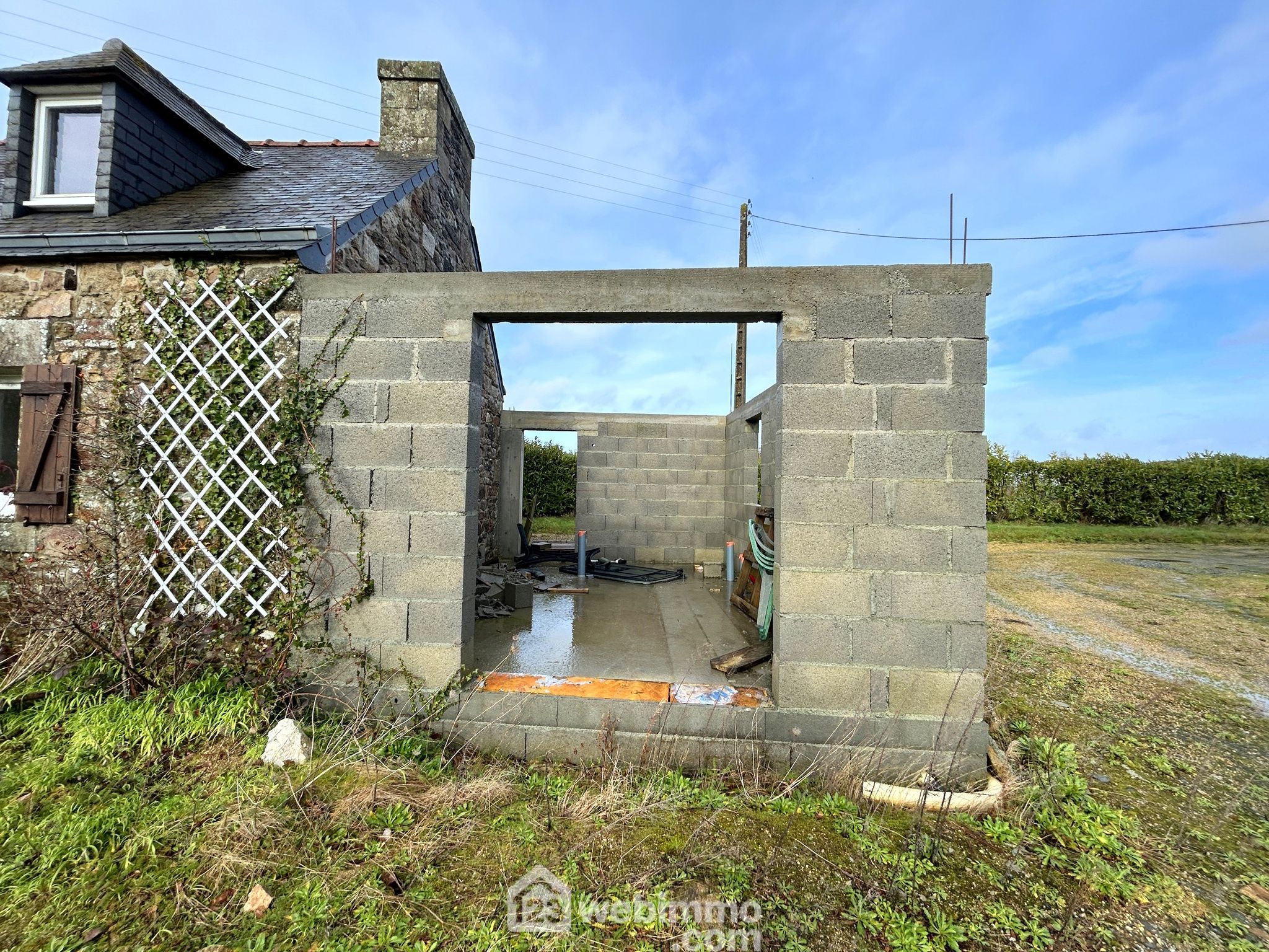 Un agrandissement en parpaing a été commencé afin d’augmenter la surface habitable de 20m² ; il reste à finaliser selon vos envies.