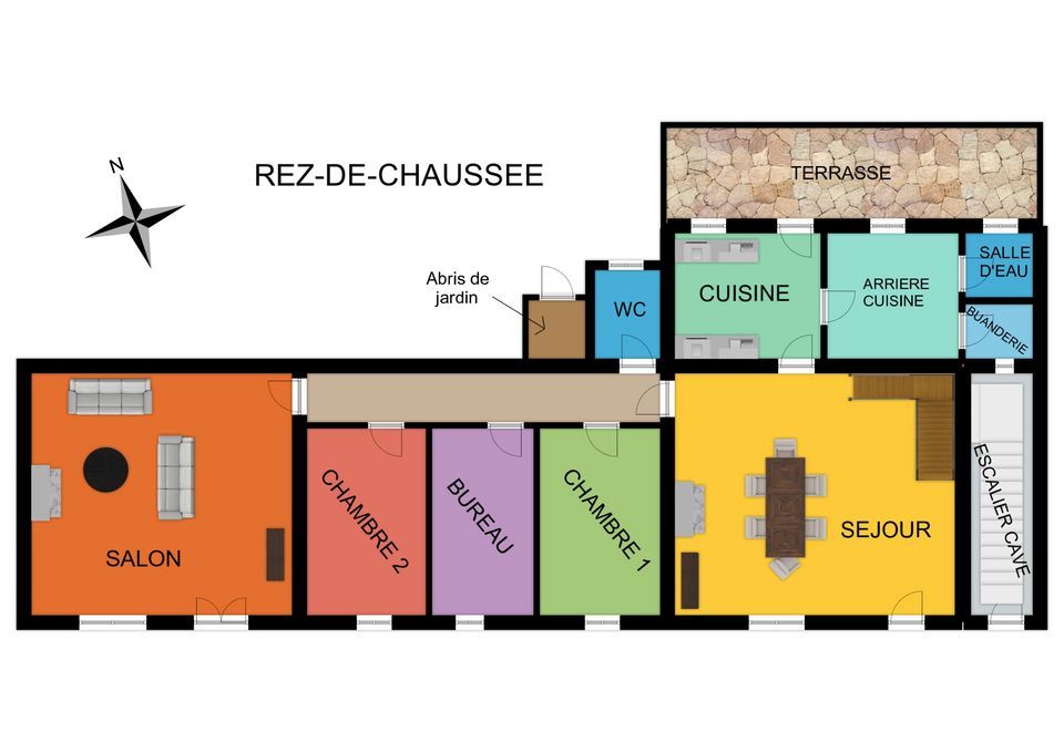 Maison avec vie de plain-pied, 160 m2 habitables, 6 pièces, 3 chambres, bureau, garage et dépendances, sur terrain de 10 500 m2.