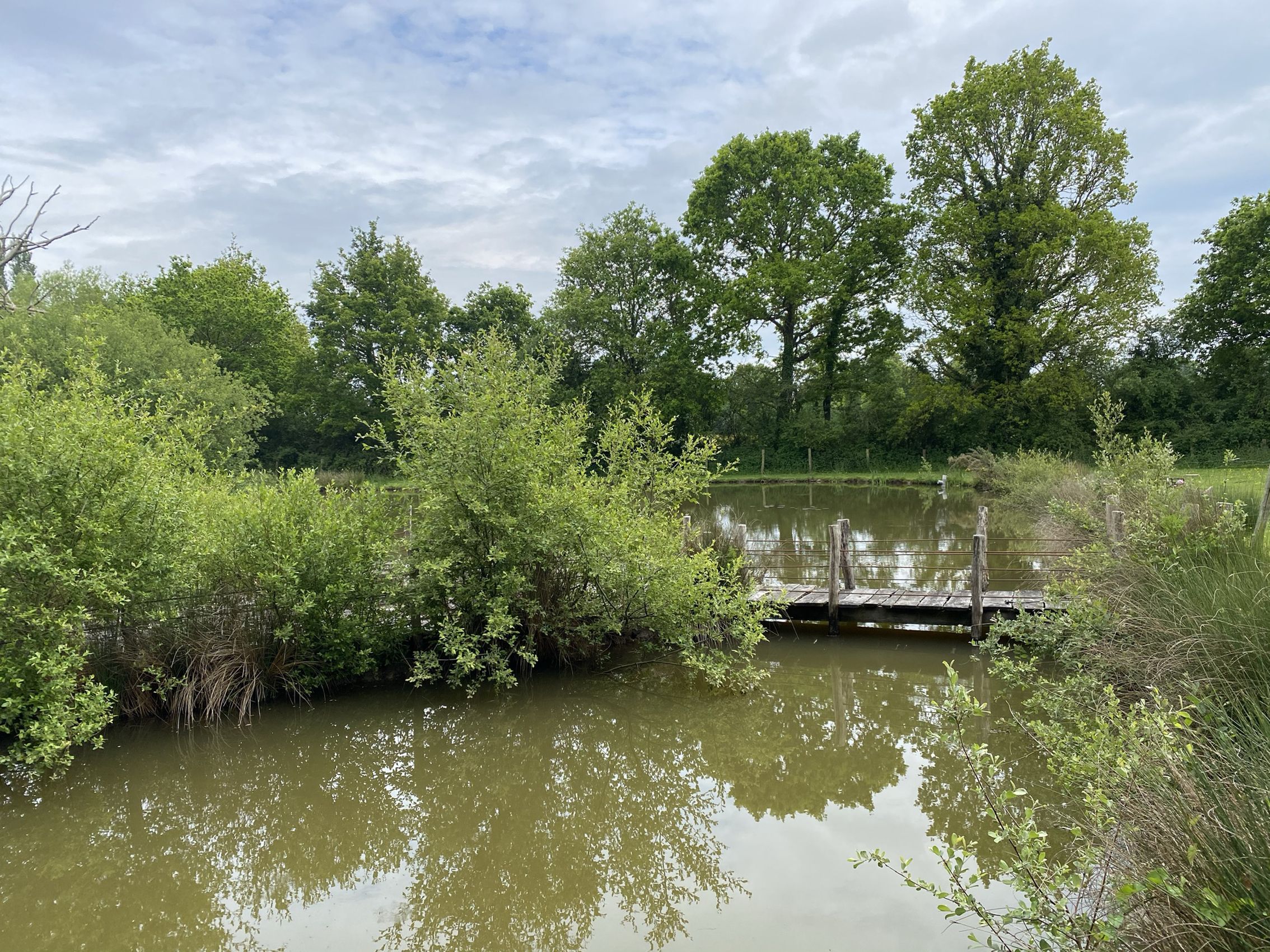 d'une terrasse depuis laquelle sont accessible des toilettes sèches et un sauna avec une vue imprenable sur l'étang