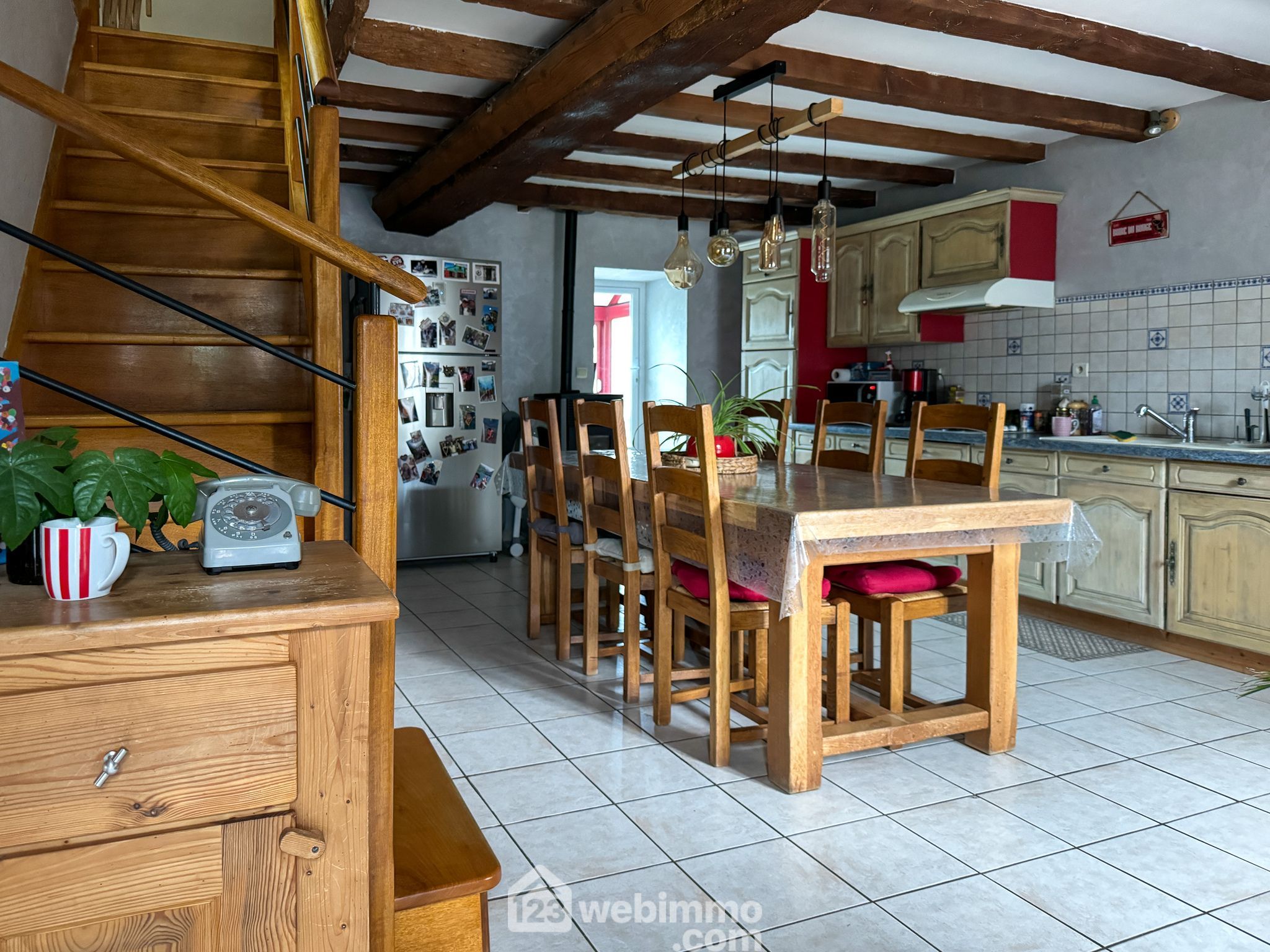 Une cuisine aménagée et équipée de 30m2 est le point d'entrée de la maison, elle est accueillante et permet l'accès aux pièces de la maison. Le salon avec le charme des pierres et sa lumière traversante vous offre une espace chaleureux et un accès à une terrasse exposée nord-est.