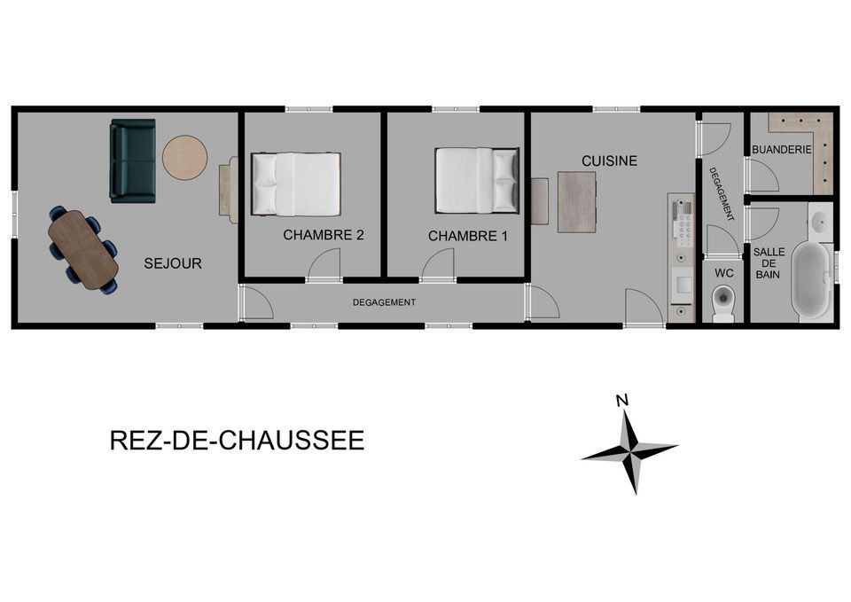 Au rez-de-chaussée : cuisine (17 m2), séjour avec cheminée (29 m2), 2 chambres, buanderie, salle de bain, WC séparé.