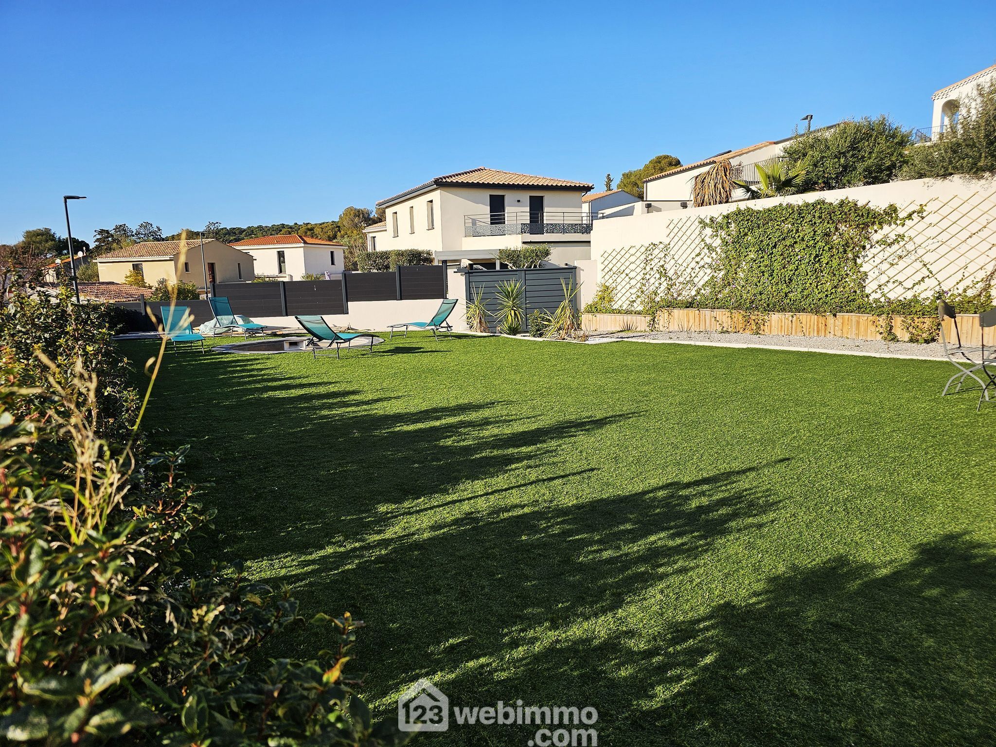 Le séjour, baigné de lumière, s’ouvre sur un agréable espace extérieur comprenant une terrasse, un jardin plat et une petite piscine en rond, parfaits pour profiter pleinement du climat méditerranéen.