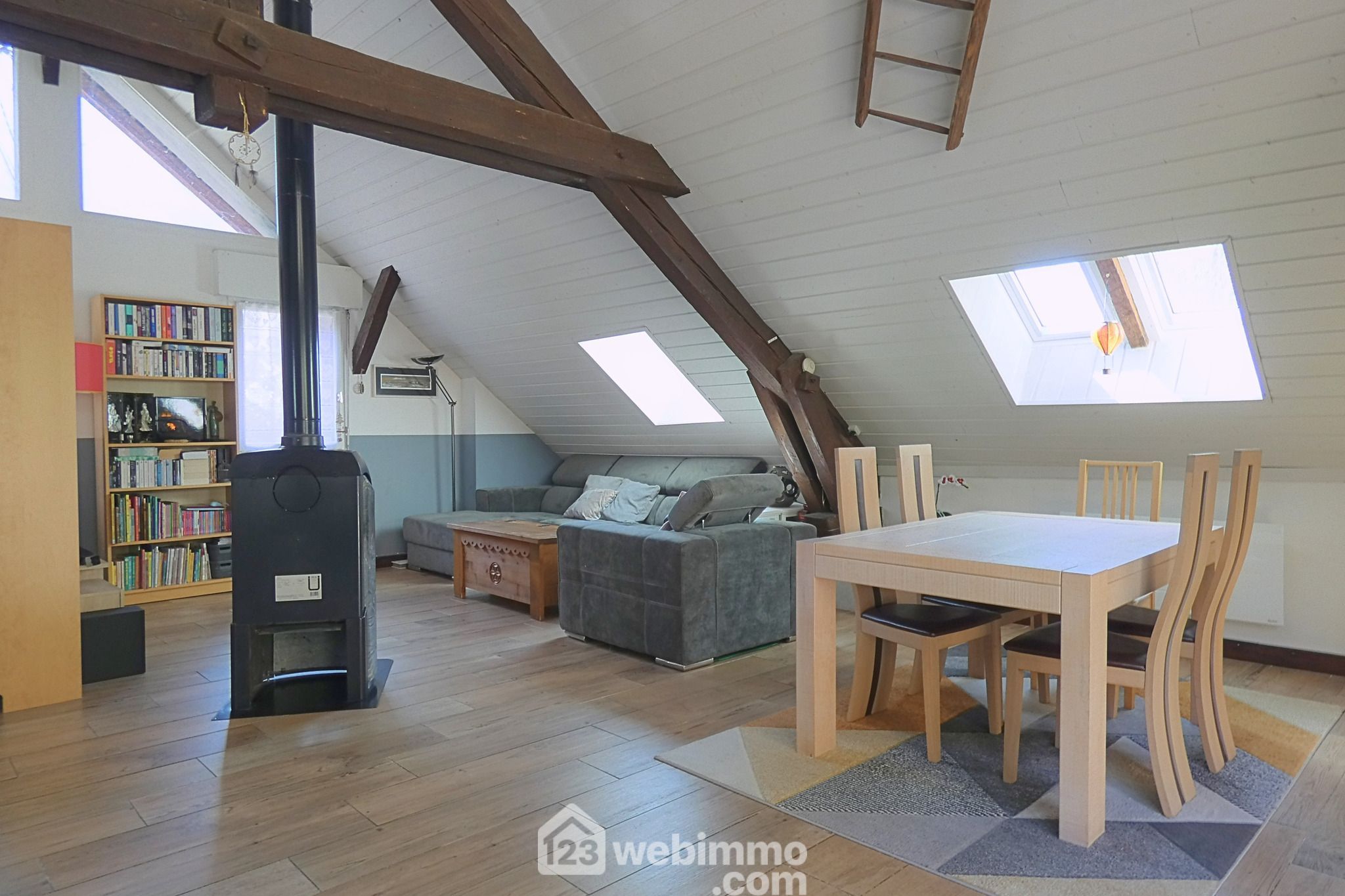 Une superbe pièce de vie baignée de lumière, sublimée par ses poutres apparentes qui rappellent l’histoire du lieu. Le poêle à bois apporte en plus une atmosphère chaleureuse. La cuisine équipée s’intègre harmonieusement à cet espace, créant un lieu de vie idéal pour partager des moments conviviaux.
