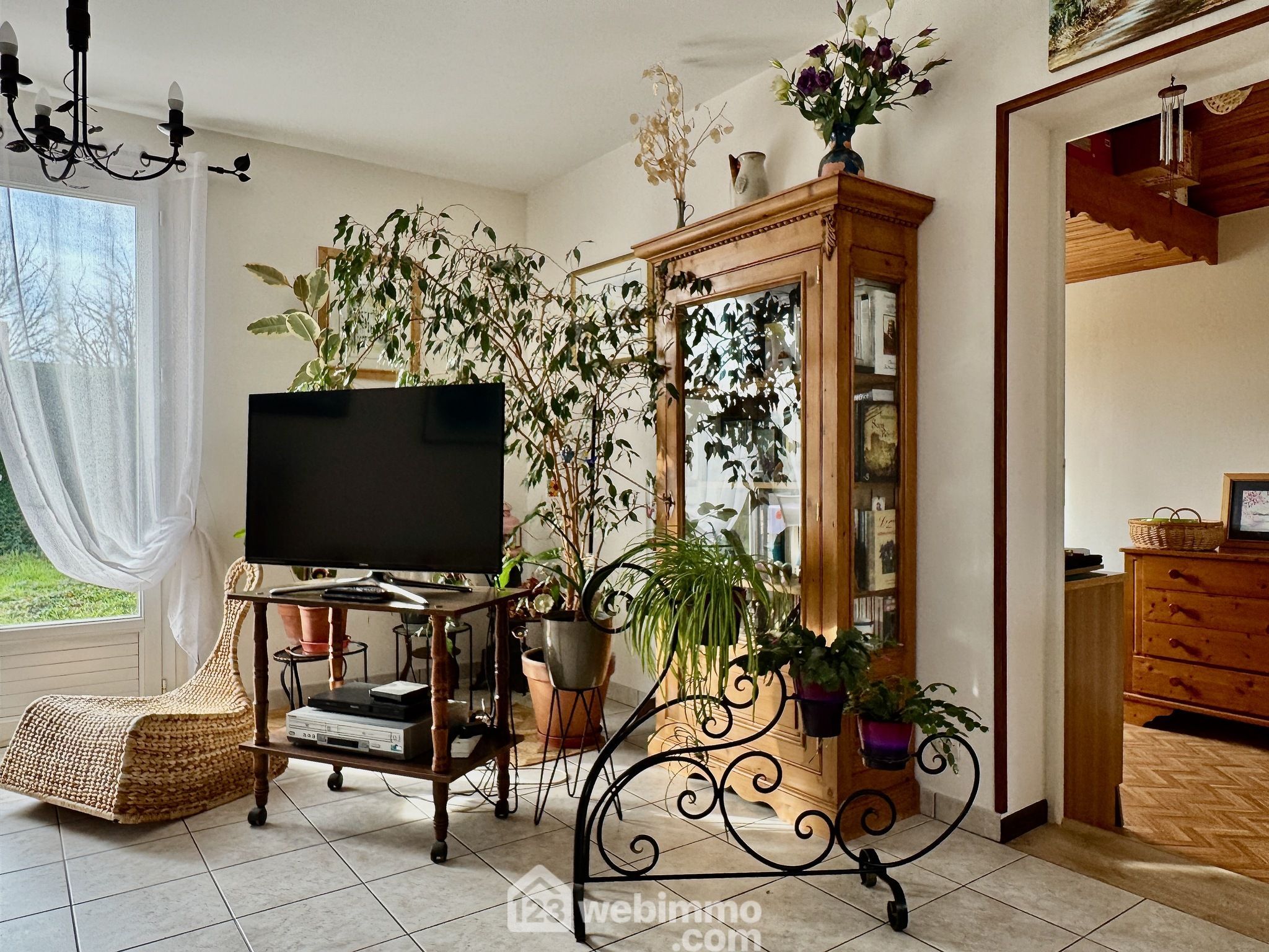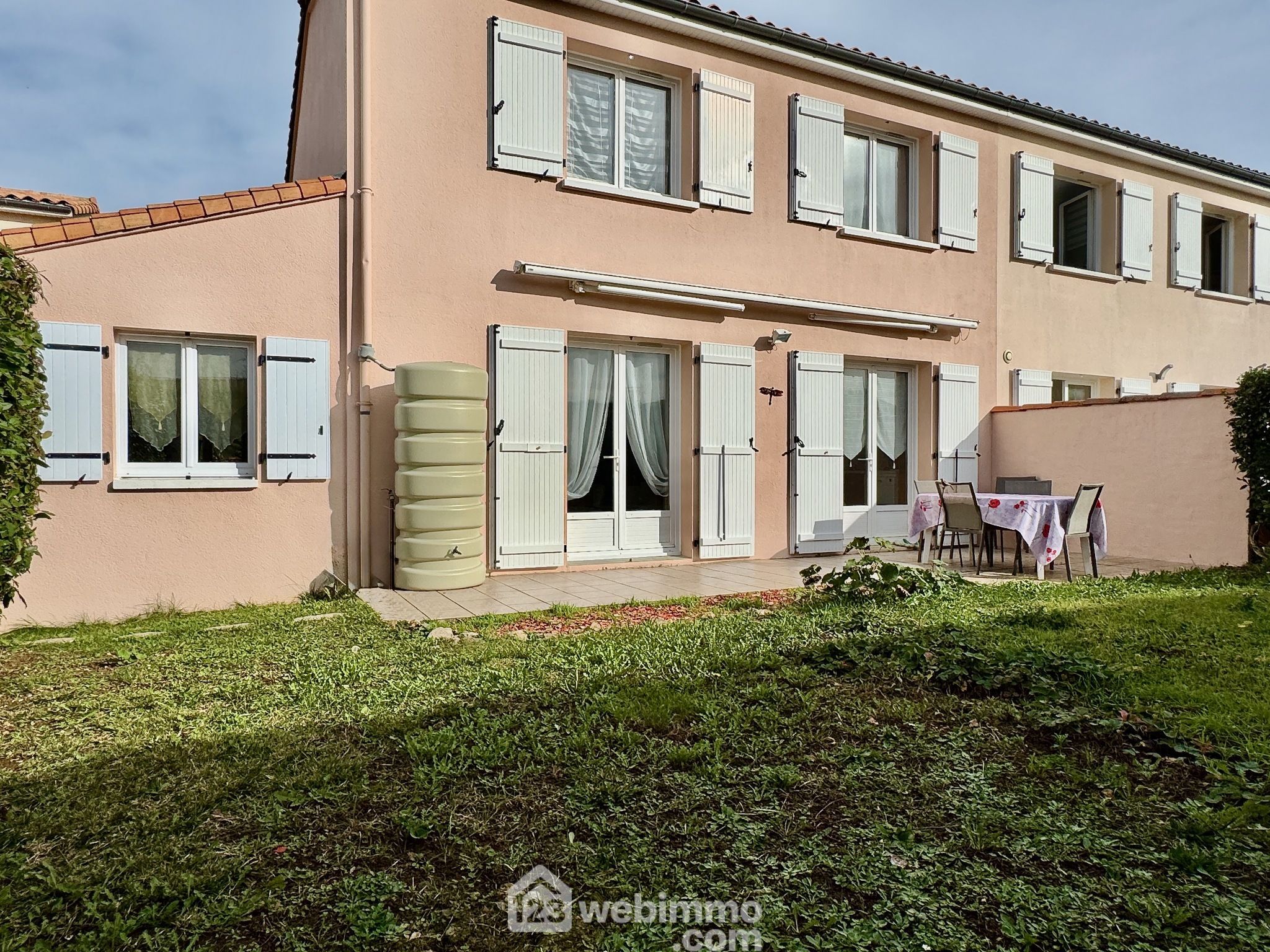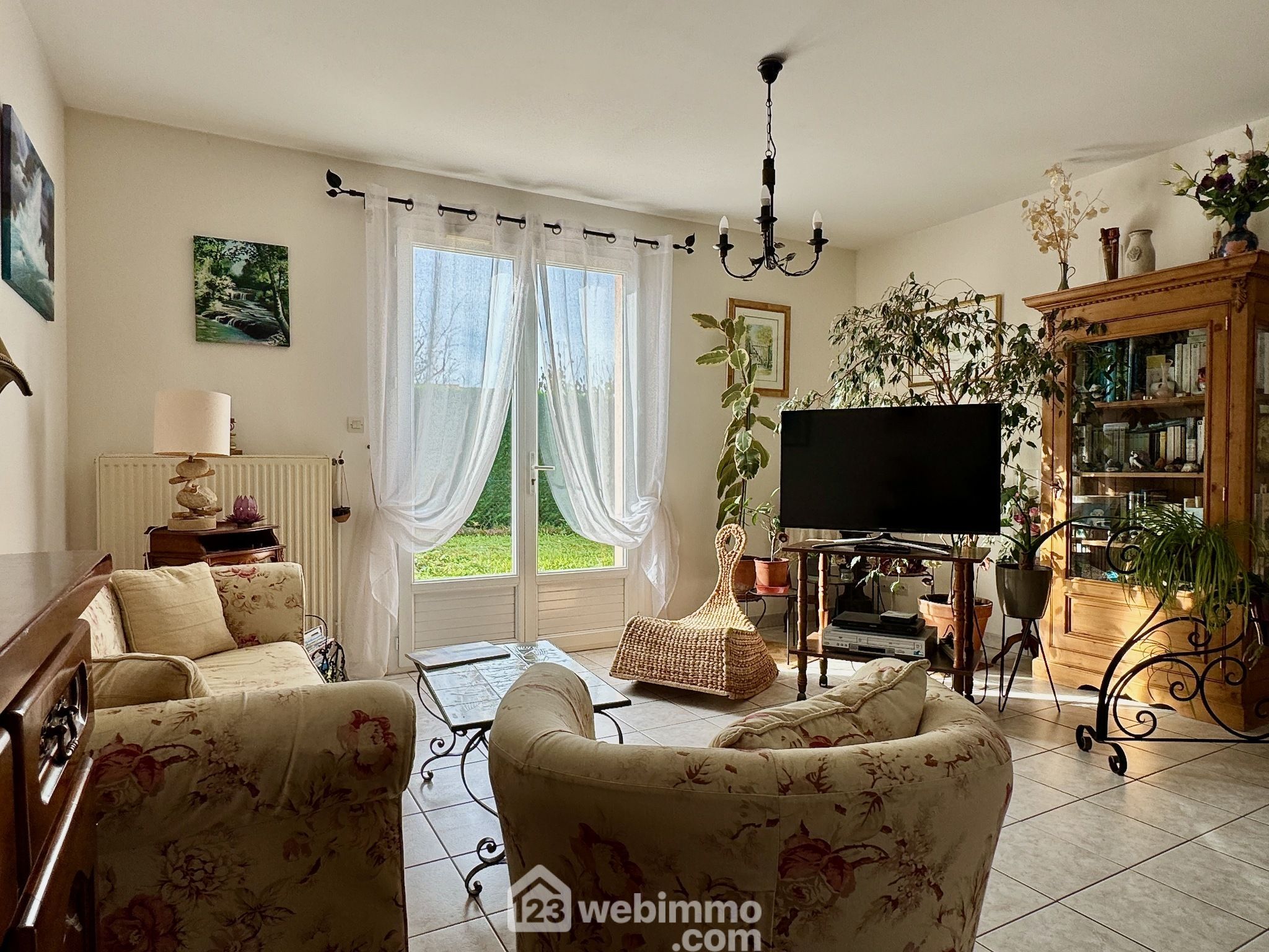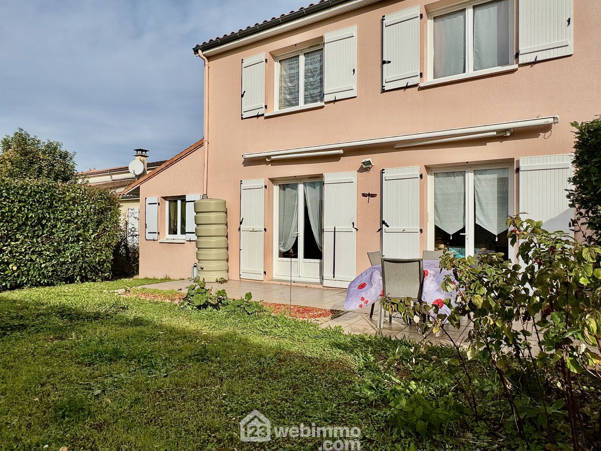 Terrain plat, arboré, fleuri et totalement clos. Terrasse exposée Sud avec store banne.