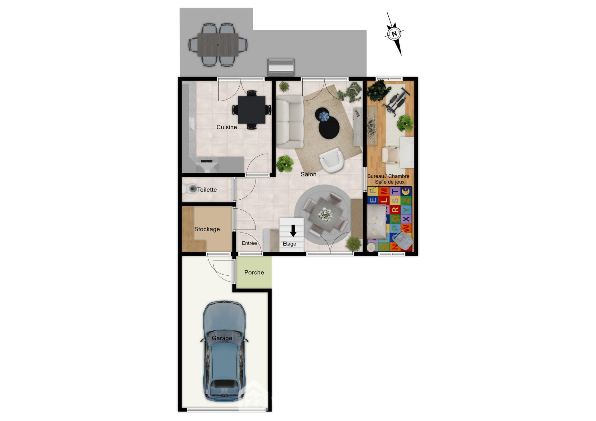 Au rez-de-chaussée : entrée, cuisine aménagée et équipée traditionnelle, séjour avec lumière traversante, chambre, WC, cellier-buanderie et garage avec porte motorisée.