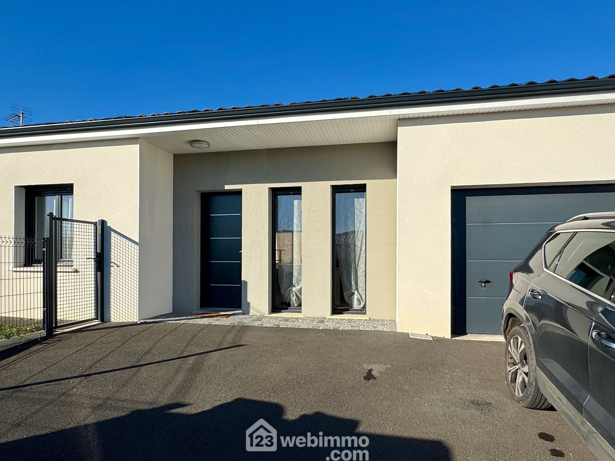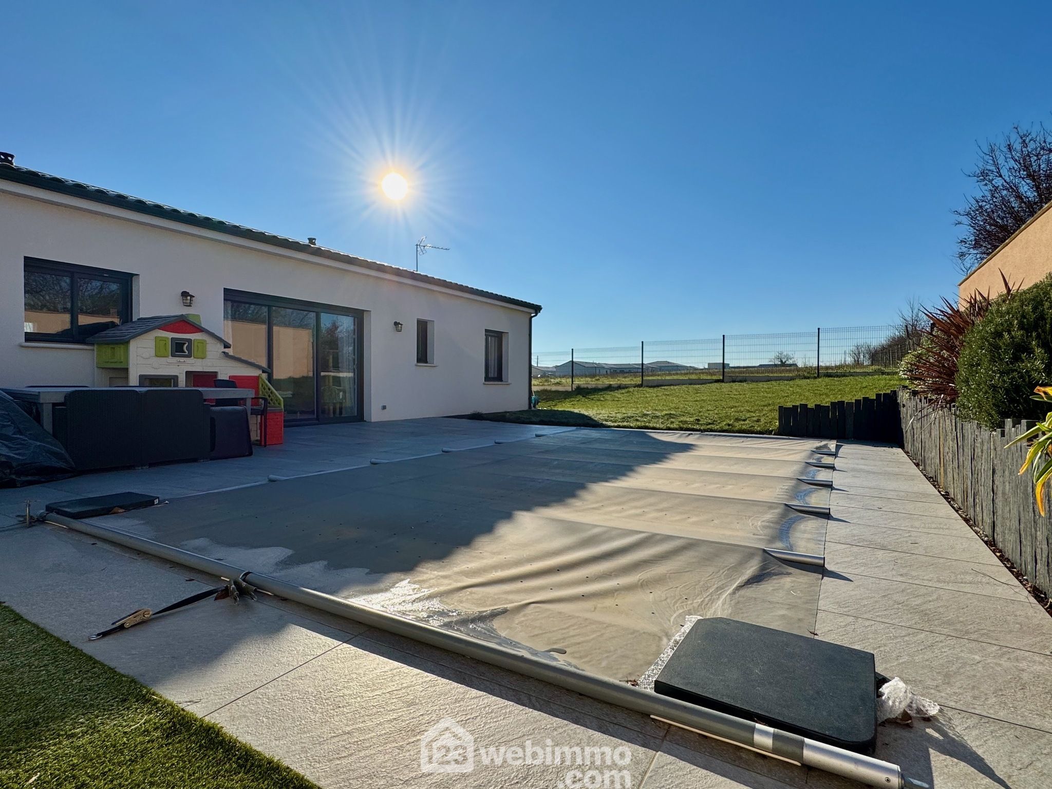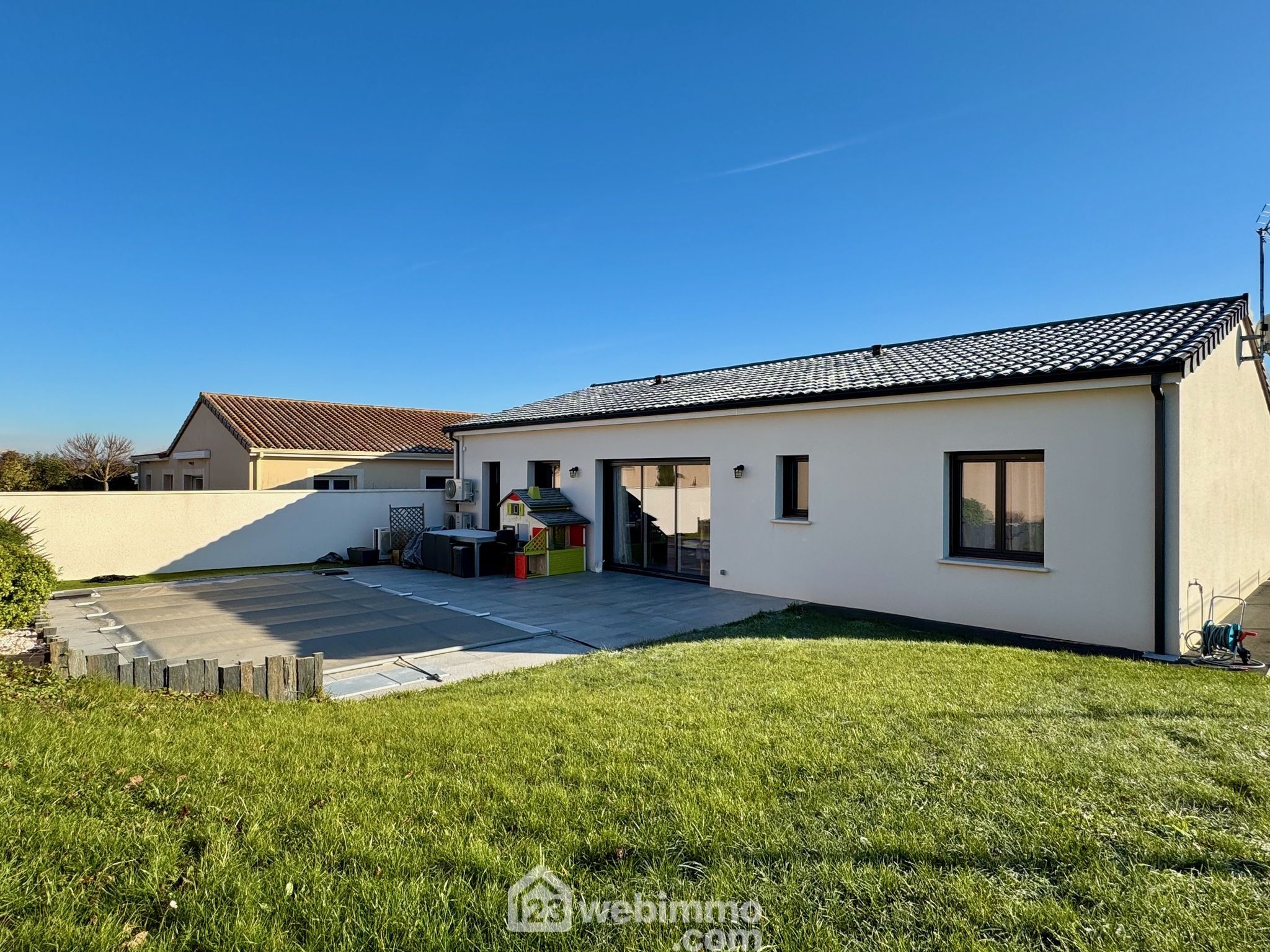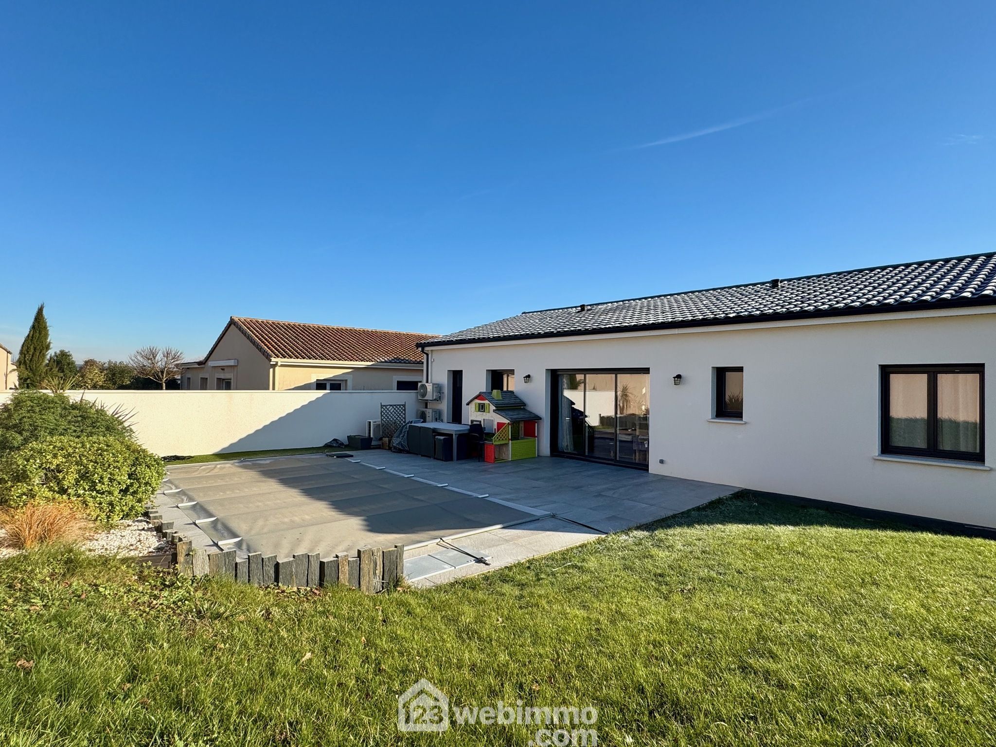 Pavillon plain-pied de 2019, 102 m2 habitables, 4 pièces, 3 chambres, cellier-chaufferie, garage, piscine, terrain de 450 m2.