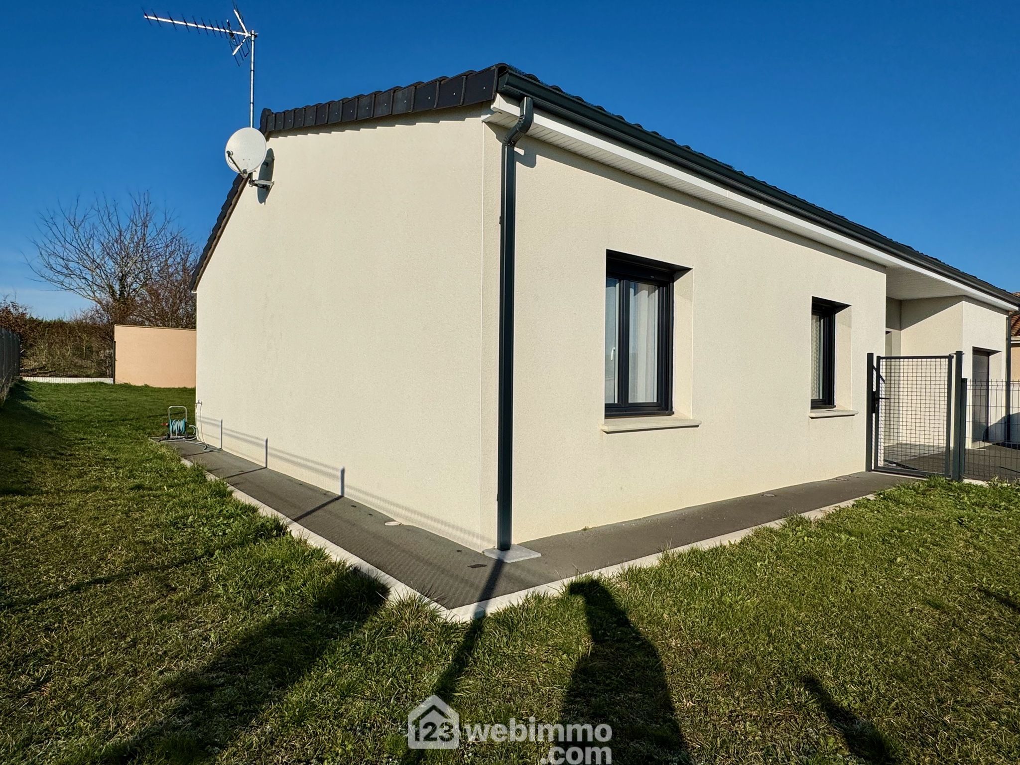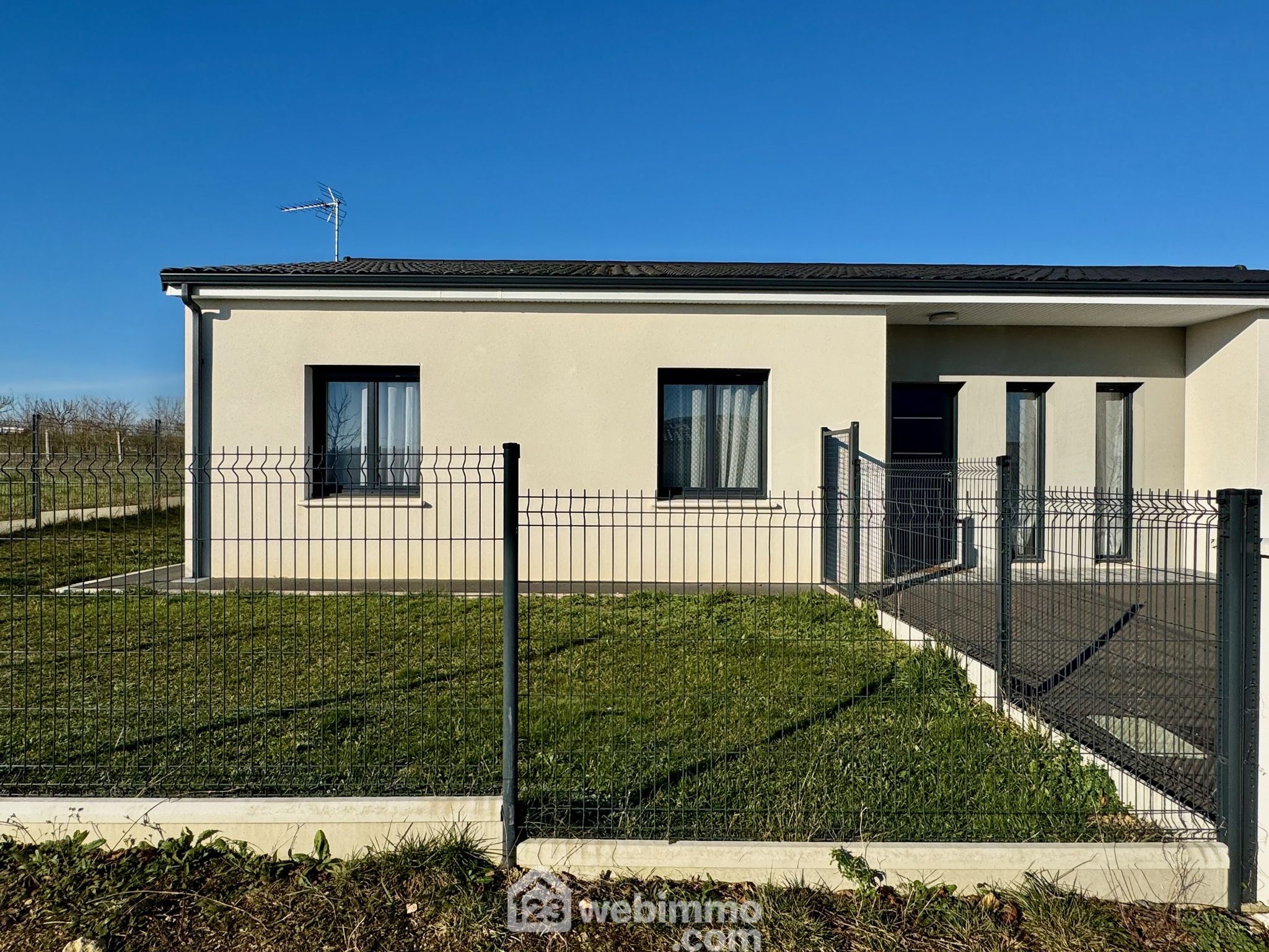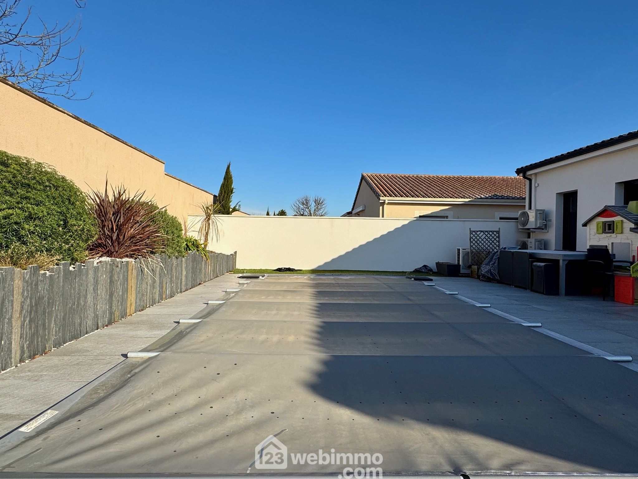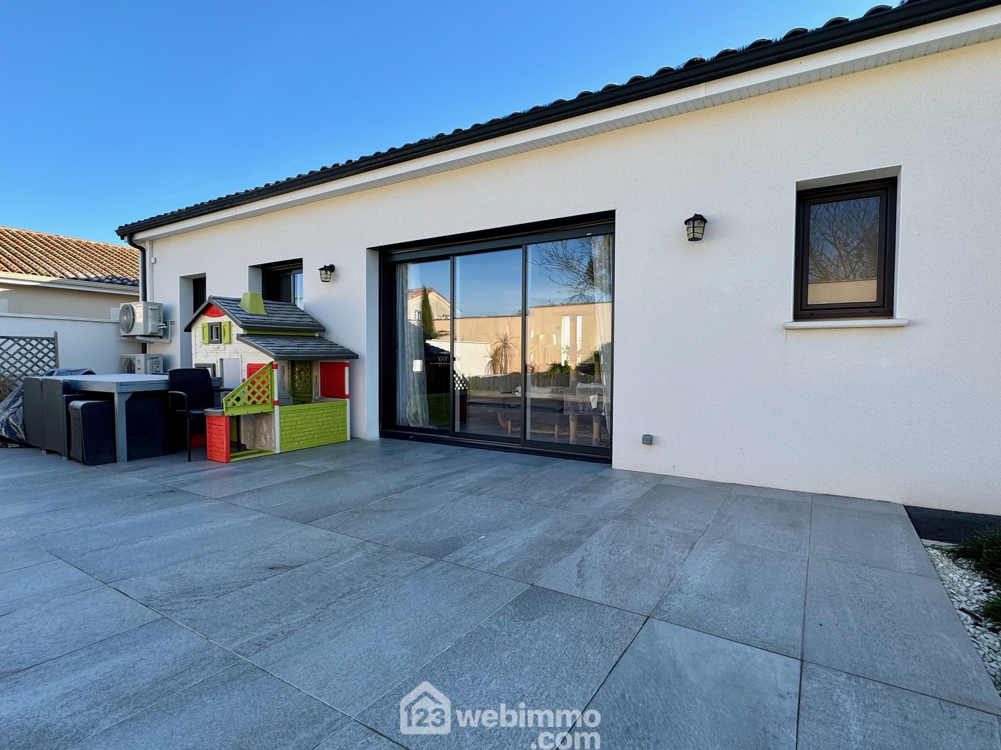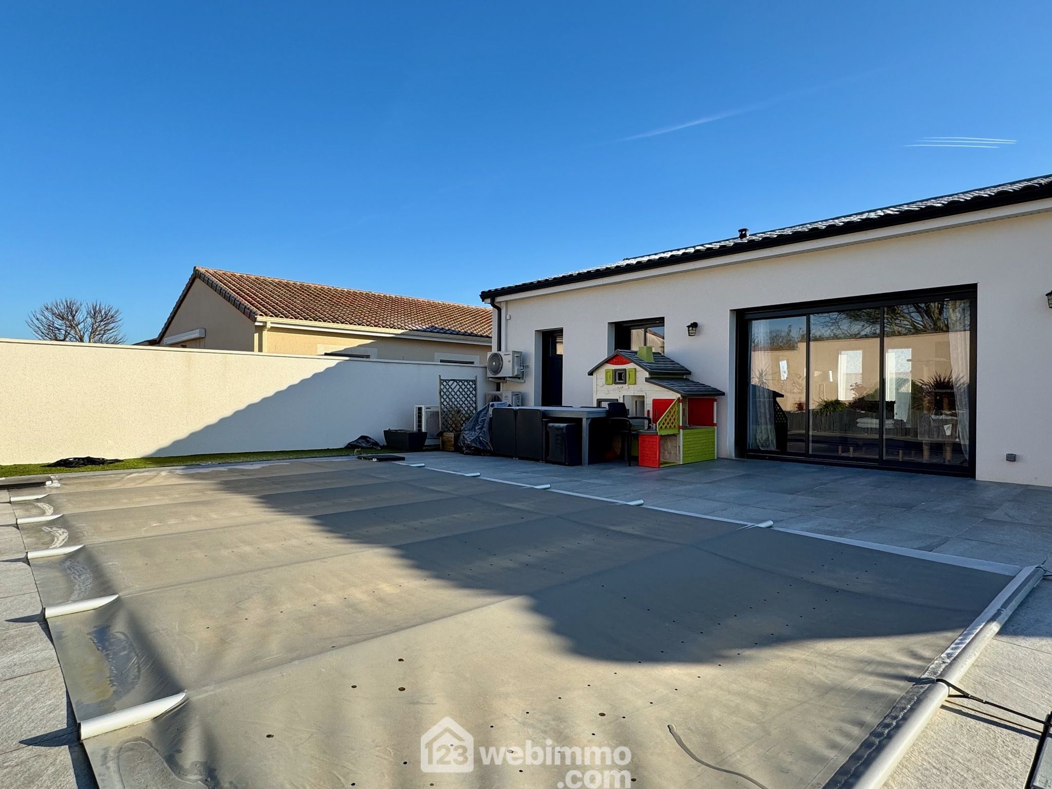 Pavillon plain-pied de 2019, 102 m2 habitables, 4 pièces, 3 chambres, cellier-chaufferie, garage, piscine, terrain de 450 m2.