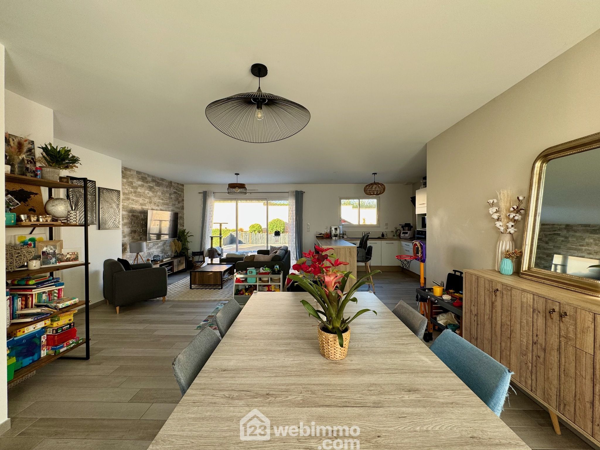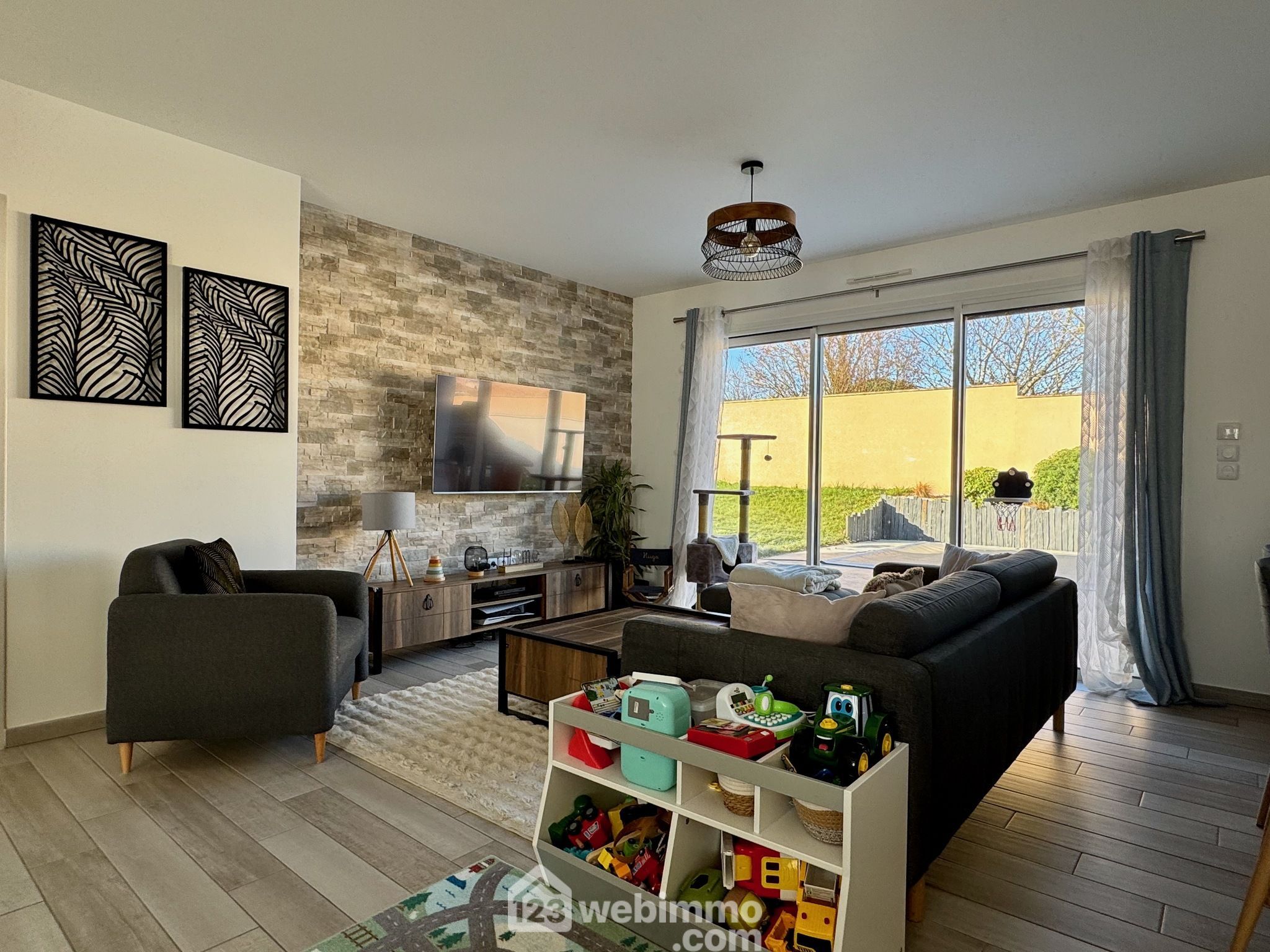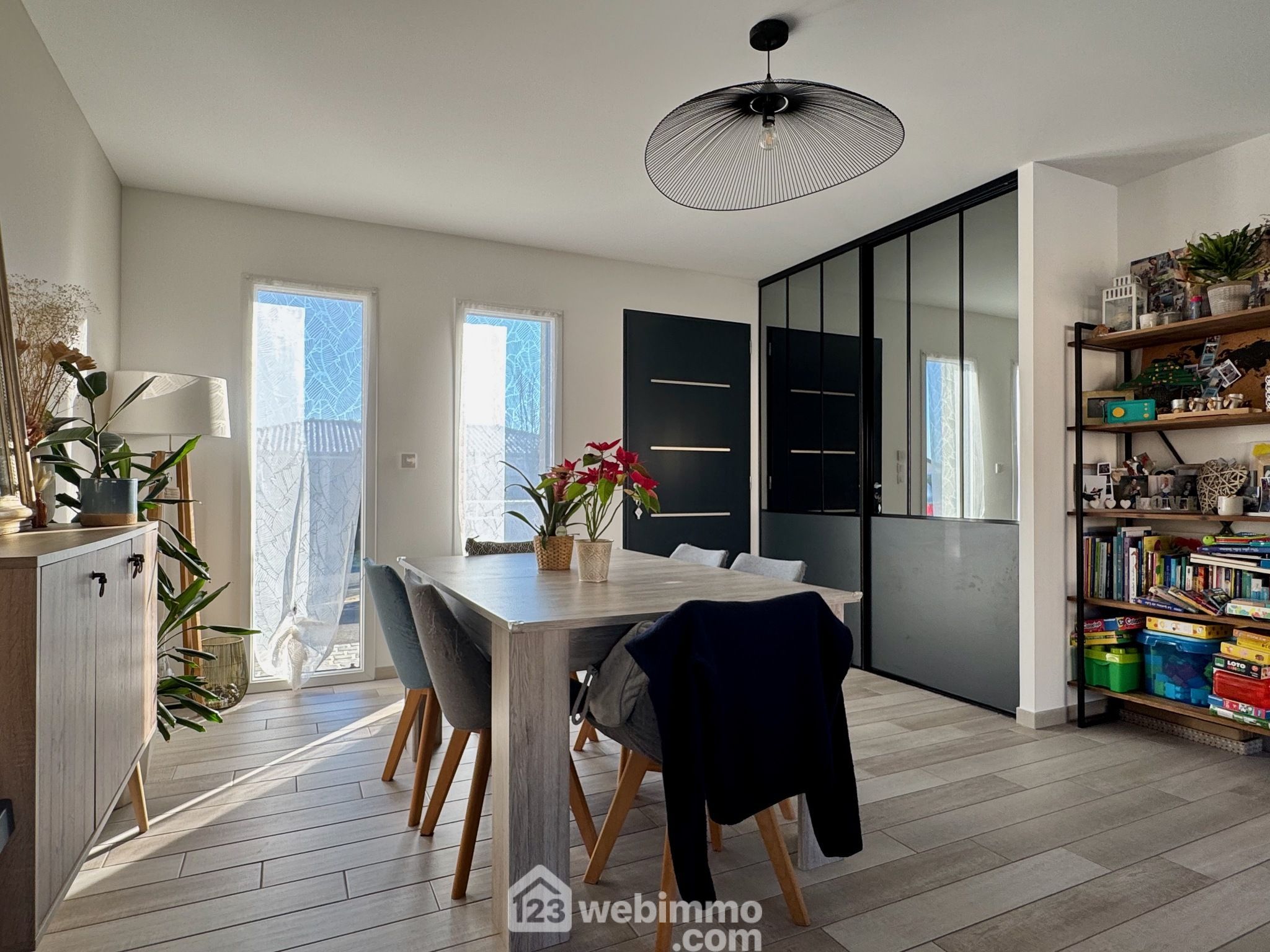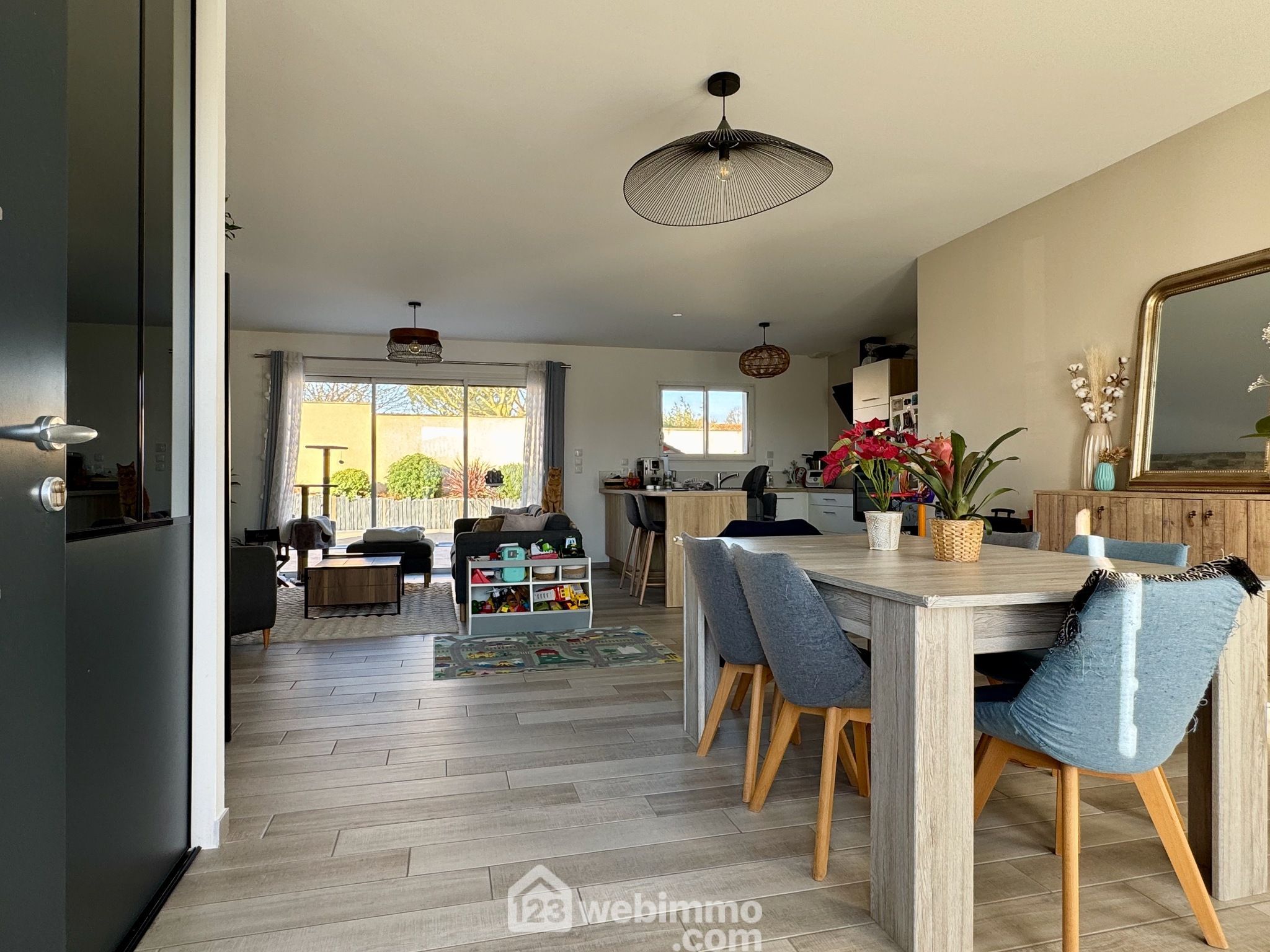 Pavillon plain-pied de 2019, 102 m2 habitables, 4 pièces, 3 chambres, cellier-chaufferie, garage, piscine, terrain de 450 m2.