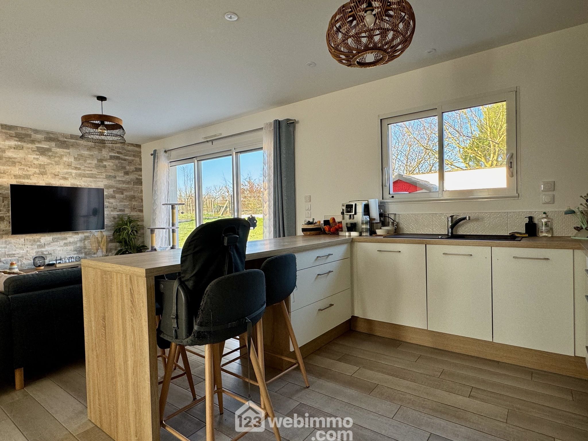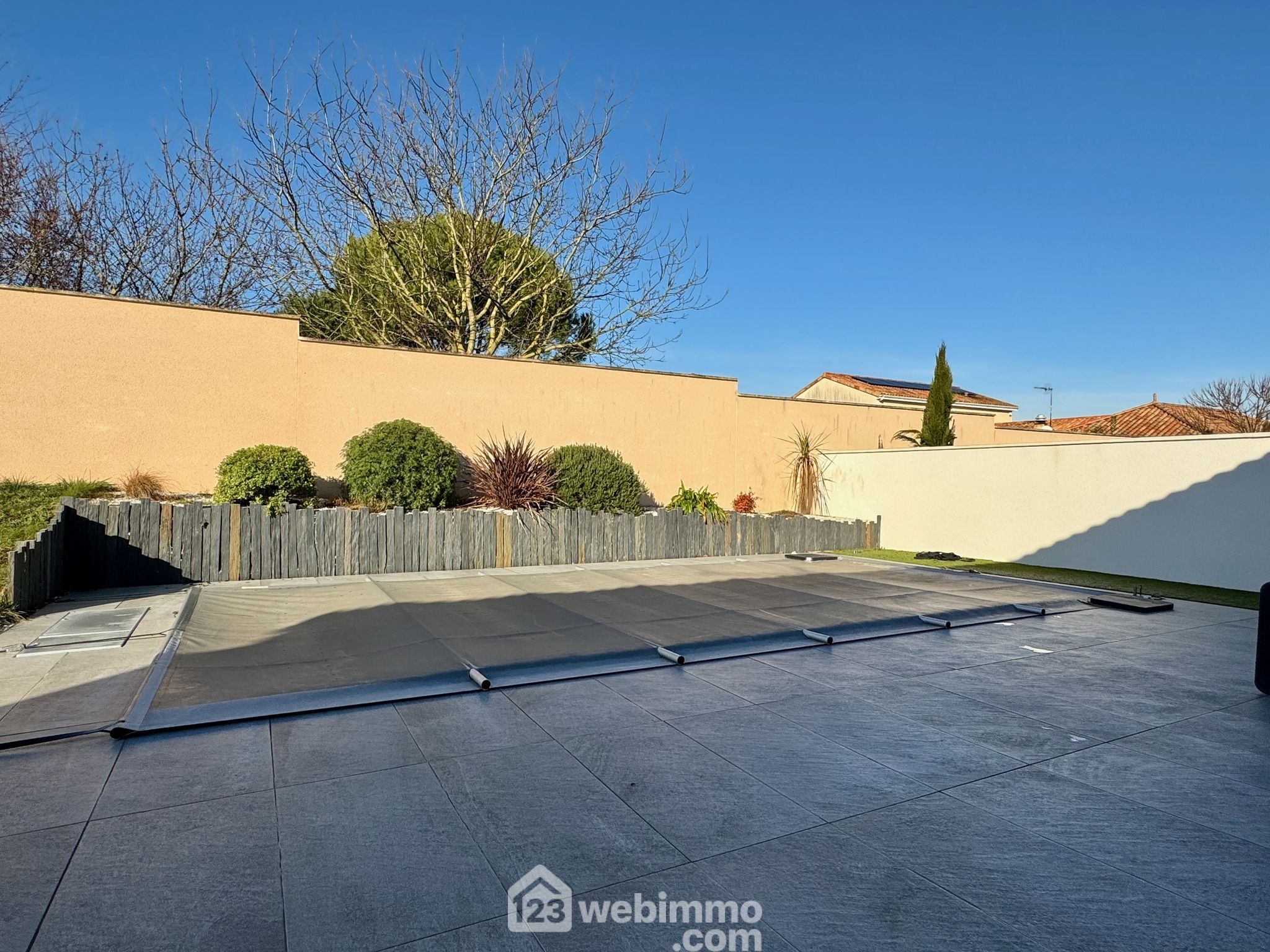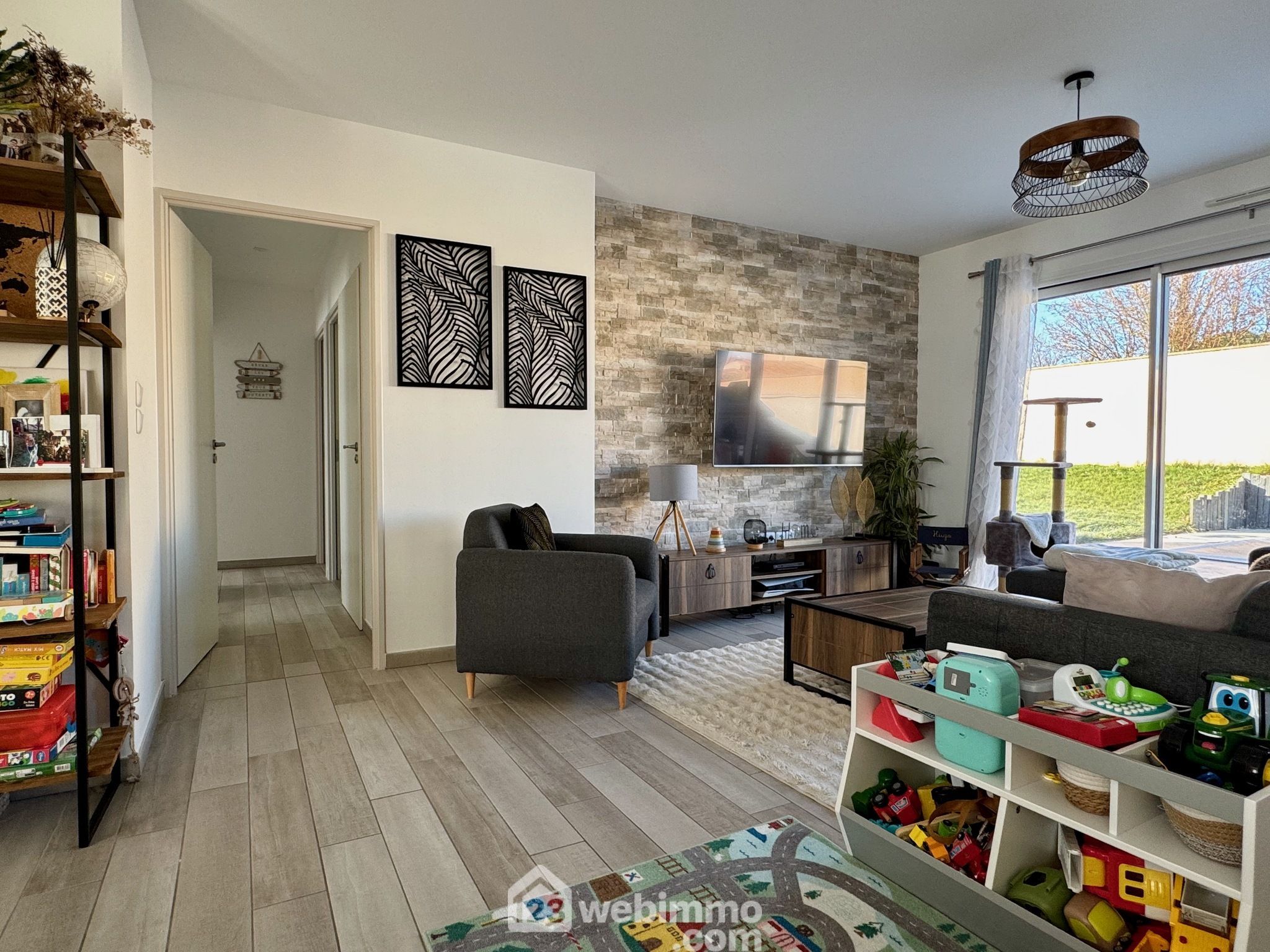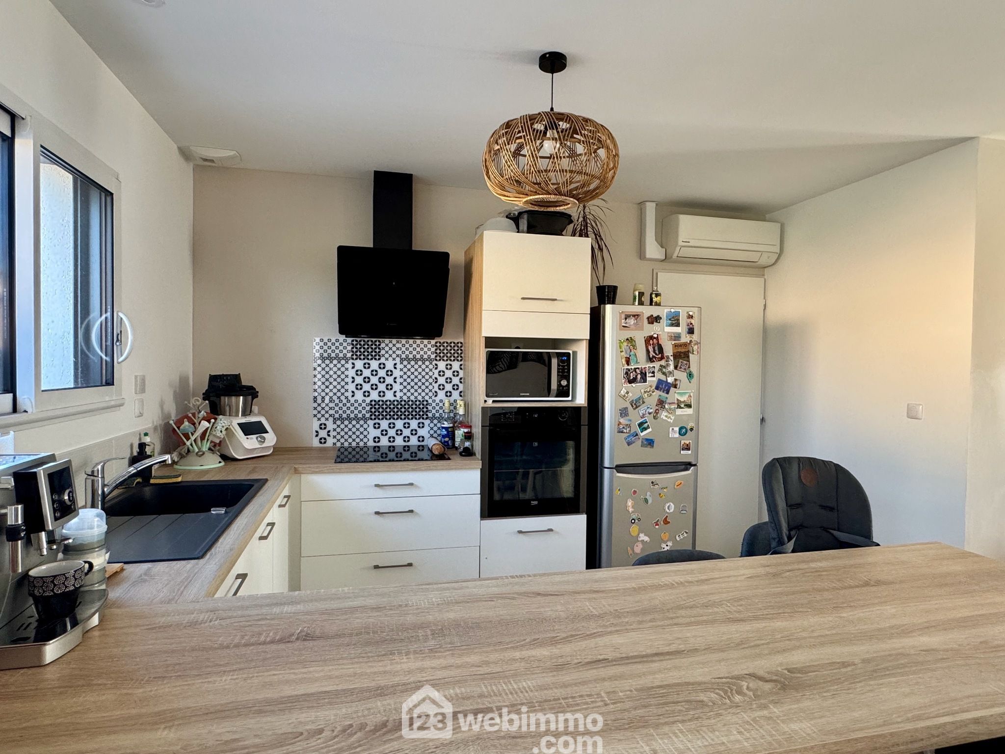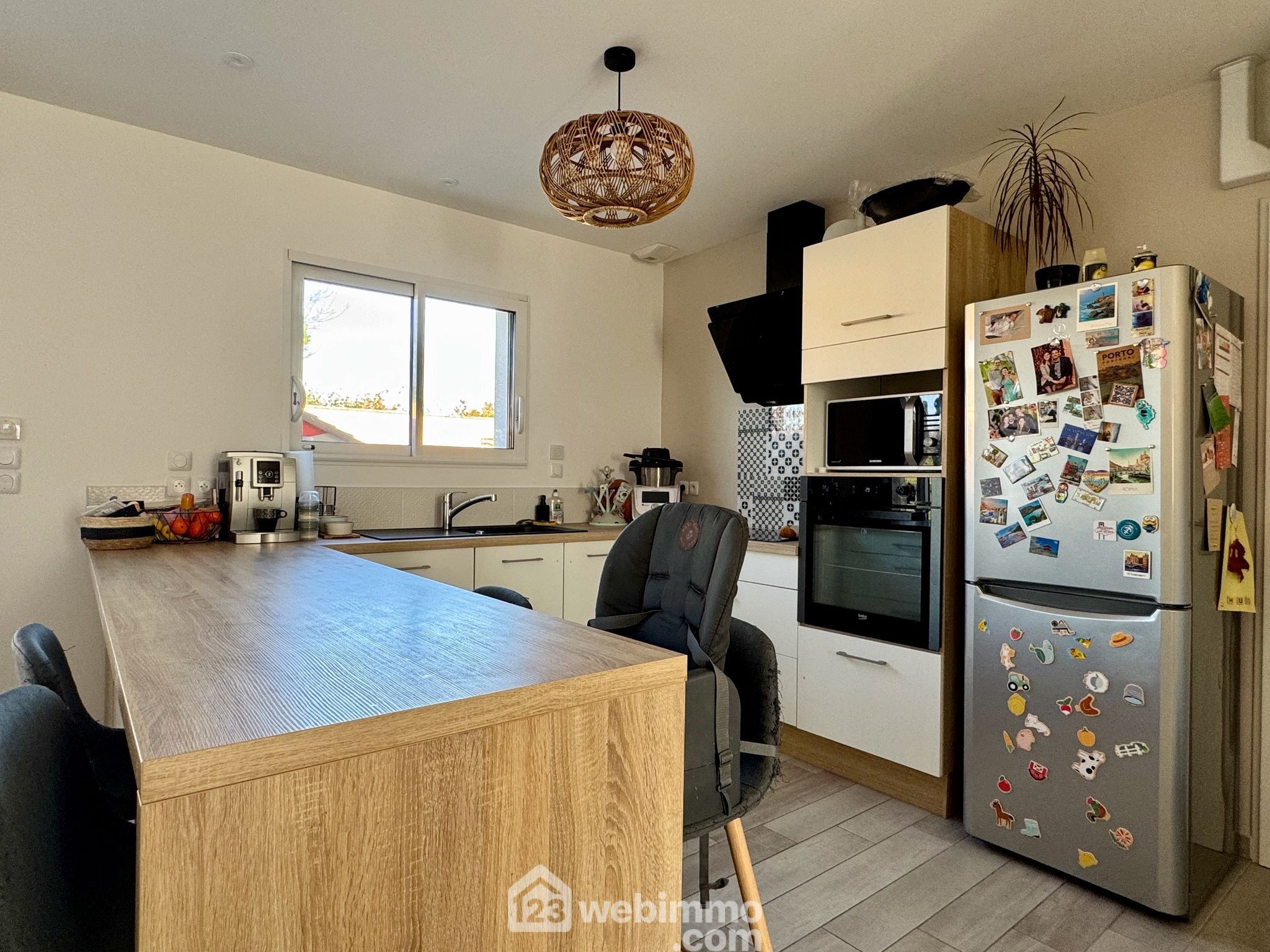 Pavillon plain-pied de 2019, 102 m2 habitables, 4 pièces, 3 chambres, cellier-chaufferie, garage, piscine, terrain de 450 m2.