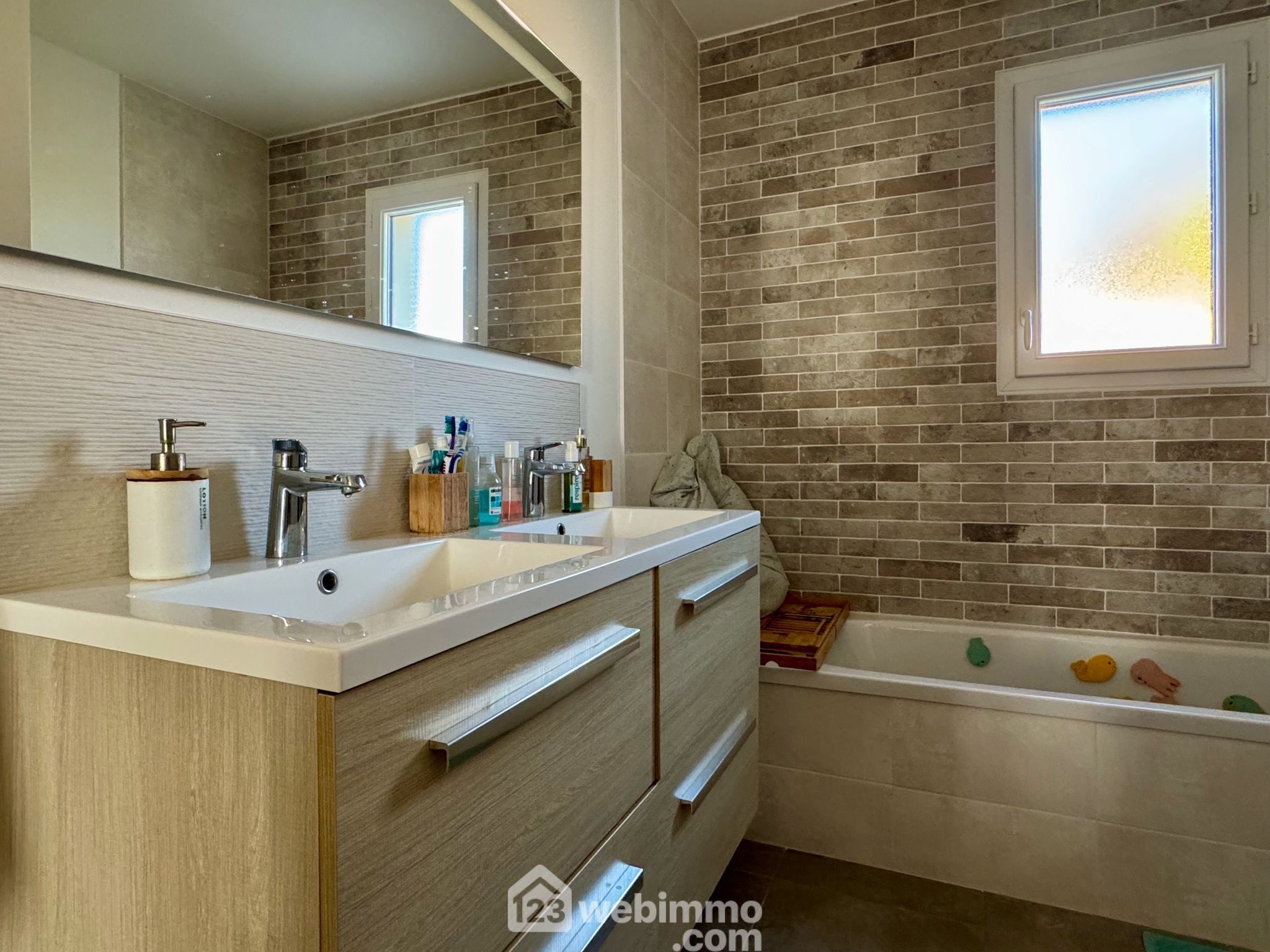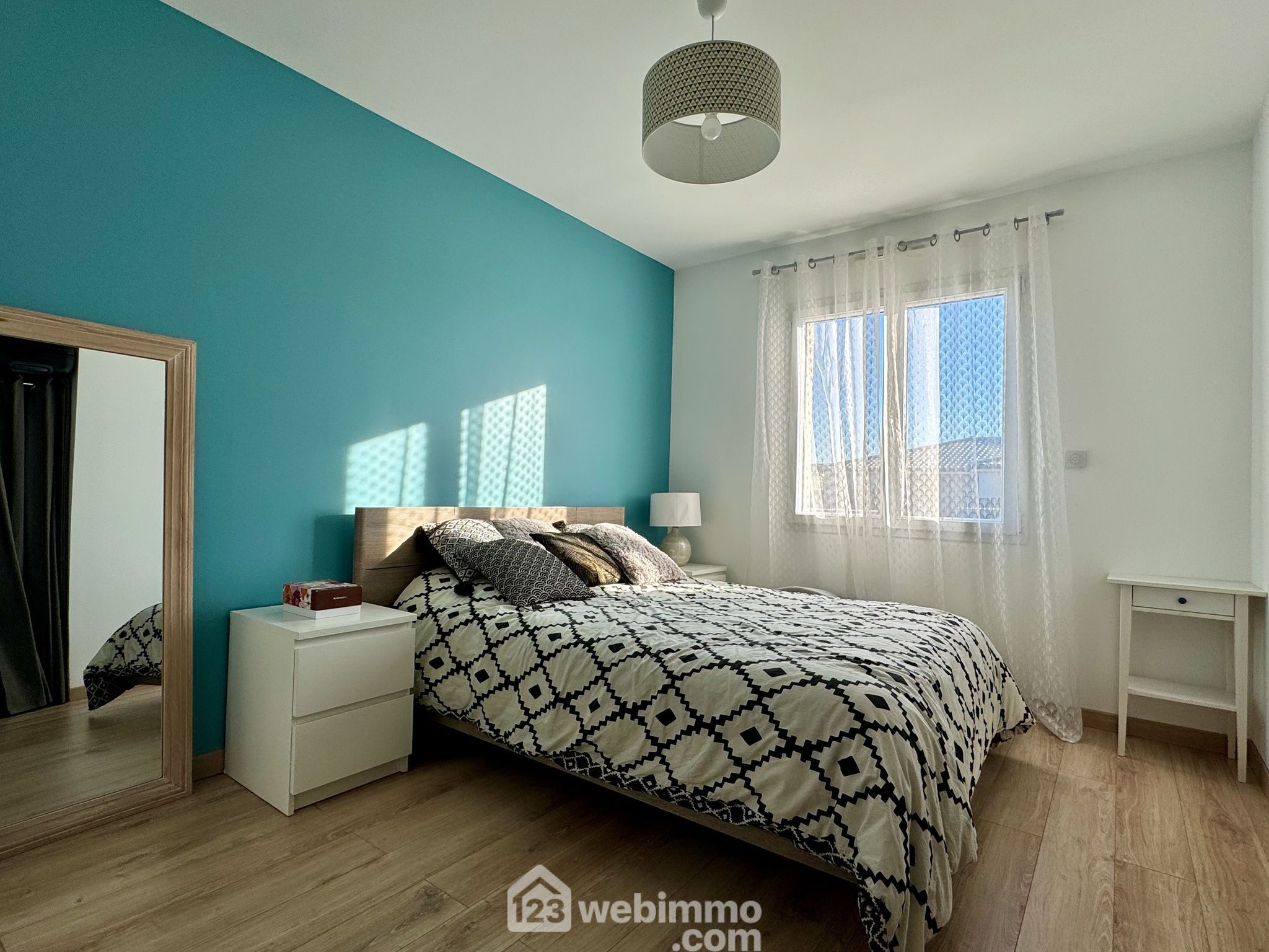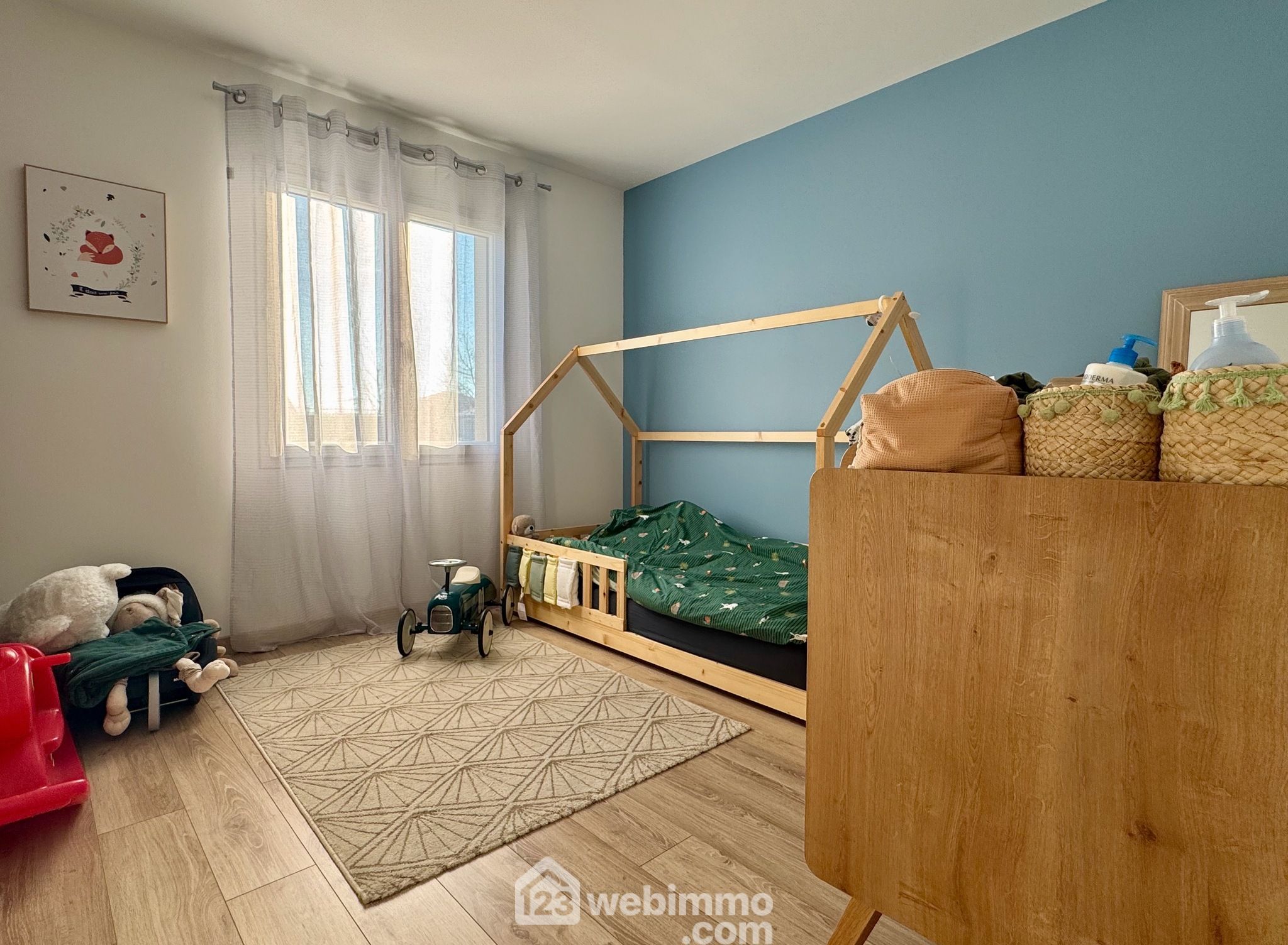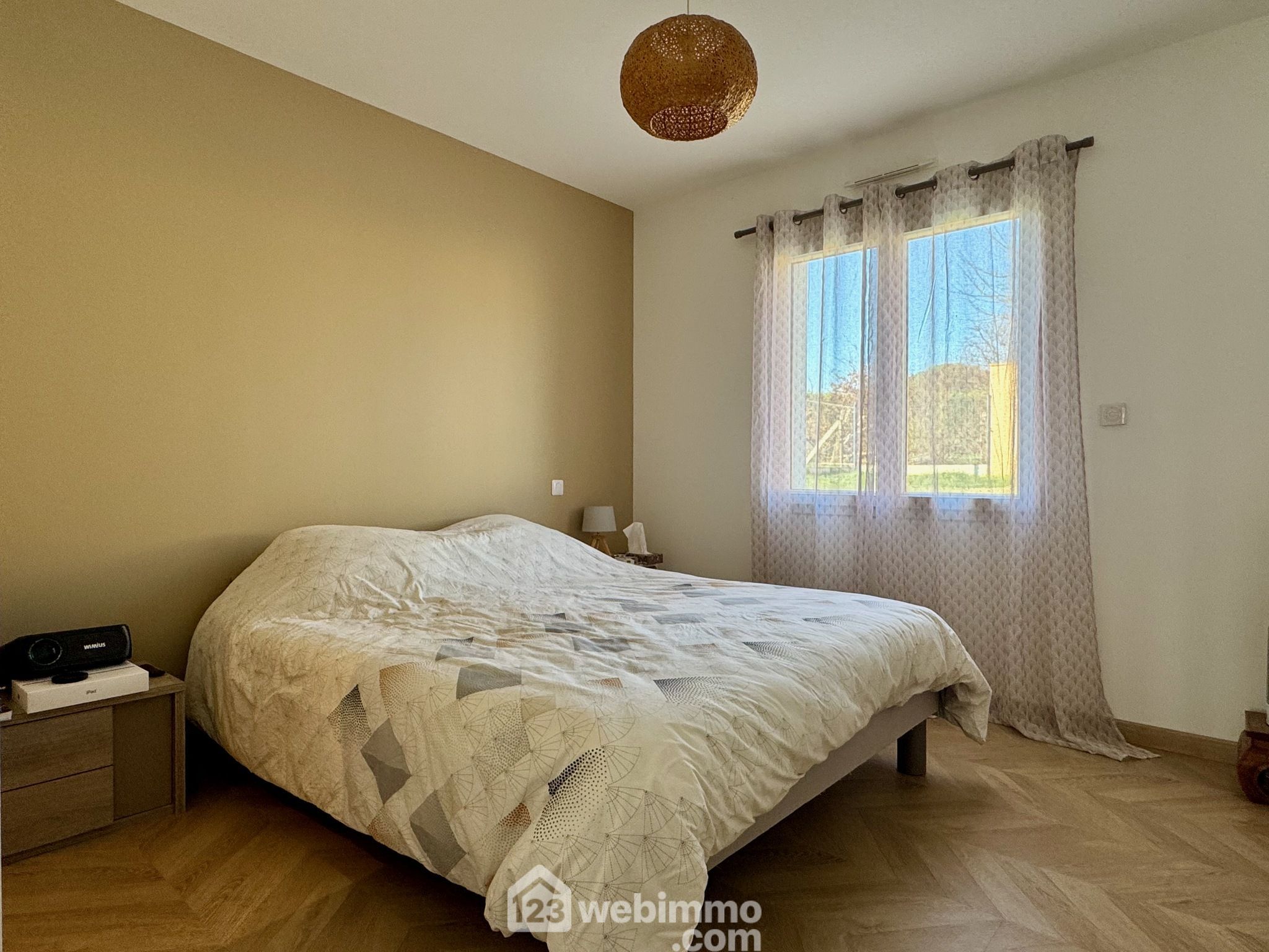 Pavillon plain-pied de 2019, 102 m2 habitables, 4 pièces, 3 chambres, cellier-chaufferie, garage, piscine, terrain de 450 m2.
