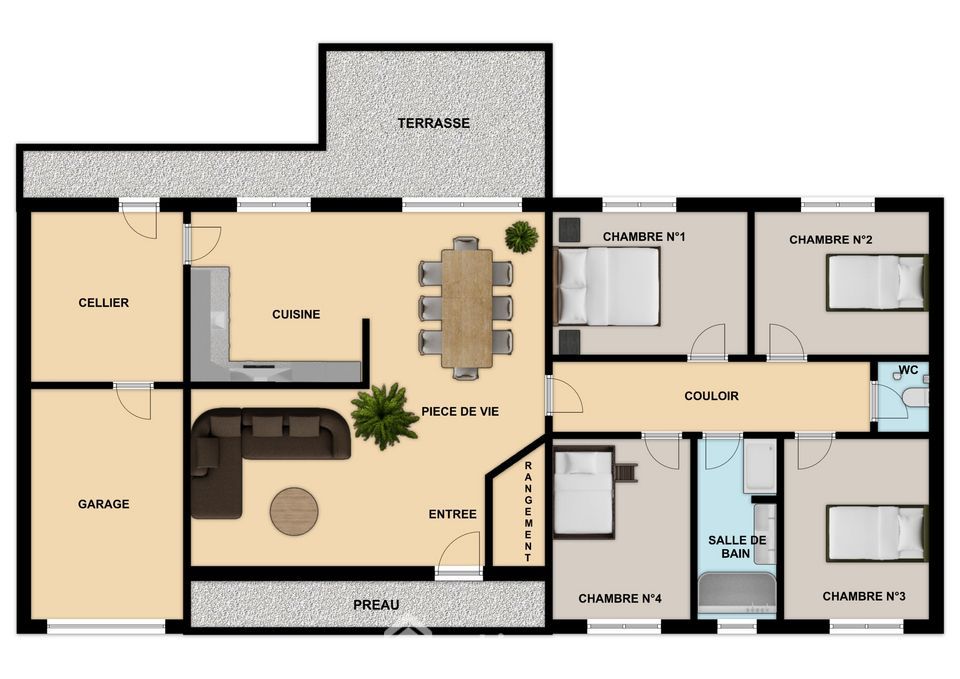 Maison de plain-pied, 104 m2 habitables, 5 pièces, 4 chambres, garage, sur terrain de 1204 m2 environ.