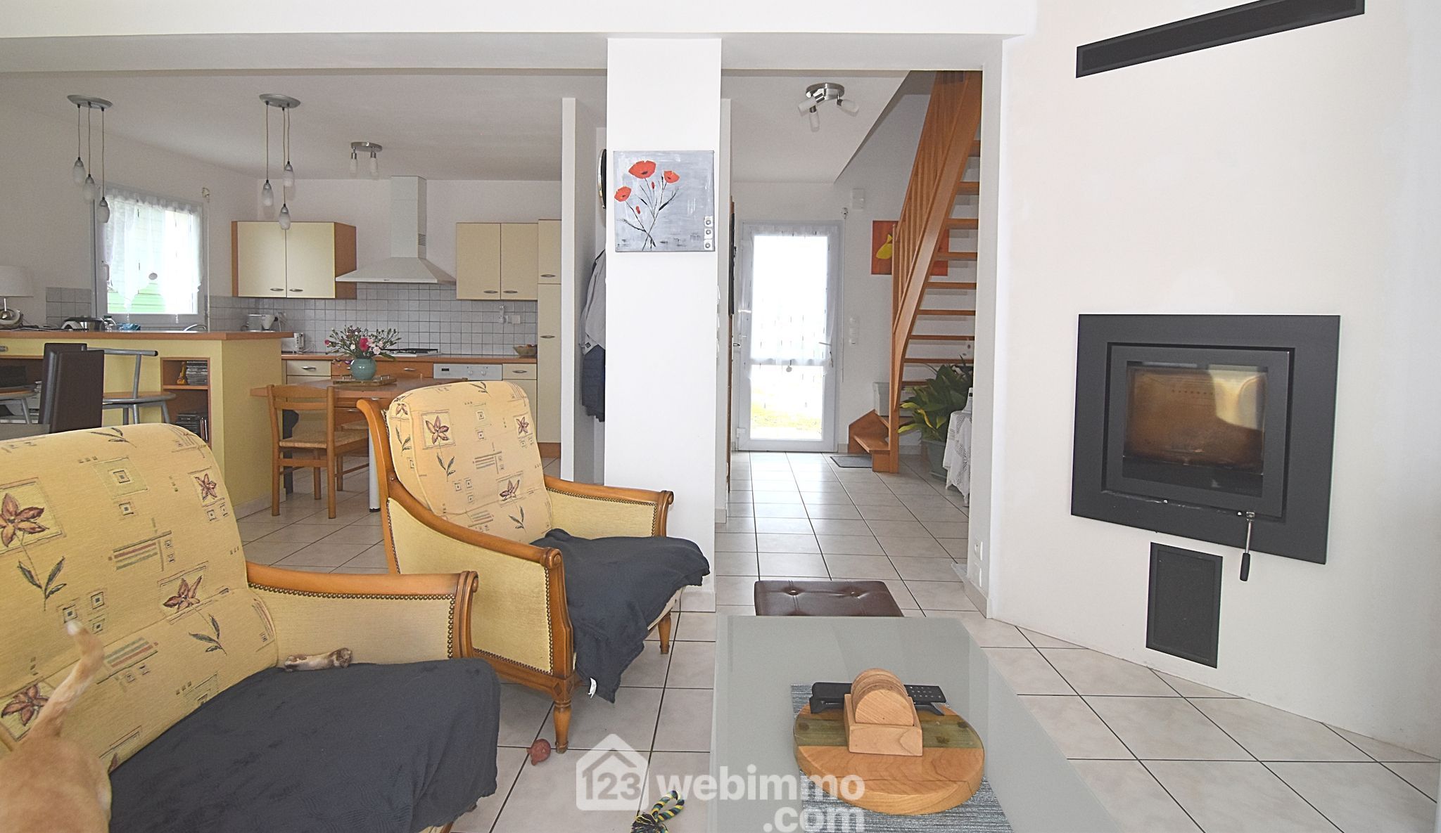Au rez-de-chaussée un palier dessert une grande pièce de vie baignée de lumière avec cheminée et accès terrasse, une cuisine ouverte aménagée et équipée, une chambre parentale avec salle d'eau privative, un WC indépendant, un accès au garage double comprenant une fosse pour l'entretien des véhicules.