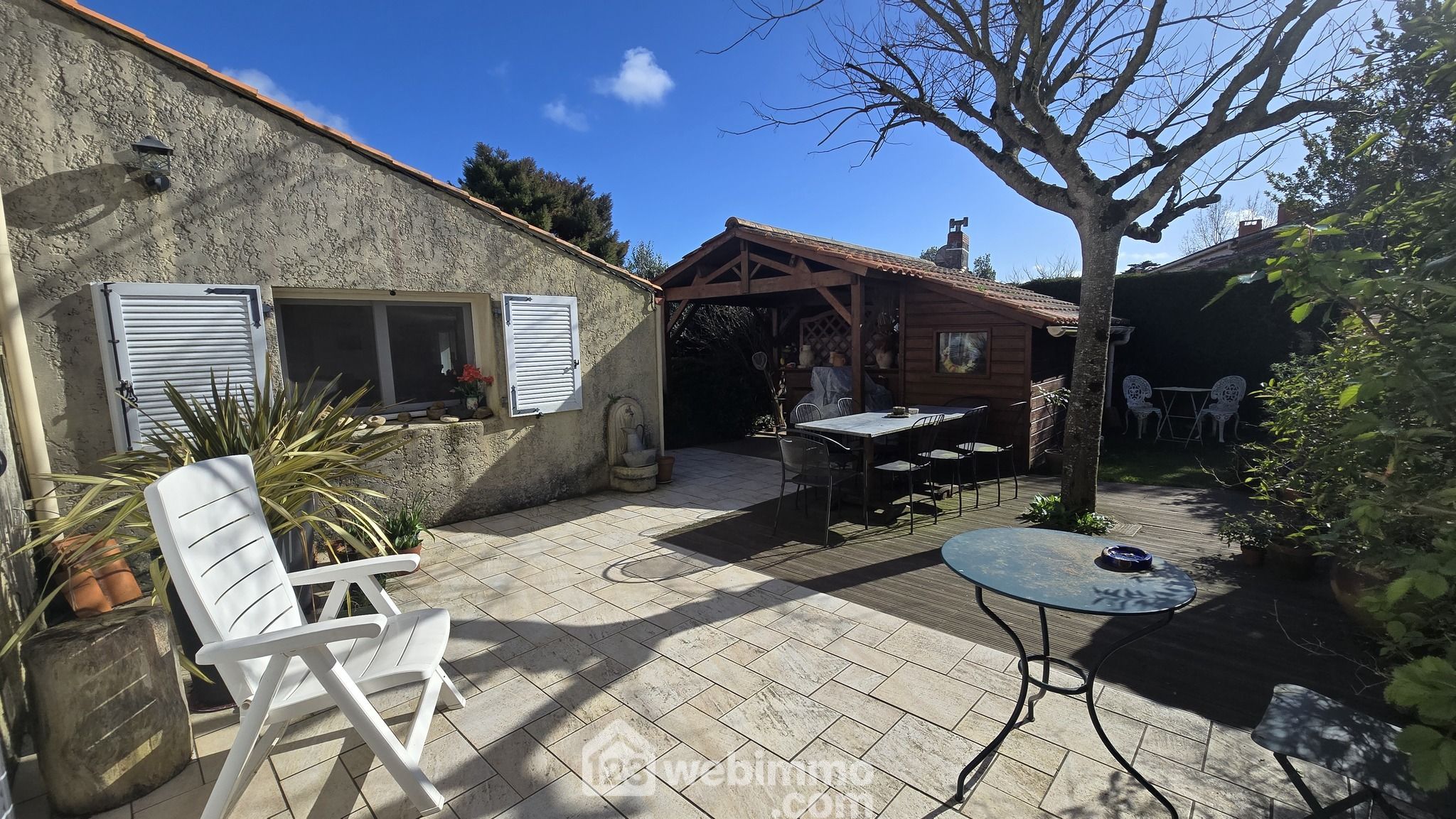 En extérieur le petit jardin arboré offre plusieurs espaces intimistes ensoleillés ou ombragés selon vos besoins. Un carport à l'entrée offre un espace de parking auto et un petit abri en bois pour vos besoins de stockage.