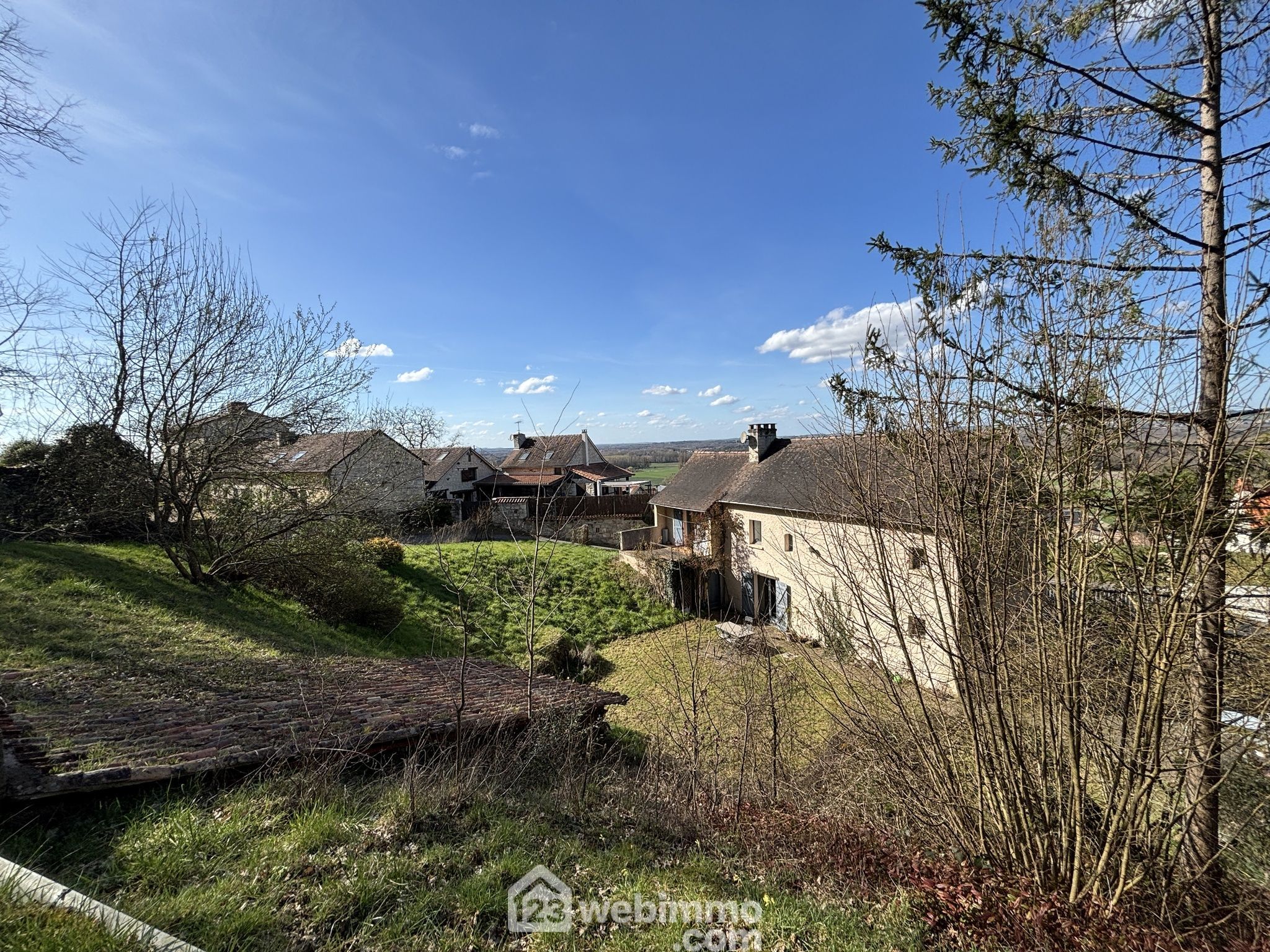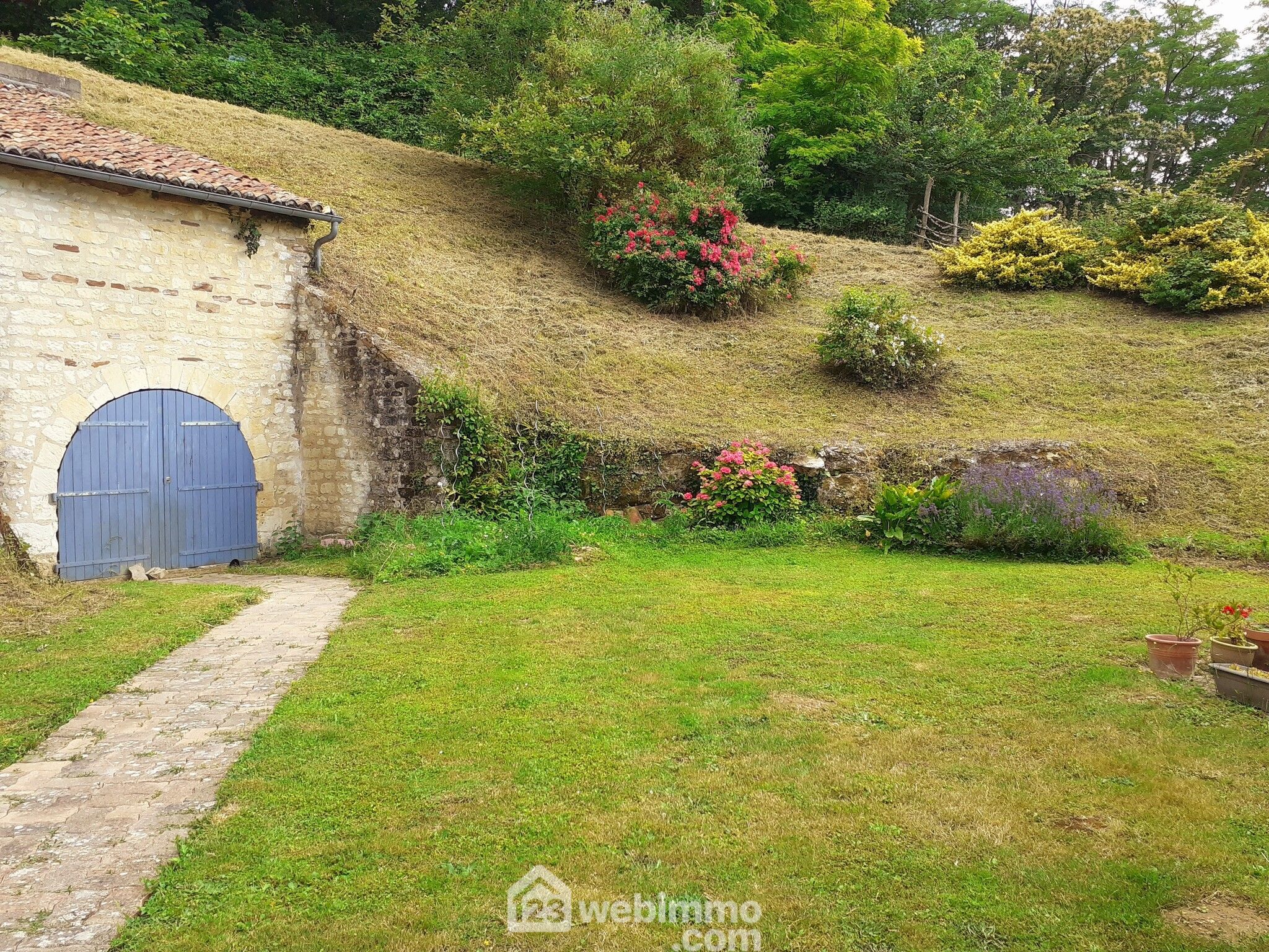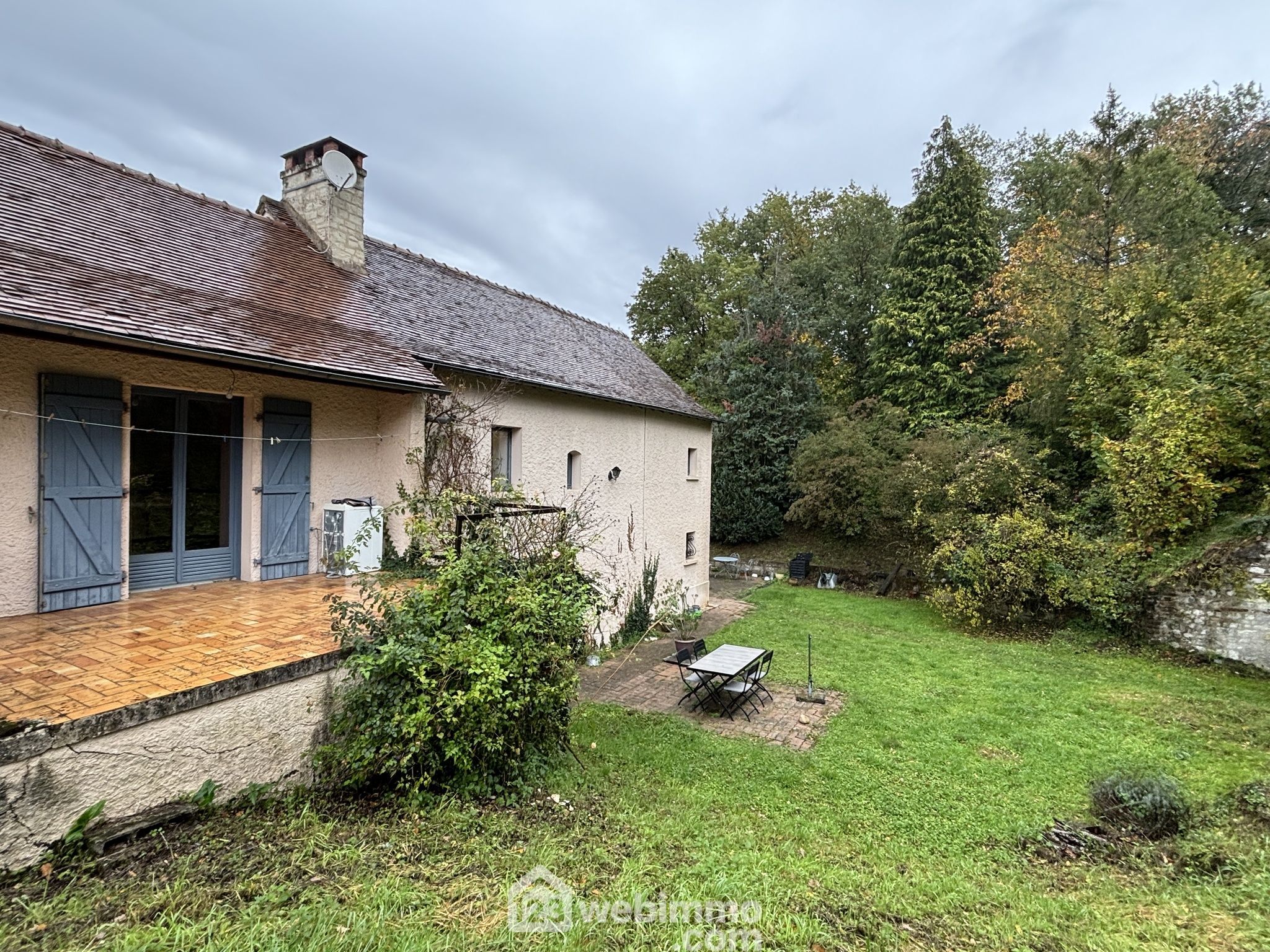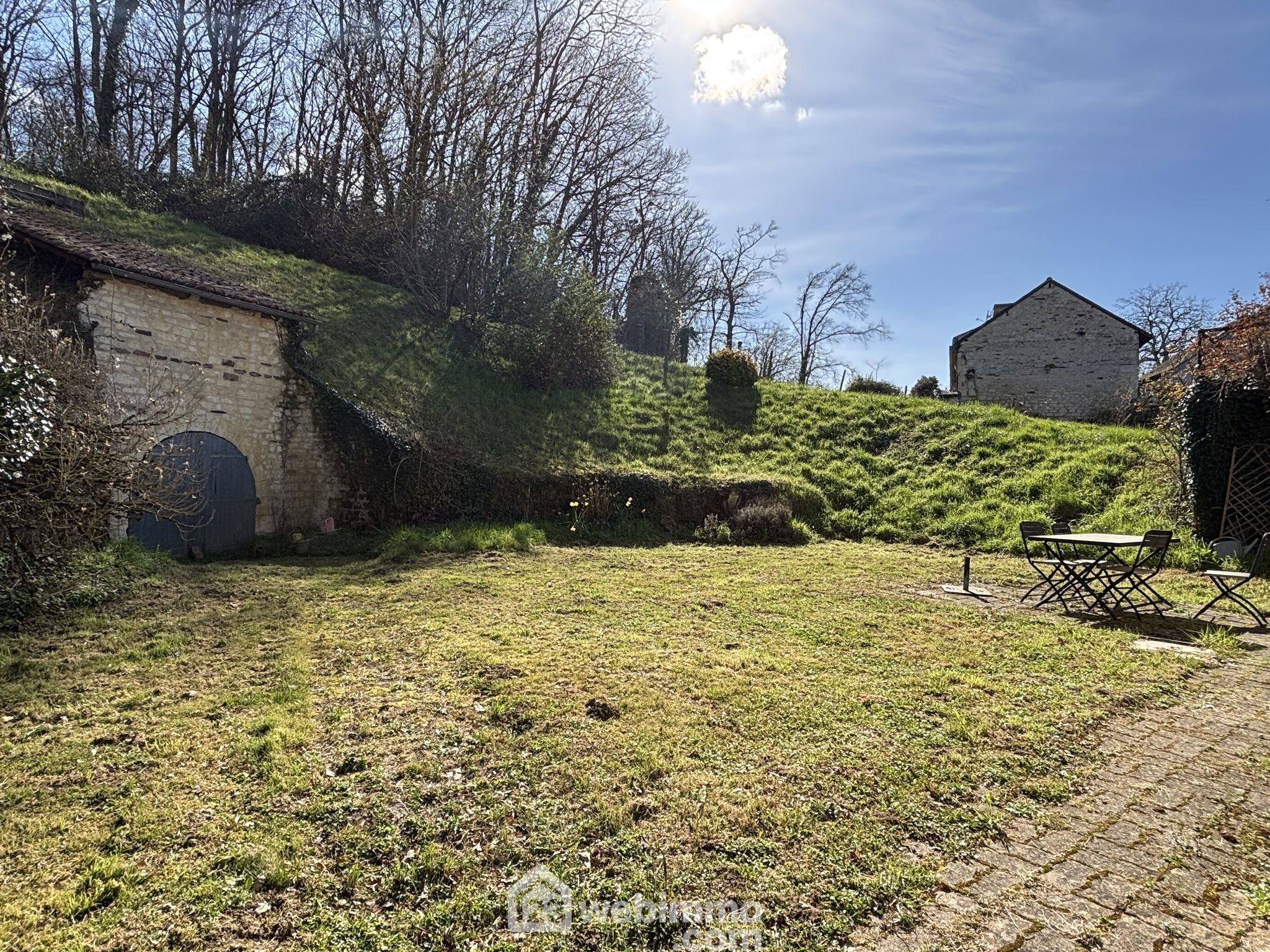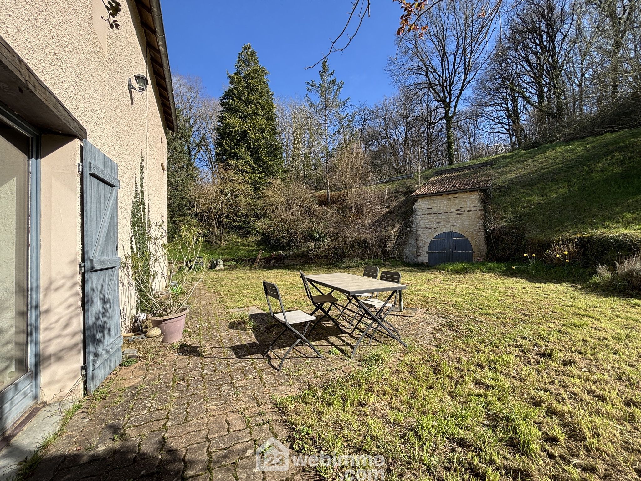 Maison en pierre avec extension des années 80, située dans un environnement verdoyant et calme.